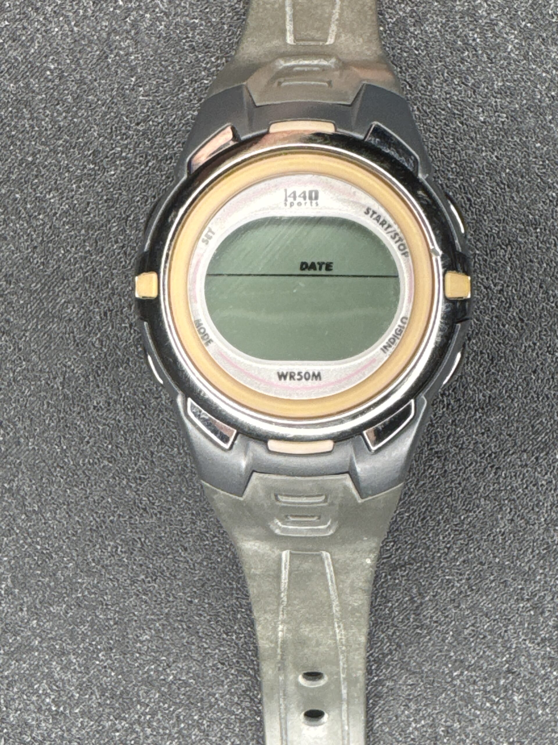 The 1440 Sports T5K683 is a digital watch designed for everyday use. It features a durable plastic case and strap, with a simple digital display that shows the date and time. The watch is water-resistant up to 50 meters, making it suitable for light water activities. The condition shows signs of wear, with noticeable scratches on the case and strap. The back of the watch indicates a CR2016 battery and confirms the water resistance.
