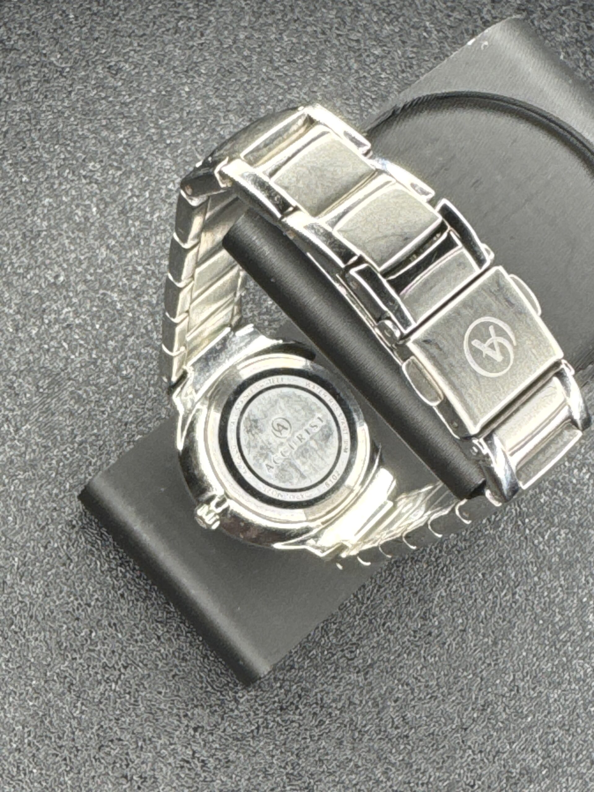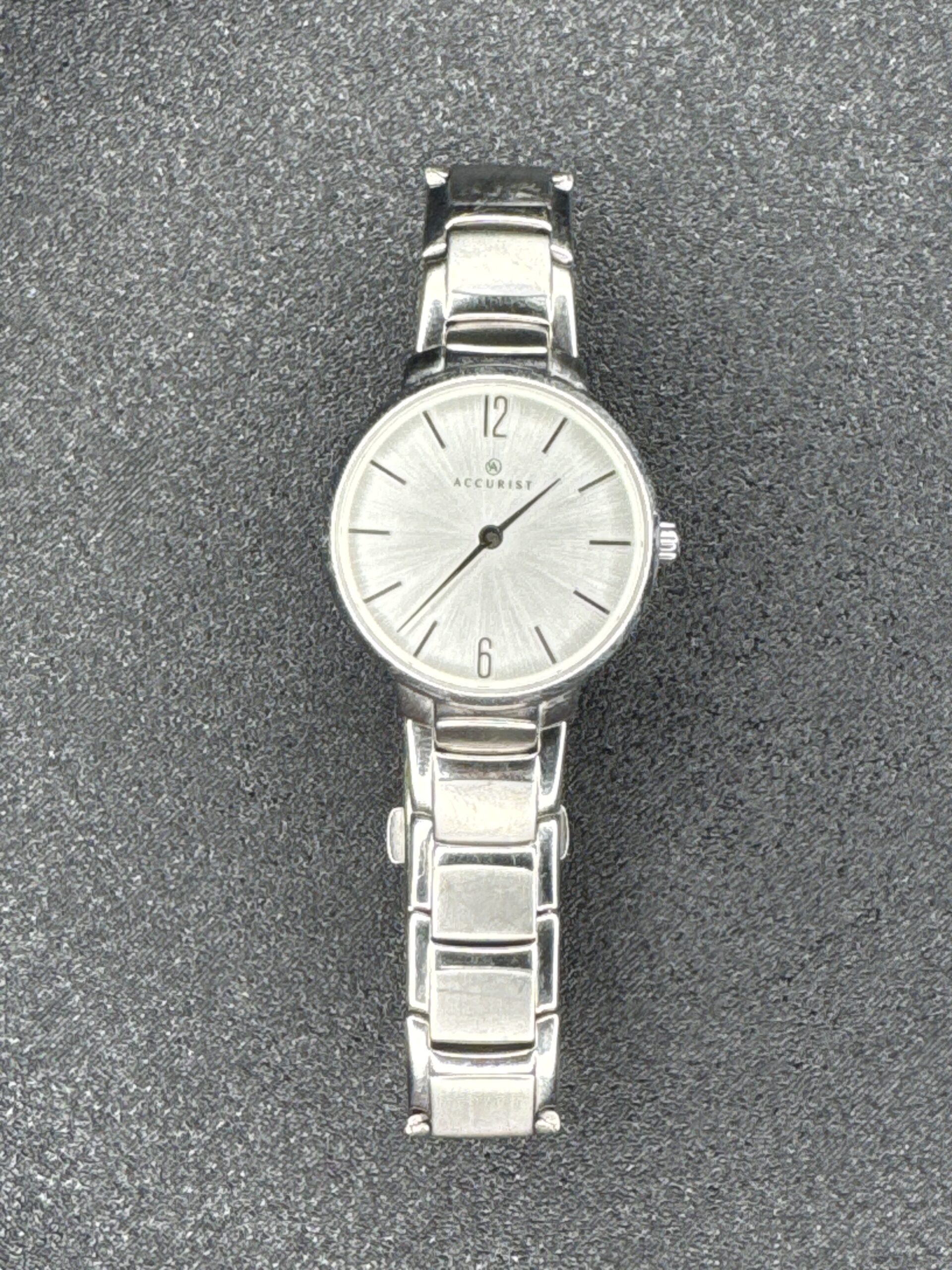 The Accurist Quartz Silver Women’s Watch 8102 features a minimalist silver dial with simple hour markers and a sleek, polished stainless steel bracelet. The watch has a classic round case and a quartz movement, ensuring accurate timekeeping. The back of the watch is marked with the Accurist logo and model information. The bracelet shows signs of wear, including minor scratches, but overall the watch is in good condition.