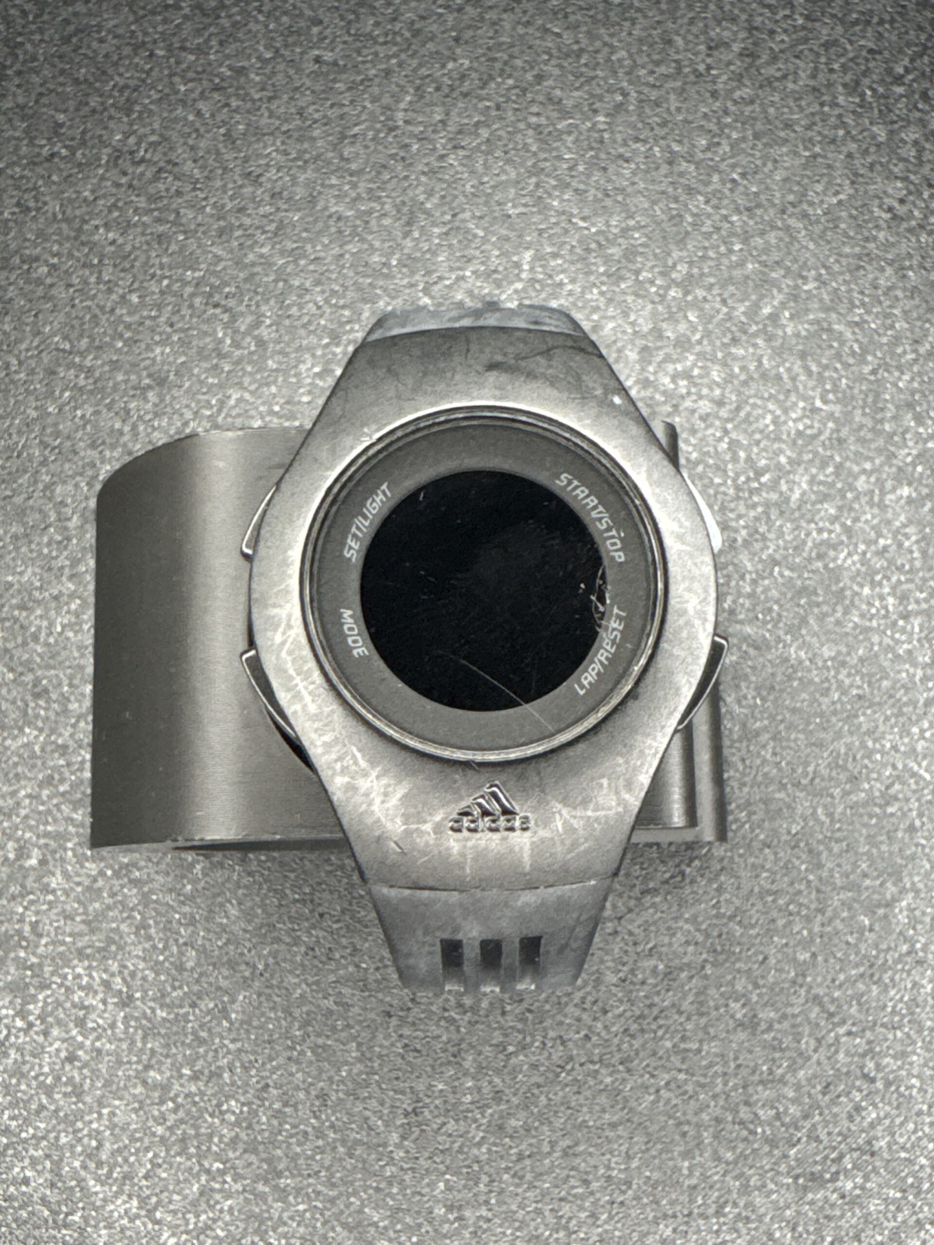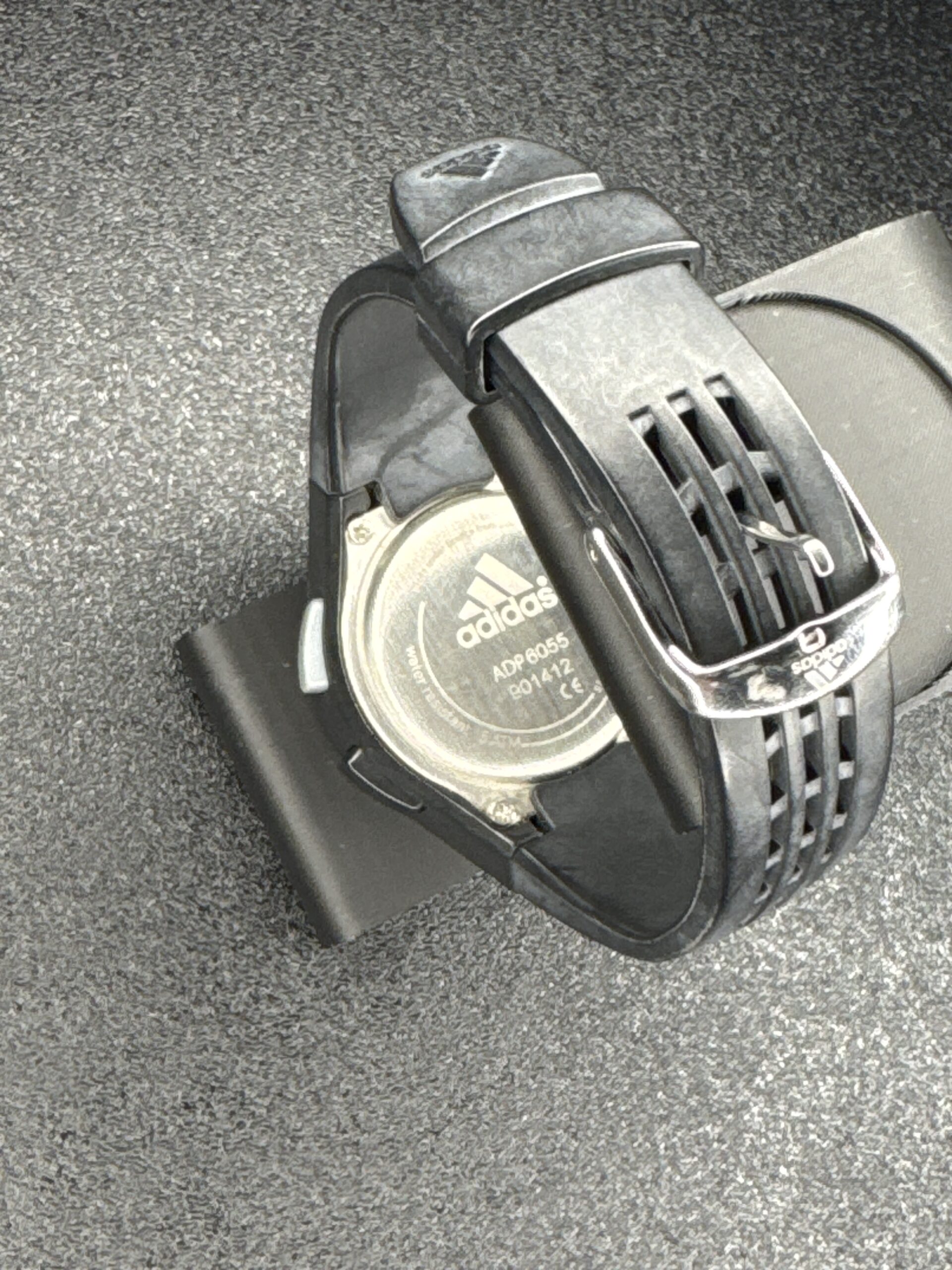 The Adidas Digital Men’s Watch ADP6055 features a sporty design with a black resin case and strap. The digital display includes functions such as a stopwatch, lap timer, and backlight. The Adidas logo is prominently displayed on the front. The watch is water-resistant up to 50 meters, making it suitable for everyday use and light water activities.