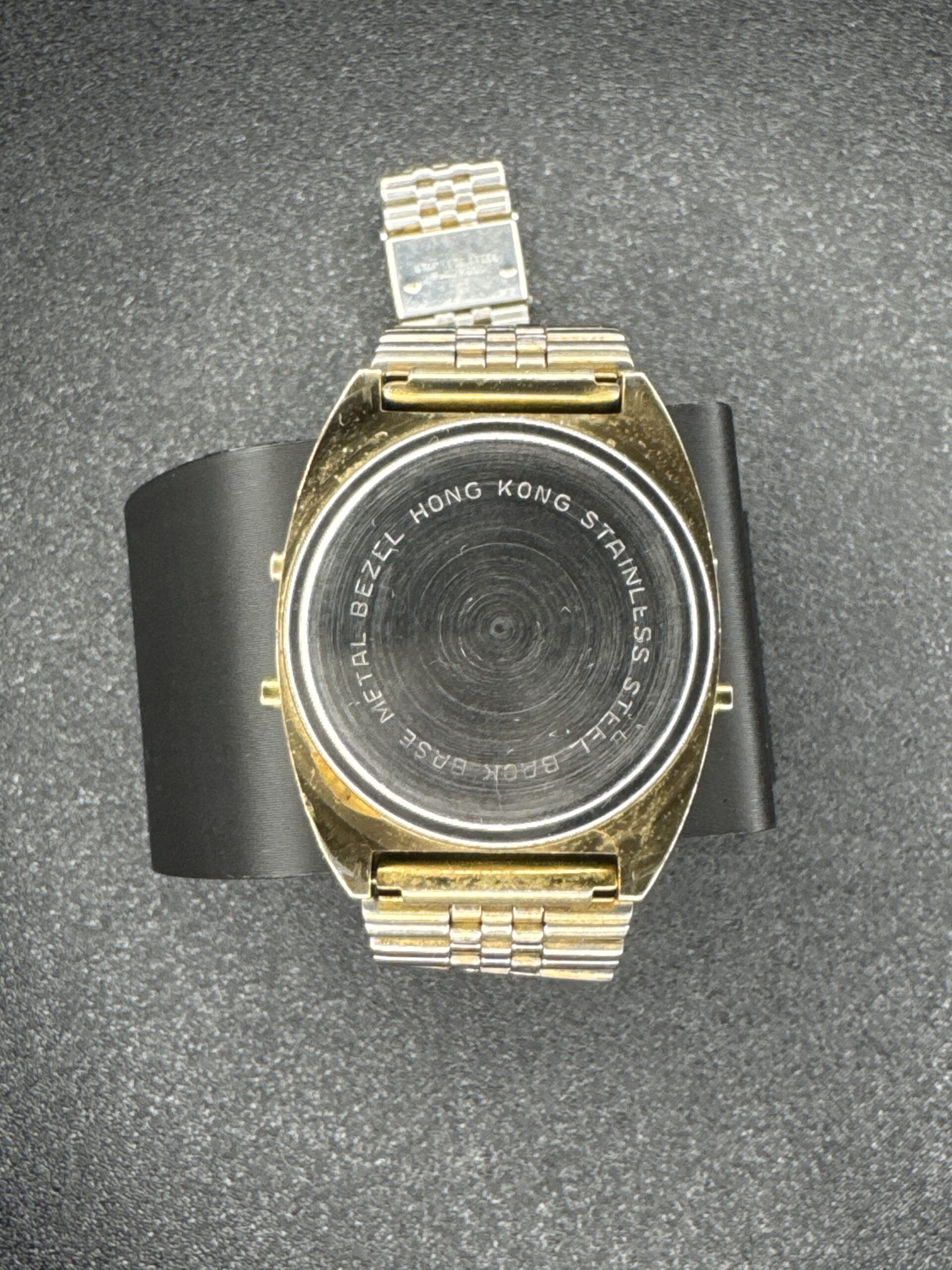 The Advance Chronograph Men’s Digital Watch features a vintage LCD display with a gold-tone metal bezel. It includes functions such as a chronograph, date, and day display. The watch is powered by a quartz movement. The front shows some signs of wear, particularly on the display, which may affect visibility. The back is marked with ‘Hong Kong Stainless Steel Back Base Metal Bezel’, indicating its construction materials. The bracelet is a matching gold-tone metal with a fold-over clasp.