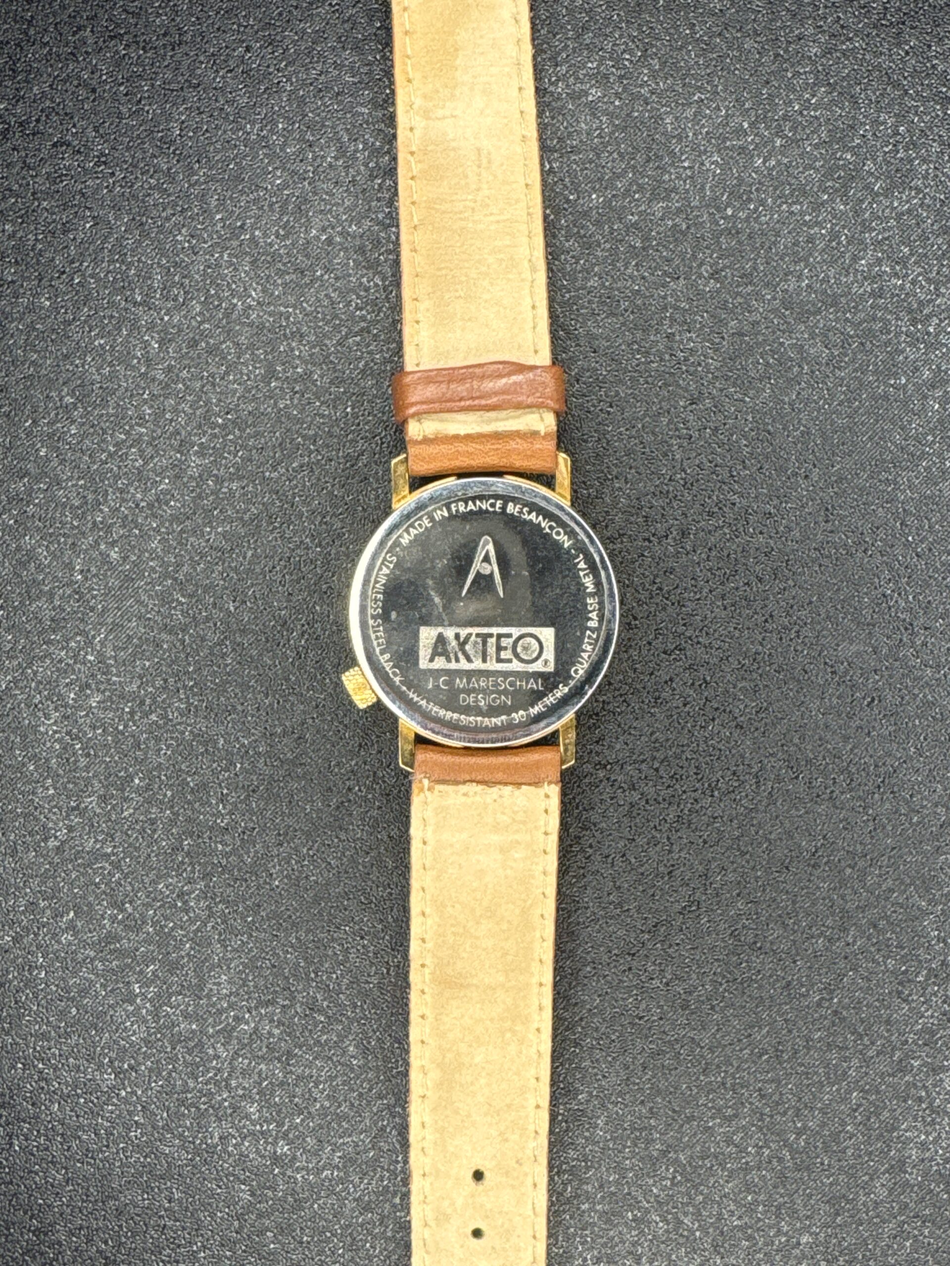 The AKTEO Basketball Men’s Watch features a unique basketball-themed dial with a basketball court design and custom hands resembling a basketball and hoop. The watch has a gold-tone case and a brown leather strap with a stitched pattern. The case back is engraved with ‘AKTEO’ and ‘J.C. Mareschal Design’, indicating its designer. It is water-resistant up to 30 meters.