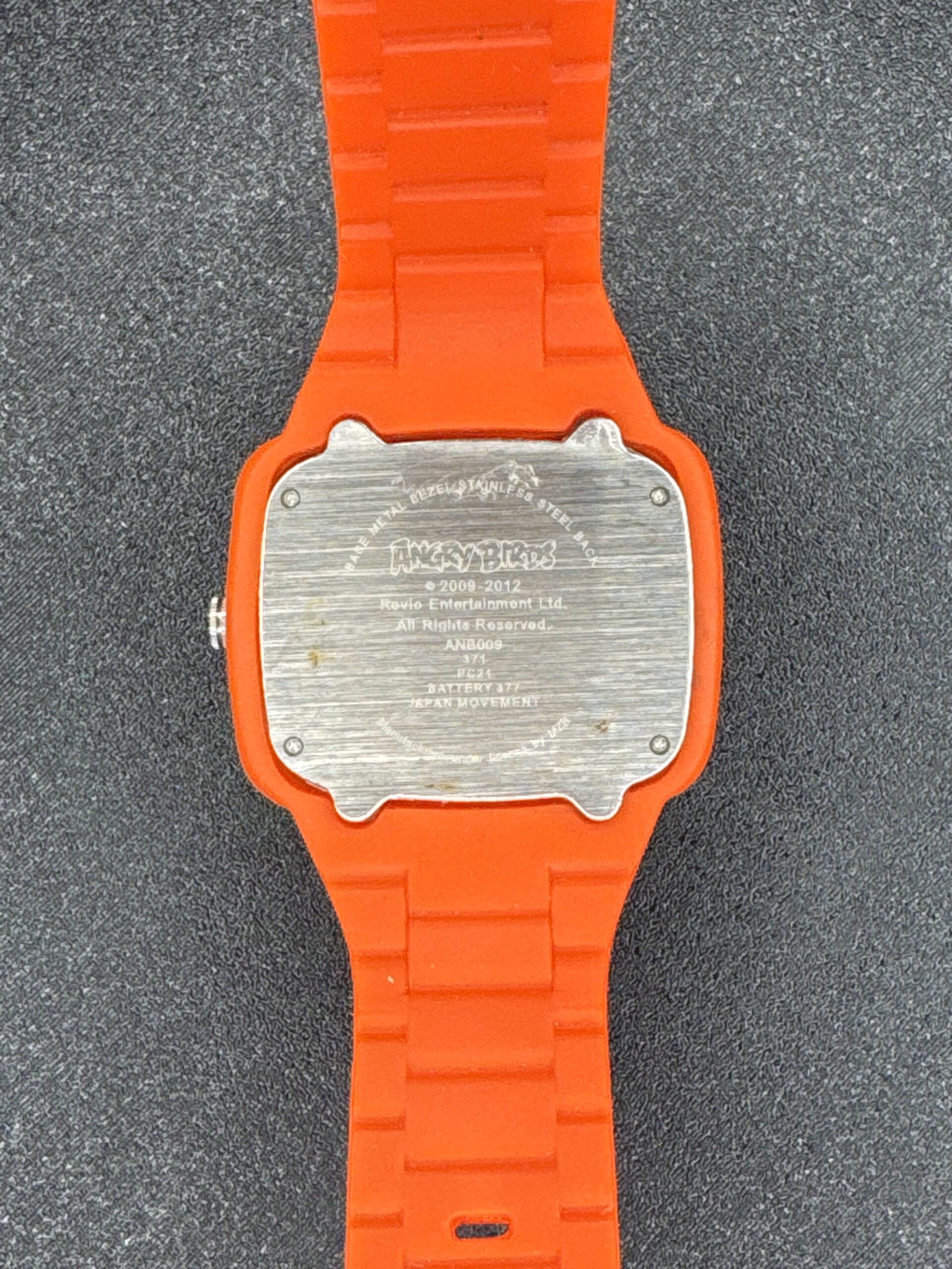 This is a playful and vibrant Angry Birds-themed unisex watch featuring a bold red design. The watch showcases a prominent Angry Birds character on the dial, appealing to fans of the popular game. The case and strap are made of durable plastic, providing a lightweight and comfortable fit. The back of the watch is stainless steel, engraved with the Angry Birds logo and details, including the model number 371 PC21 and Japanese movement indication.