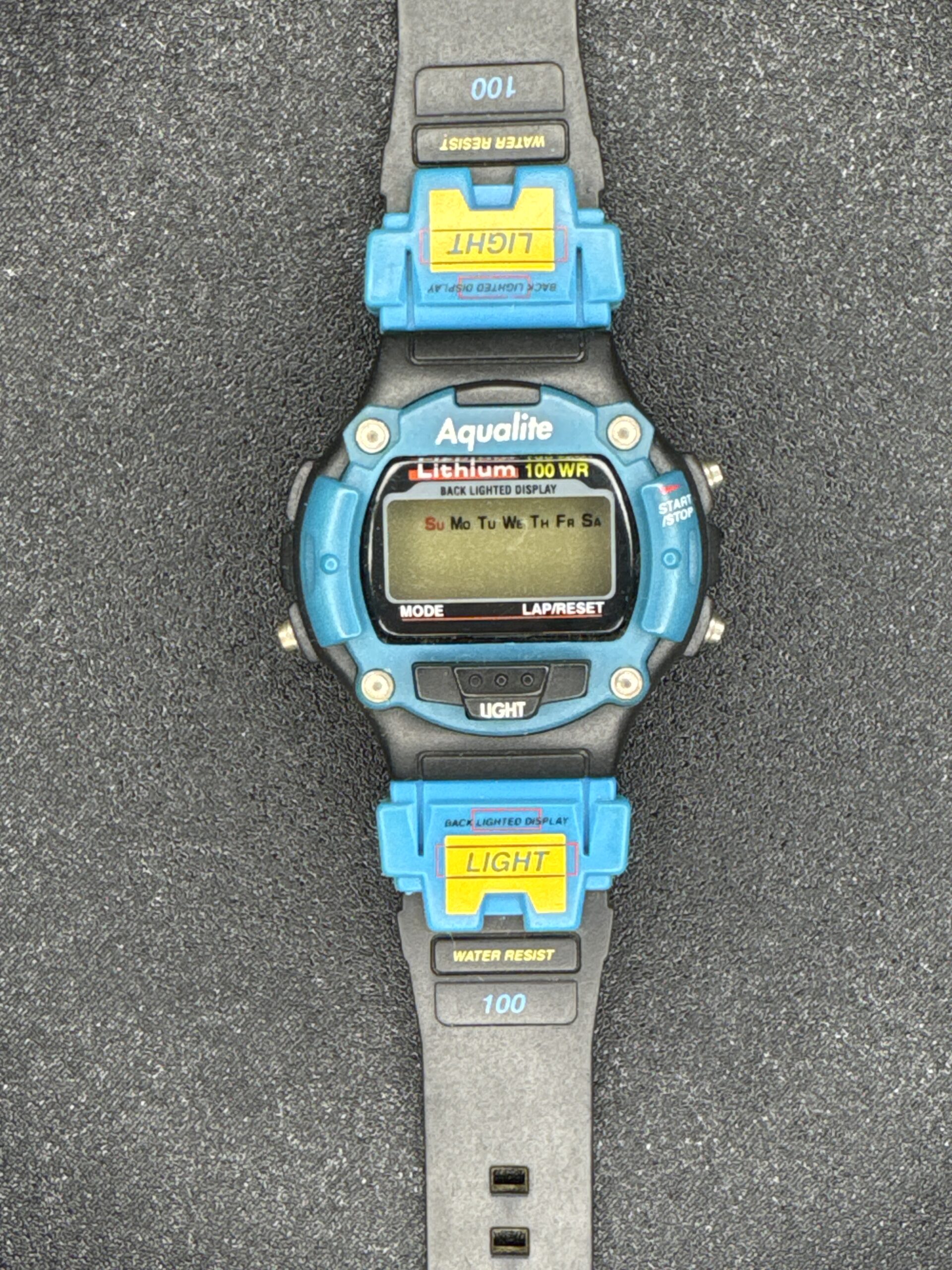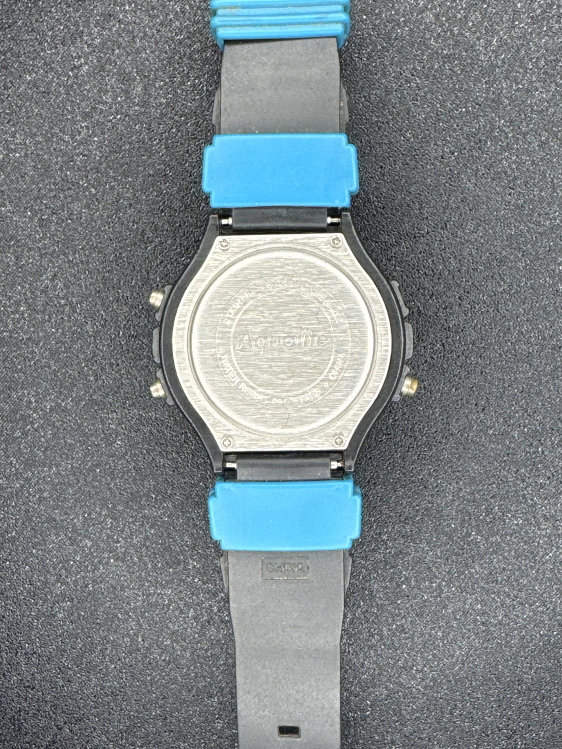 The Aqualite Digital Unisex Quartz Watch features a robust design with a black and blue color scheme. It includes a digital display with backlight functionality, day of the week indicator, and stopwatch capabilities. The watch is water-resistant up to 100 meters, making it suitable for various water activities. The strap is made of durable rubber, ensuring comfort and longevity. The back of the watch is stainless steel, providing additional durability.
