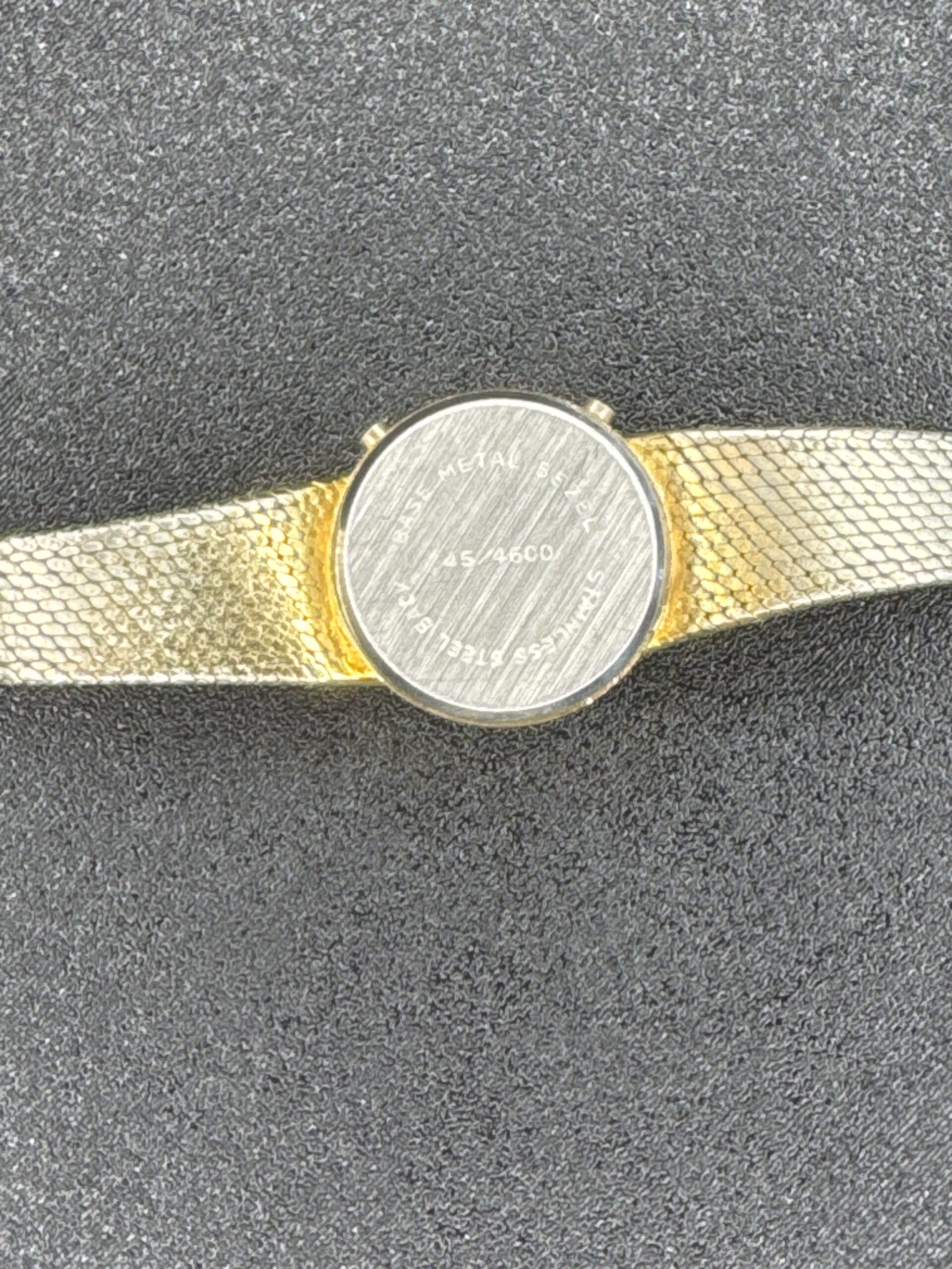 This Armitron digital watch features a small, round case with a gold-tone finish and a digital display. The watch has a unique mesh bracelet that complements its elegant design. The front of the watch displays the Armitron logo above the digital screen. The back of the watch is marked with ‘Base Metal Bezel’ and ‘Stainless Steel Back’, along with the model number 45/4600. The watch is in good condition with minor signs of wear, typical for vintage pieces.