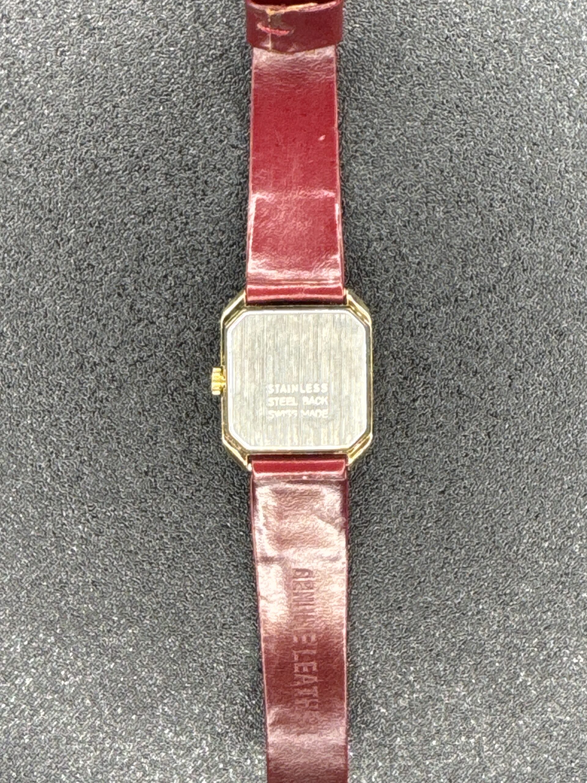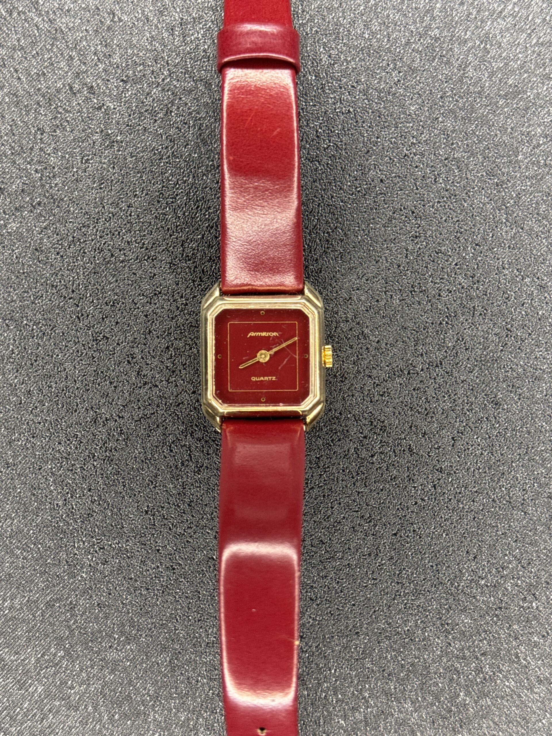 This Armitron women’s watch features a striking two-tone design with a red dial and gold-tone accents. The rectangular case is complemented by a matching red leather strap. The watch has a quartz movement, ensuring accurate timekeeping. The back of the case is stainless steel, indicating durability. The strap shows some signs of wear, including minor scratches and creases.