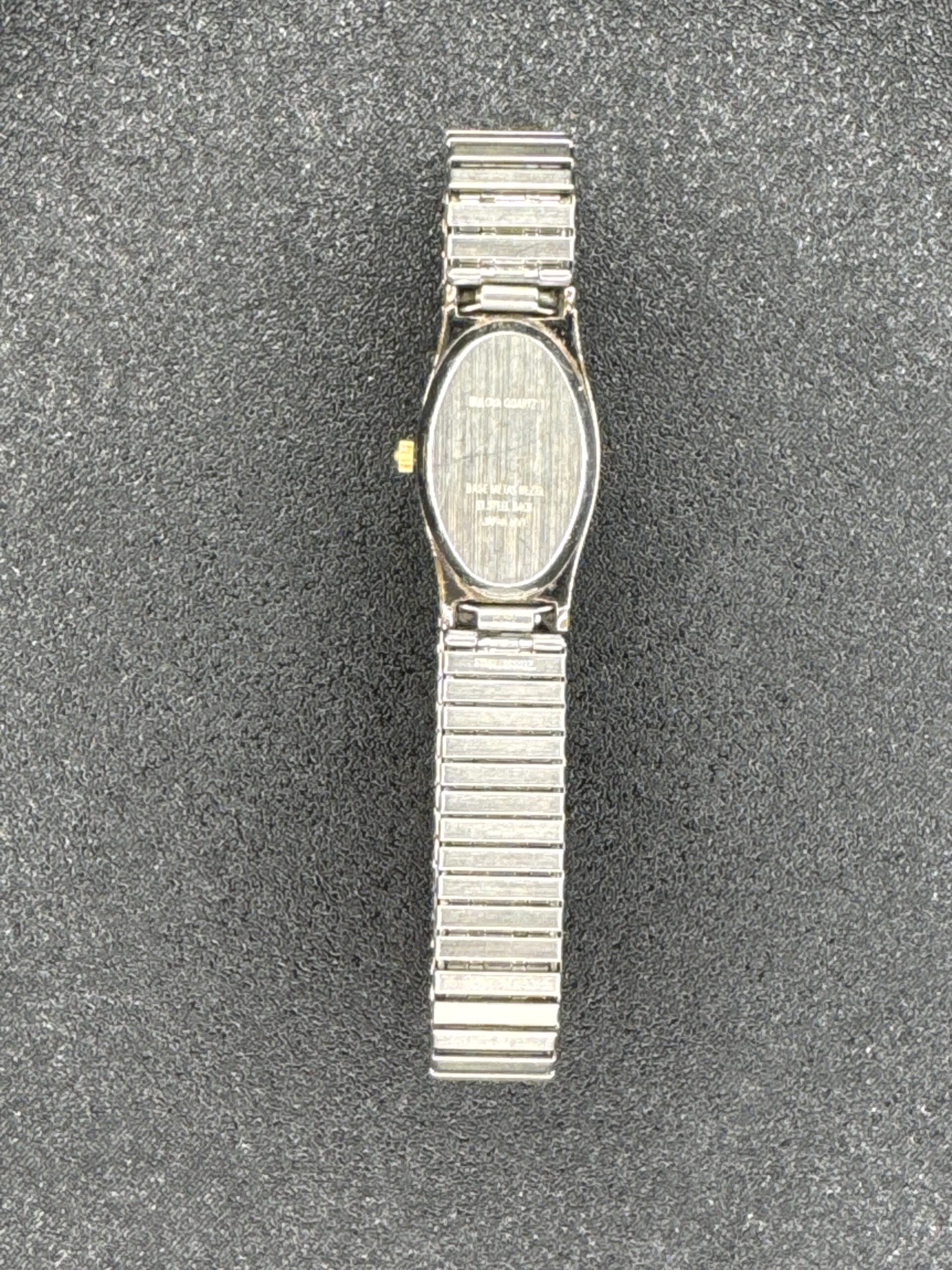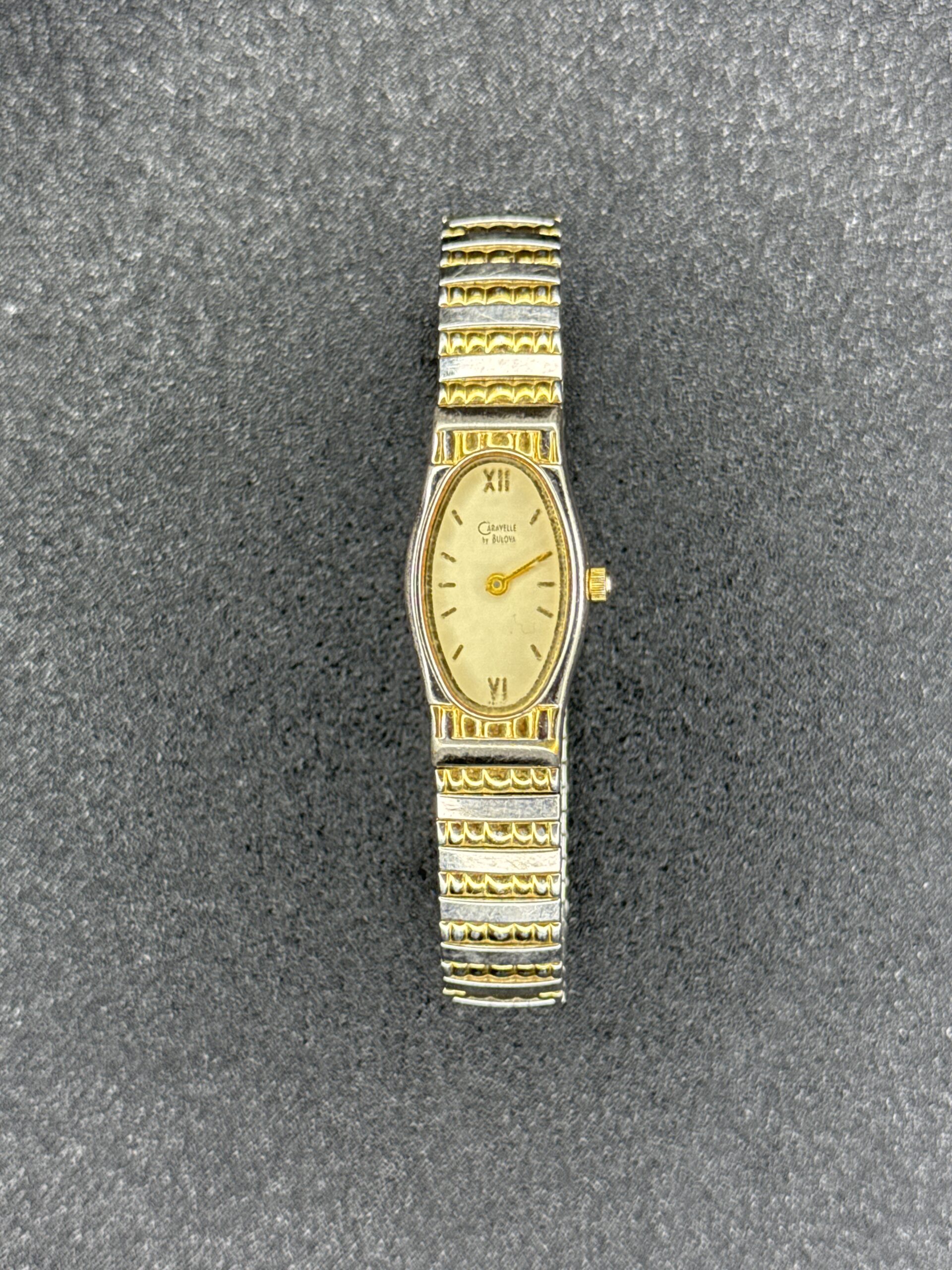 This Caravelle by Bulova quartz women’s watch features a classic oval-shaped gold-tone dial with minimalist Roman numeral hour markers at the 12 and 6 positions. The watch has a two-tone metal bracelet with a textured design, adding a touch of elegance. The back of the watch is stainless steel, indicating durability and resistance to wear. The overall condition shows signs of light wear, with minor scratches on the bracelet and case back.