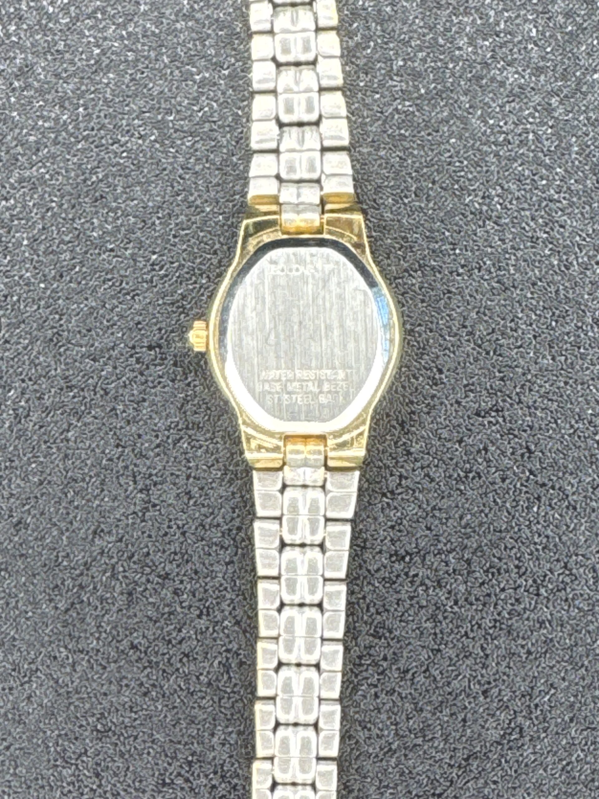 This is a Caravelle Quartz women’s watch by Bulova, featuring a gold-tone case and bracelet. The dial is minimalist with a single diamond accent at the 12 o’clock position, accompanied by gold-tone hands. The watch has a classic and elegant design suitable for formal occasions. The back of the watch indicates water resistance and specifies the use of base metal bezel and stainless steel back.