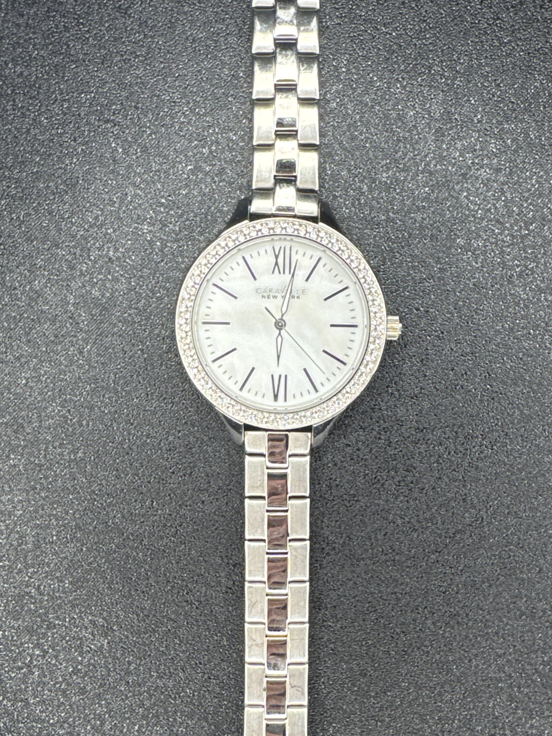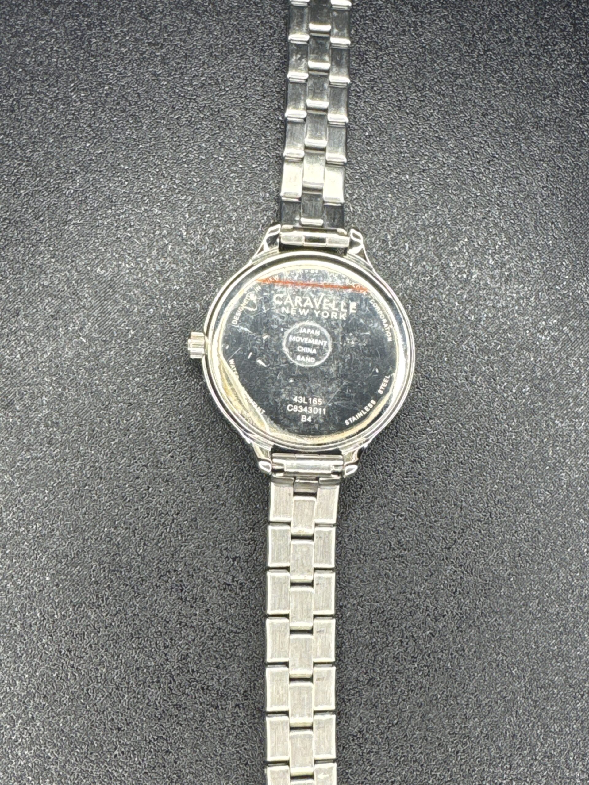 The Caravelle Quartz 43L165 is an elegant women’s watch featuring a silver-tone stainless steel case and bracelet. The watch has a round face with a white dial, Roman numeral hour markers, and a crystal-accented bezel, adding a touch of sophistication. The back of the watch indicates a Japanese movement and assembly in China, with the model number 43L165 engraved. The watch shows signs of wear, with noticeable scratches on the case back.