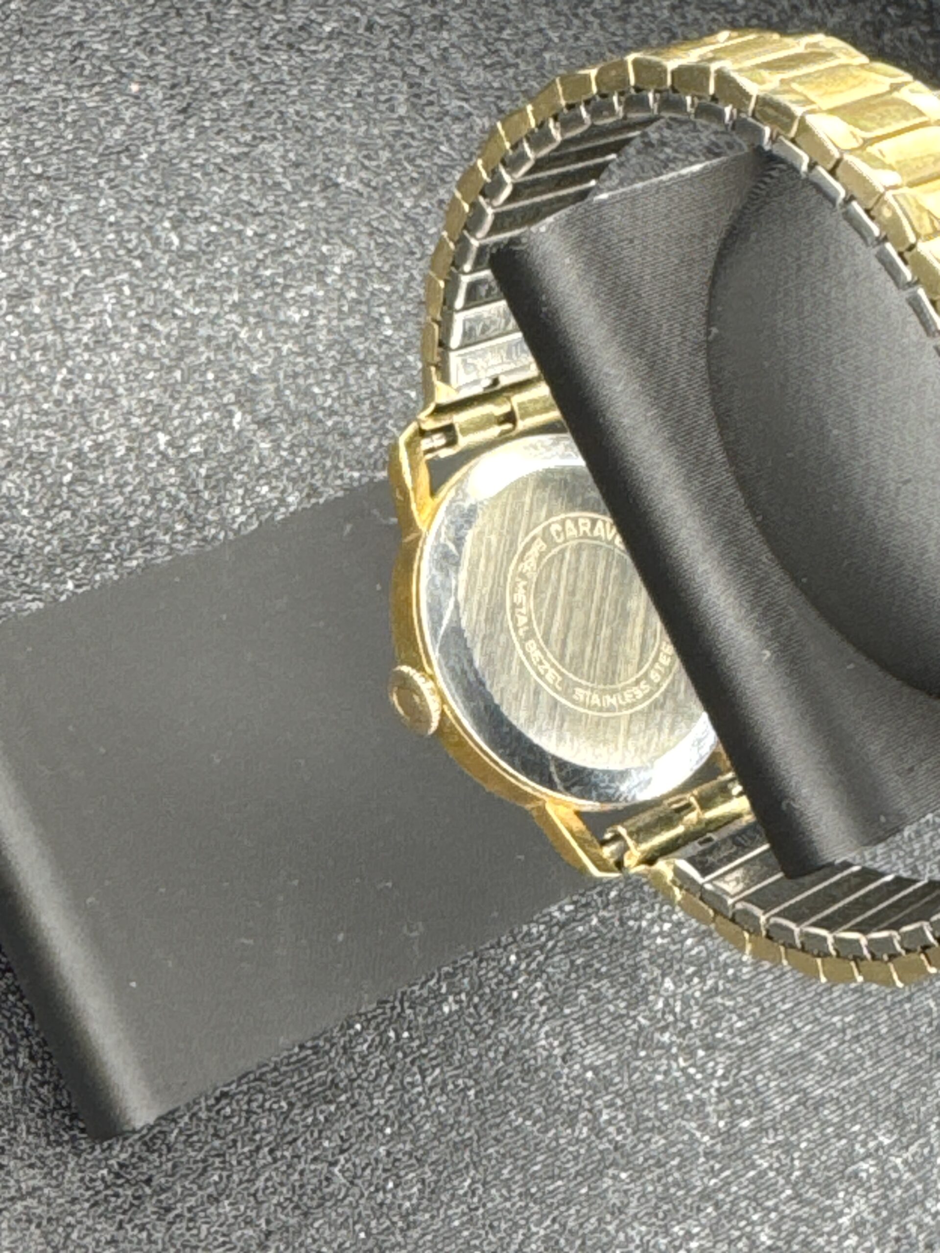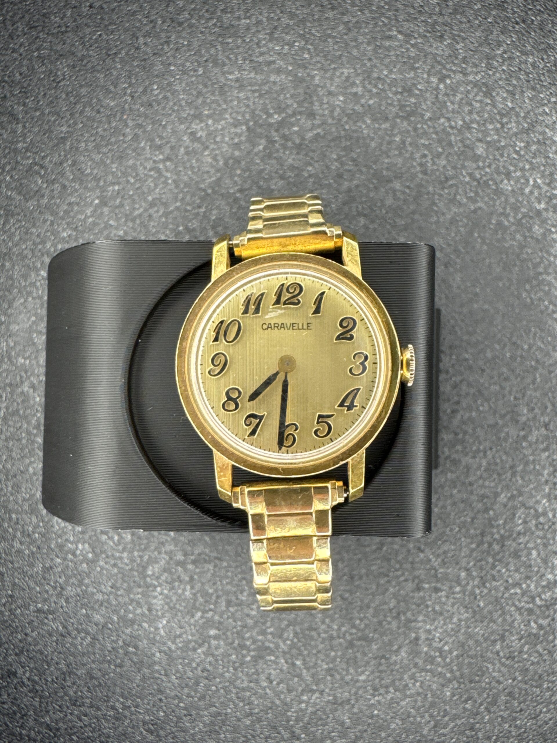 This is a Caravelle women’s quartz watch featuring a gold-tone case and bracelet. The dial is gold with bold, black Arabic numerals and matching hands. The watch has a classic, elegant design suitable for everyday wear. The back of the watch is marked with ‘Caravelle’ and ‘Base Metal Bezel Stainless Steel Back,’ indicating a mix of materials for durability and style.