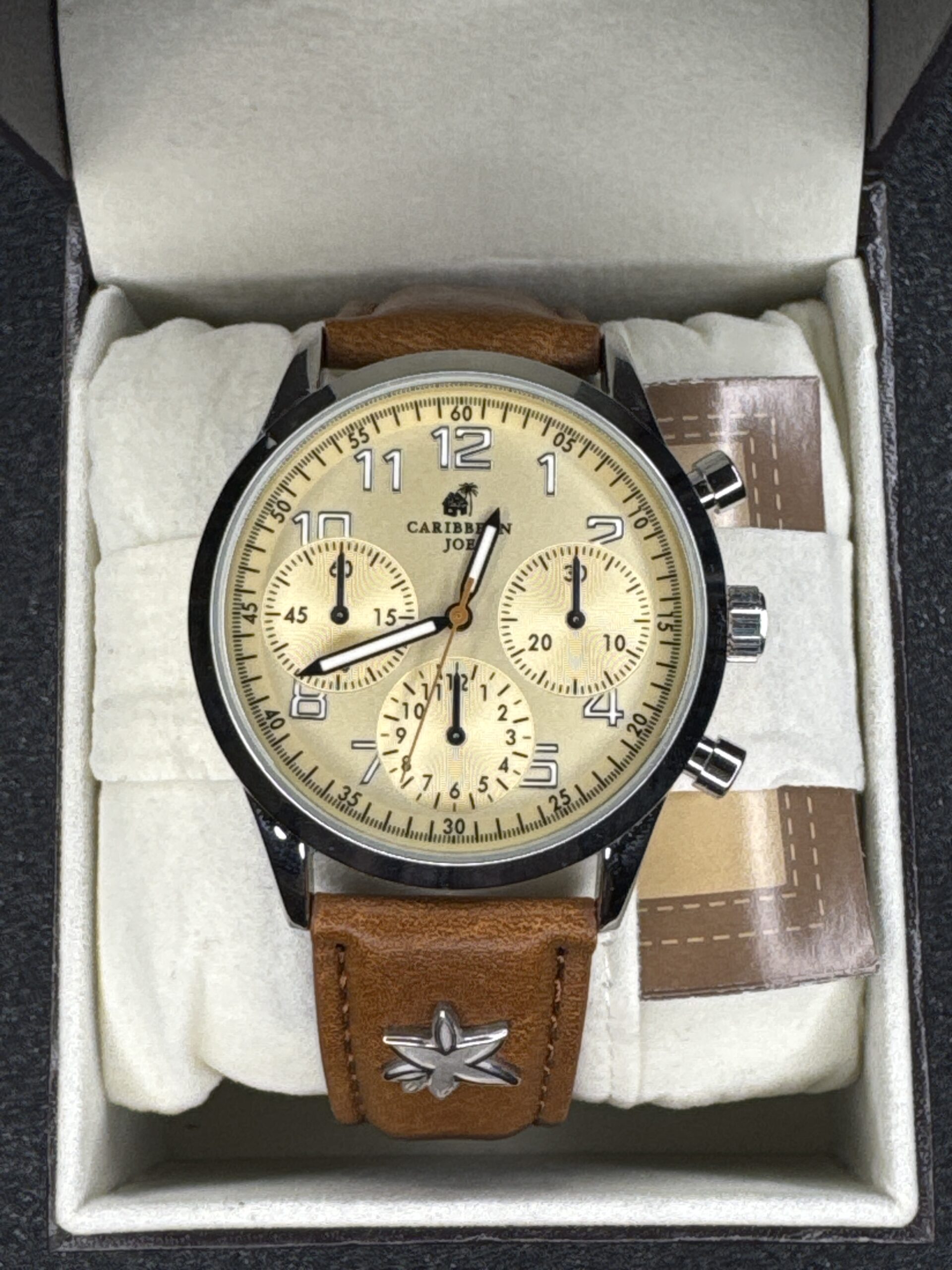 Discover the Caribbean Joe CJ7043 men’s chronograph watch, featuring a beige dial, leather strap, and new in box condition.