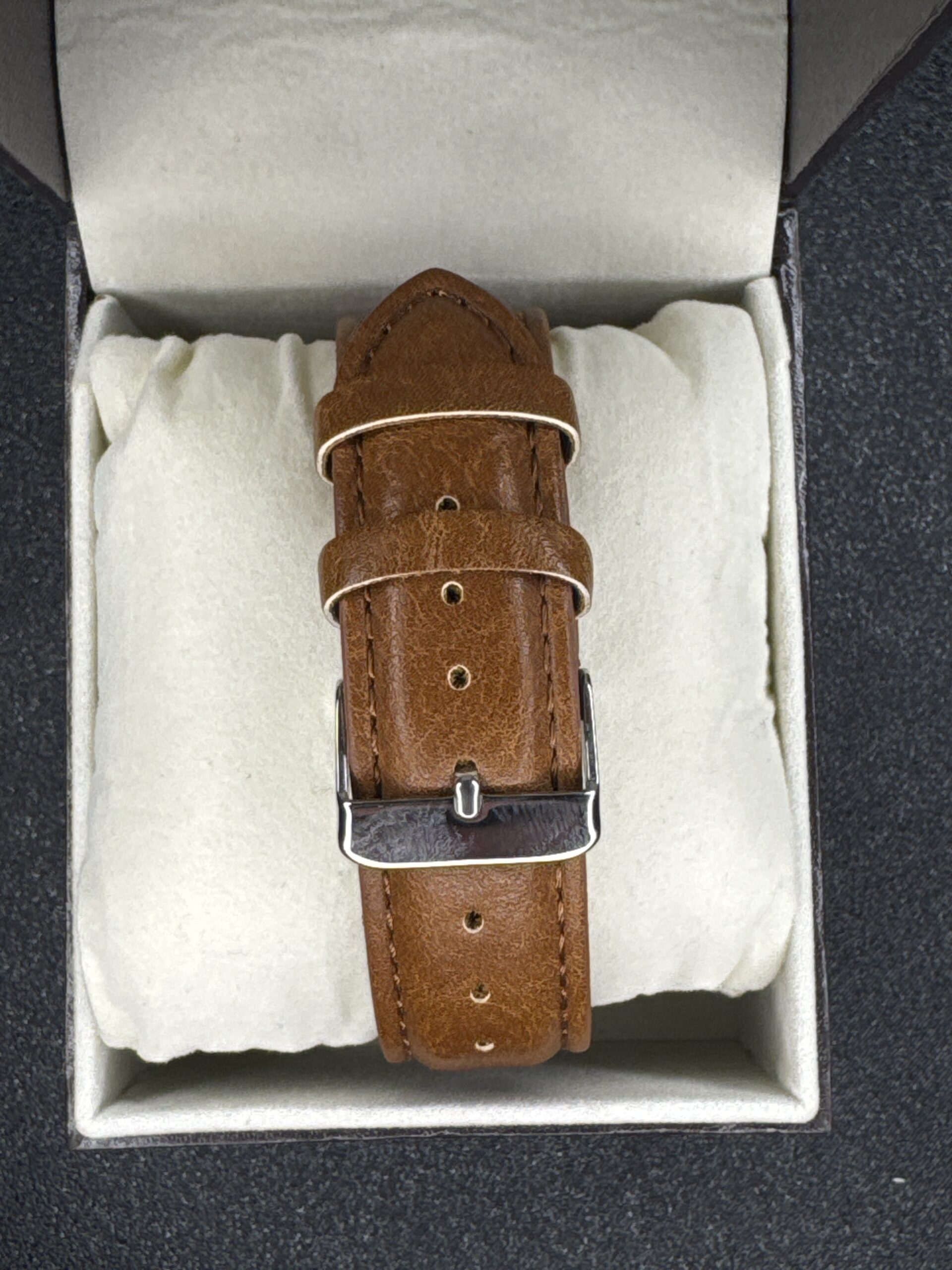 The Caribbean Joe CJ7043 is a men’s chronograph watch featuring a classic design with a beige dial and three subdials for tracking elapsed time. The watch is housed in a polished metal case and is complemented by a brown leather strap with a distinctive emblem. The dial includes Arabic numeral hour markers and luminous hands for enhanced readability. The watch is new in box, indicating pristine condition without any signs of wear.