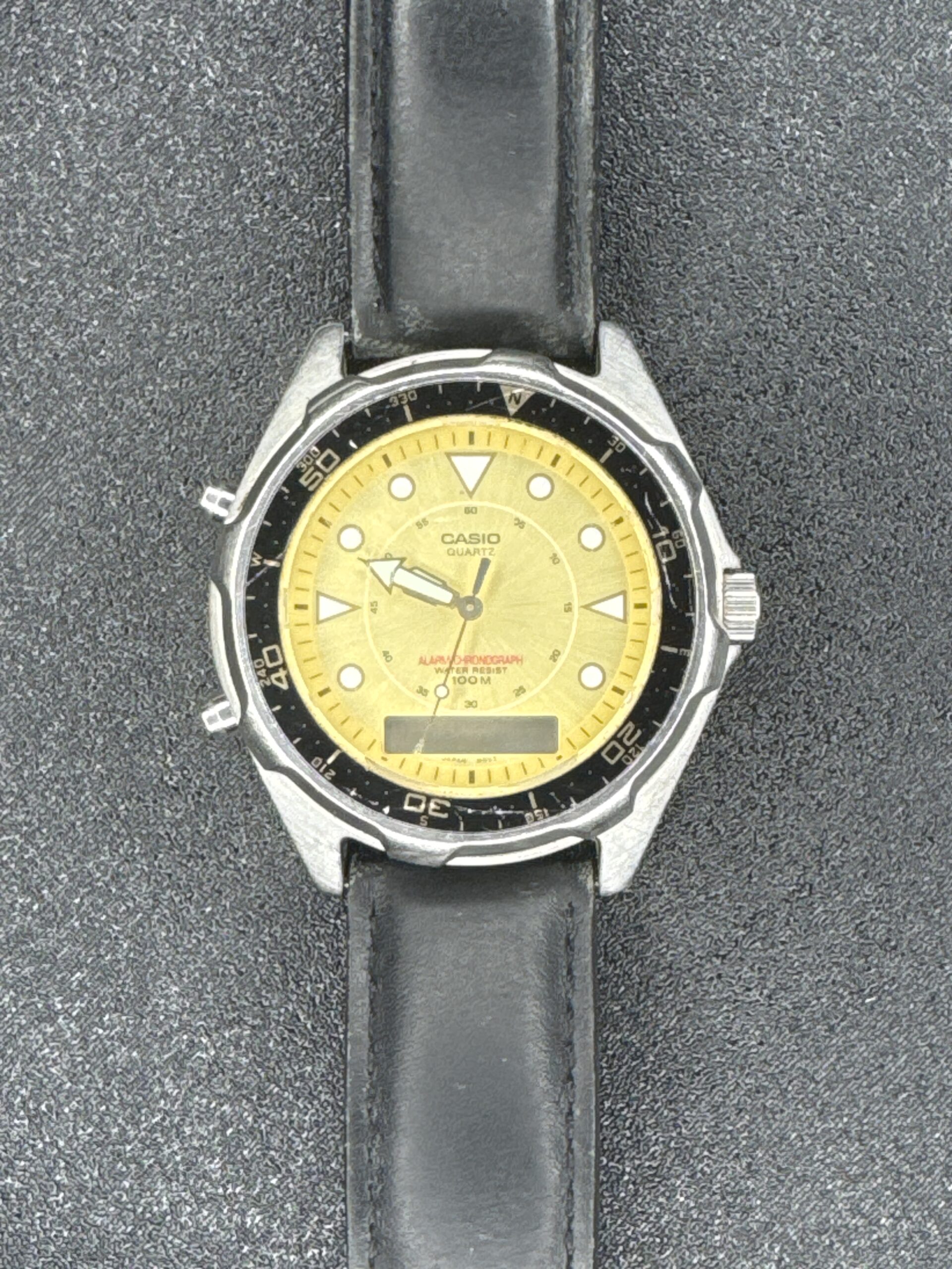 The Casio Alarm Chronograph Digital Men’s Watch AMW-320R features a distinctive yellow dial with a black rotating bezel. The watch has a dual display with both analog and digital timekeeping, offering functionality such as an alarm and chronograph. The case is made of stainless steel, and the watch is water-resistant up to 100 meters. The leather strap shows signs of wear, and the case has visible scratches, indicating moderate use.