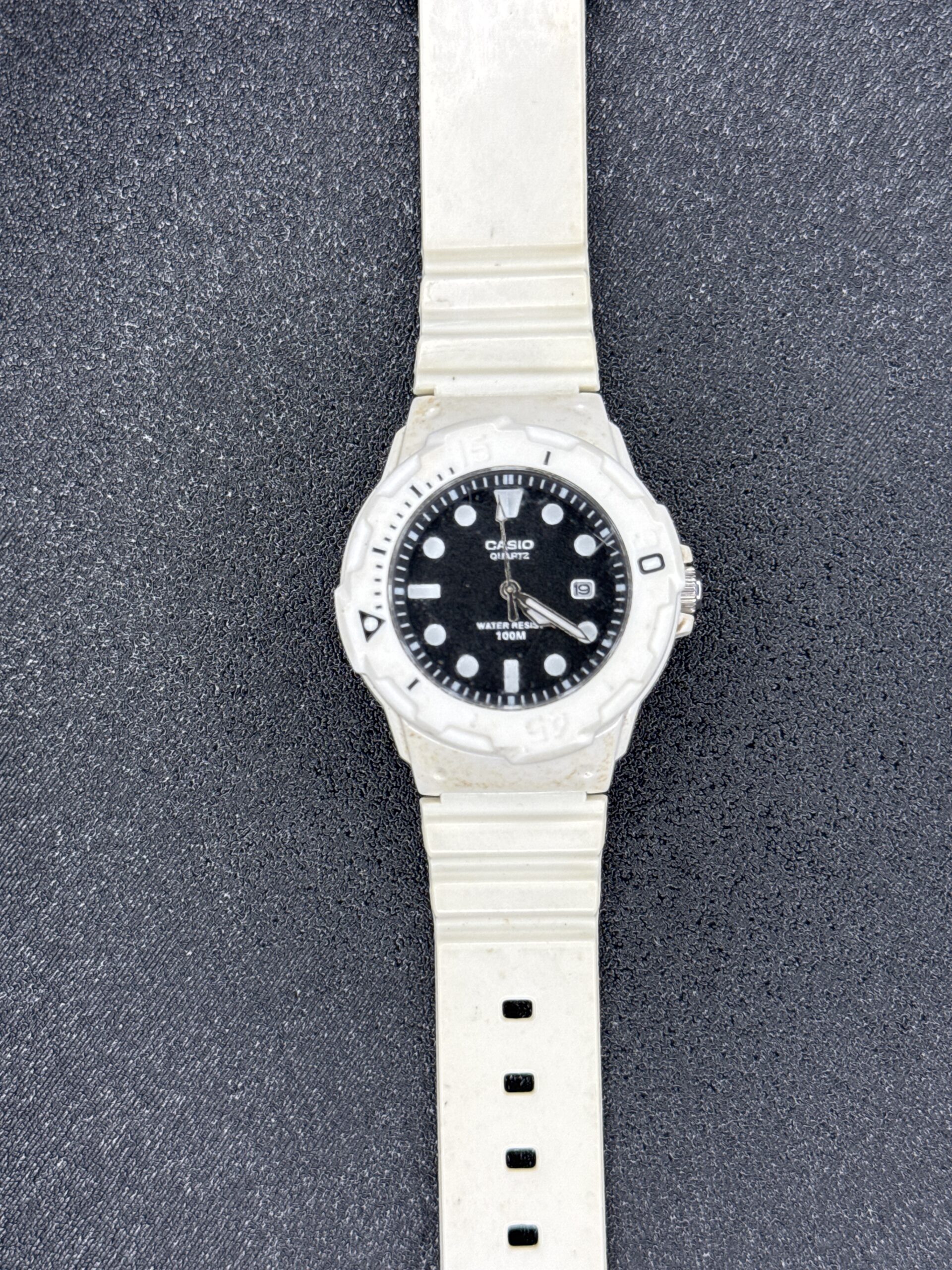 Casio Quartz Unisex Watch with black dial, white resin strap, date function, and 100m water resistance.