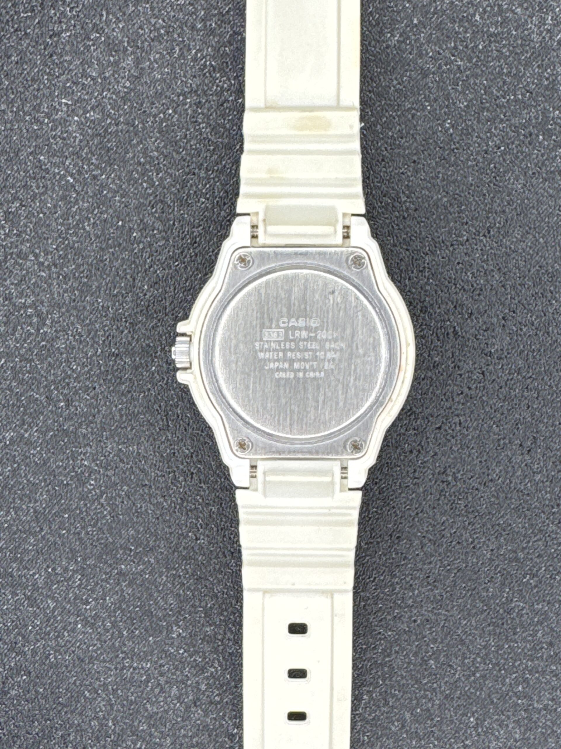 This Casio Quartz watch features a black dial with white hour markers and hands, providing a clear and easy-to-read display. The date function is positioned at 3 o’clock. The watch is housed in a durable white resin case with a matching resin strap, offering a sporty and casual look. The back of the watch indicates it is water-resistant up to 100 meters and features a stainless steel back. The model number is LRW-200H, and it is powered by a reliable Japanese quartz movement.