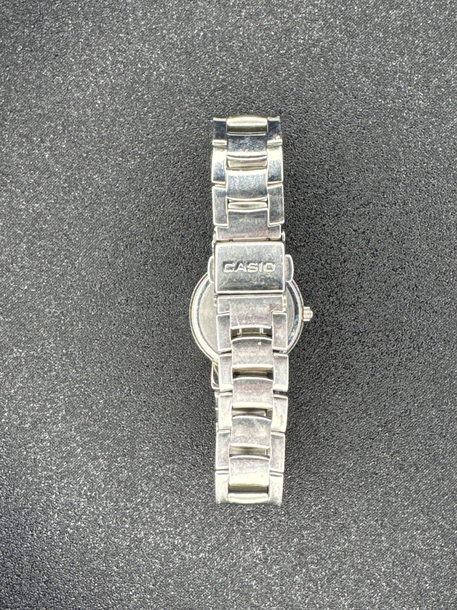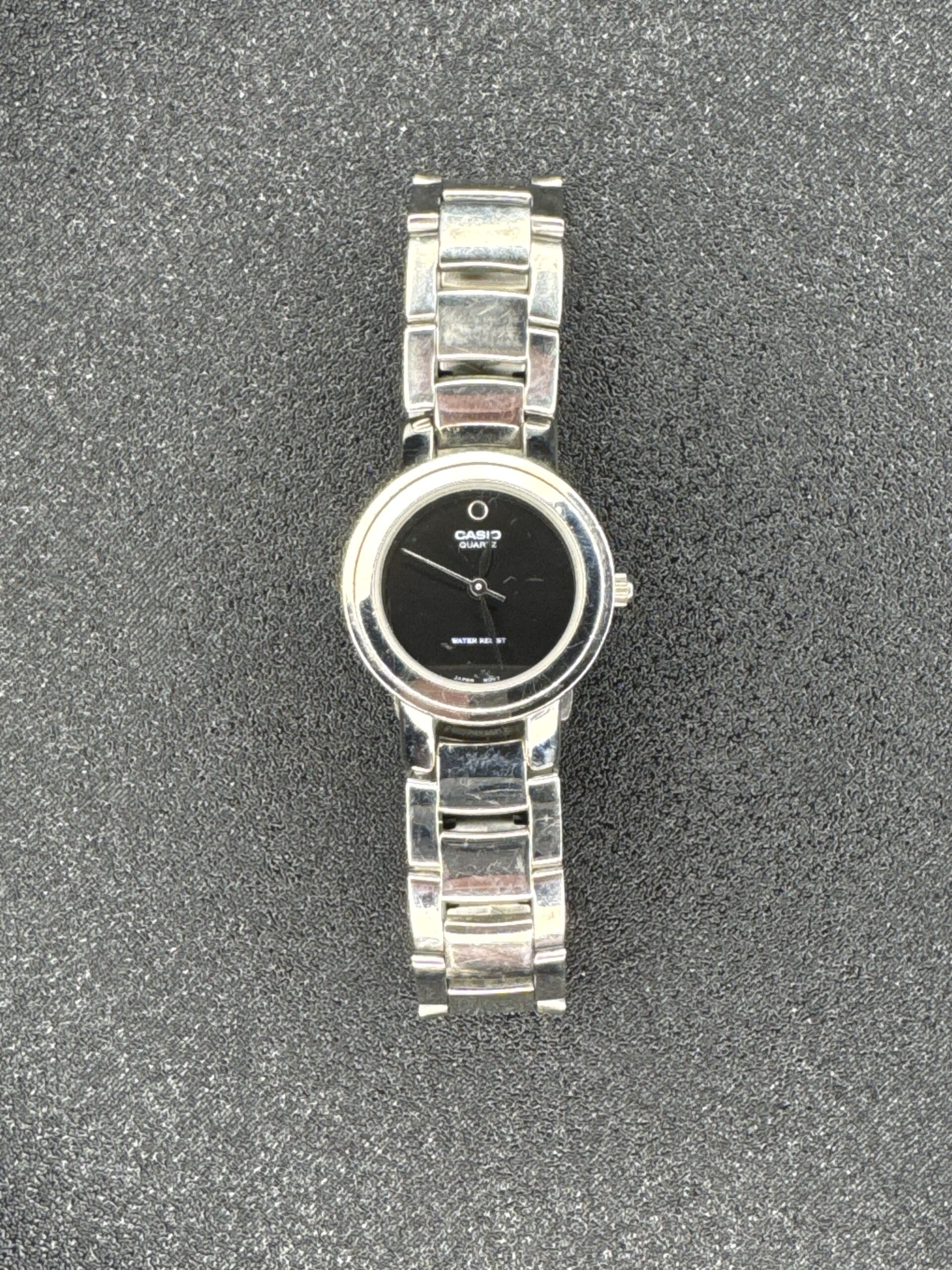 This Casio Quartz watch features a minimalist black dial with a single dot marker at 12 o’clock, and simple silver-tone hands. The watch has a stainless steel bracelet with a fold-over clasp, marked with the Casio logo. The case and bracelet show signs of wear, including scratches and minor tarnishing, typical of regular use.