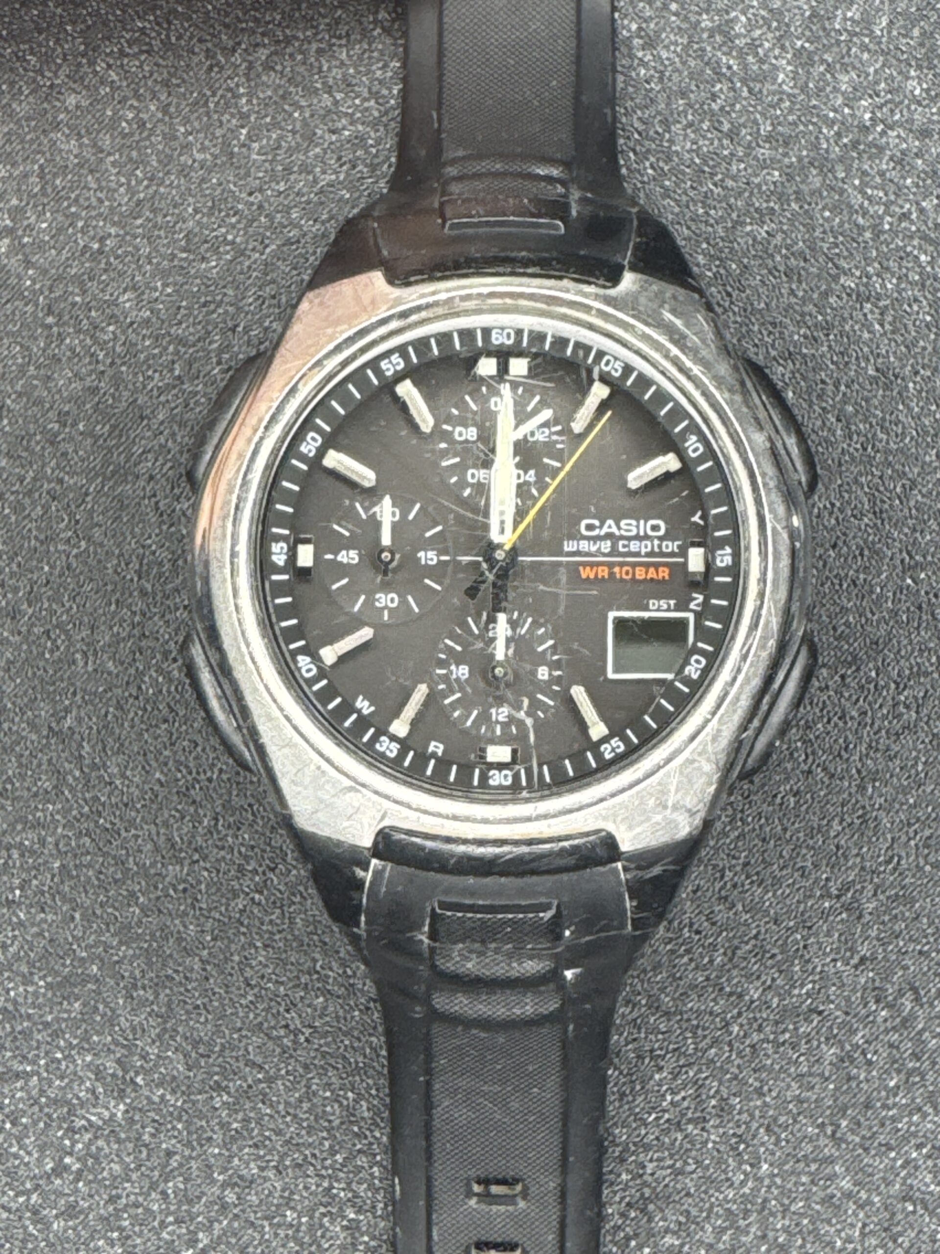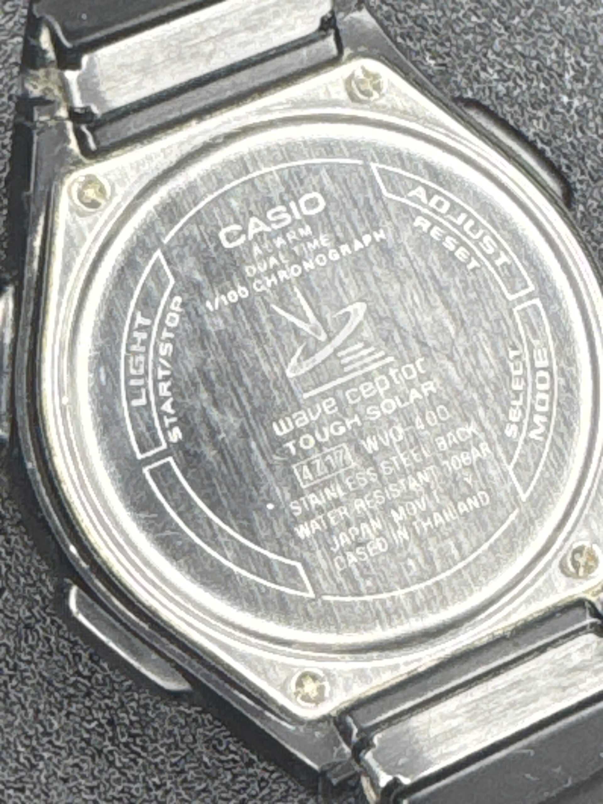 & Free ShippingCasio Wave Ceptor WVQ-400 men’s watch with Tough Solar, 1/100 chronograph, dual time, and alarm. Fair condition with visible wear.