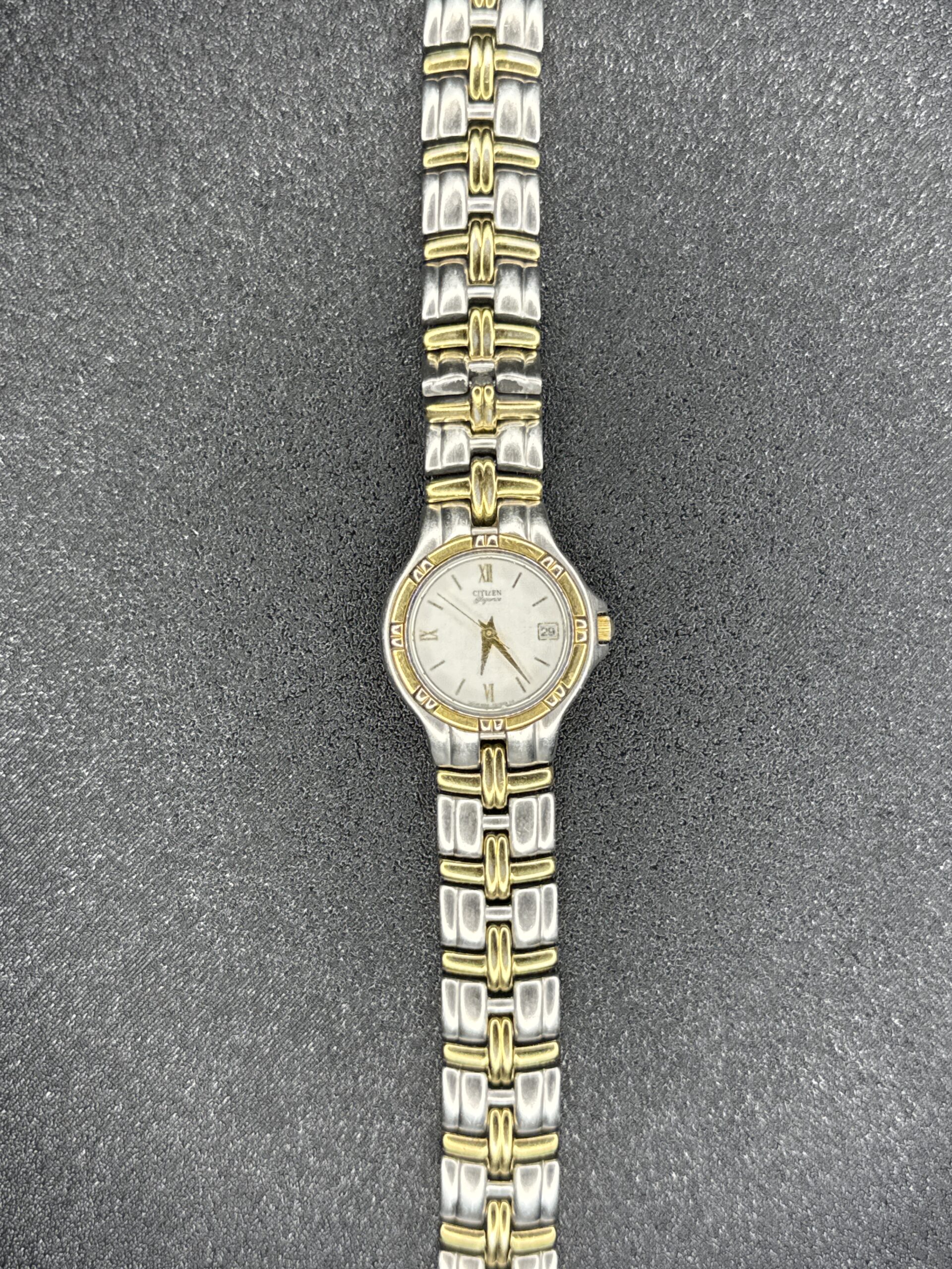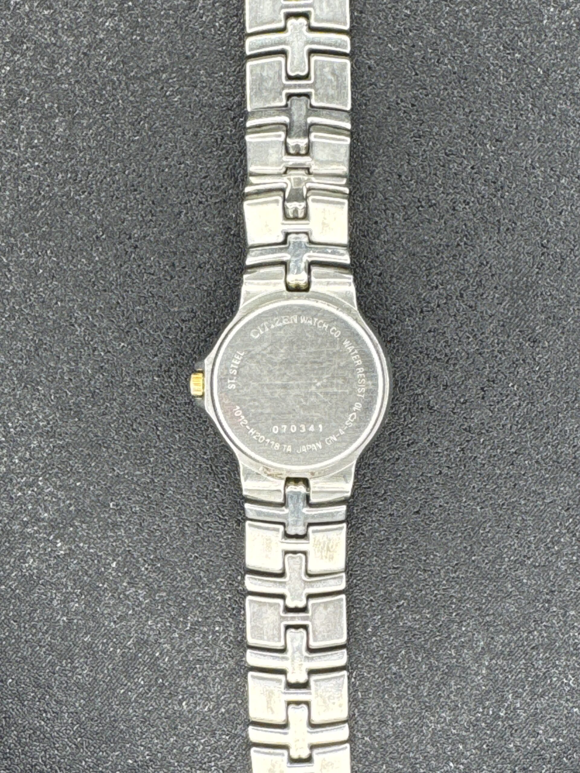 This Citizen Date Quartz women’s watch features a two-tone stainless steel bracelet with a combination of brushed and polished links. The round case houses a white dial with gold-tone Roman numeral hour markers and hands, along with a date display at the 3 o’clock position. The watch back is engraved with the Citizen logo and model number 070341. The overall condition shows signs of wear, with minor scratches on the bracelet and case back, typical for a pre-owned watch.