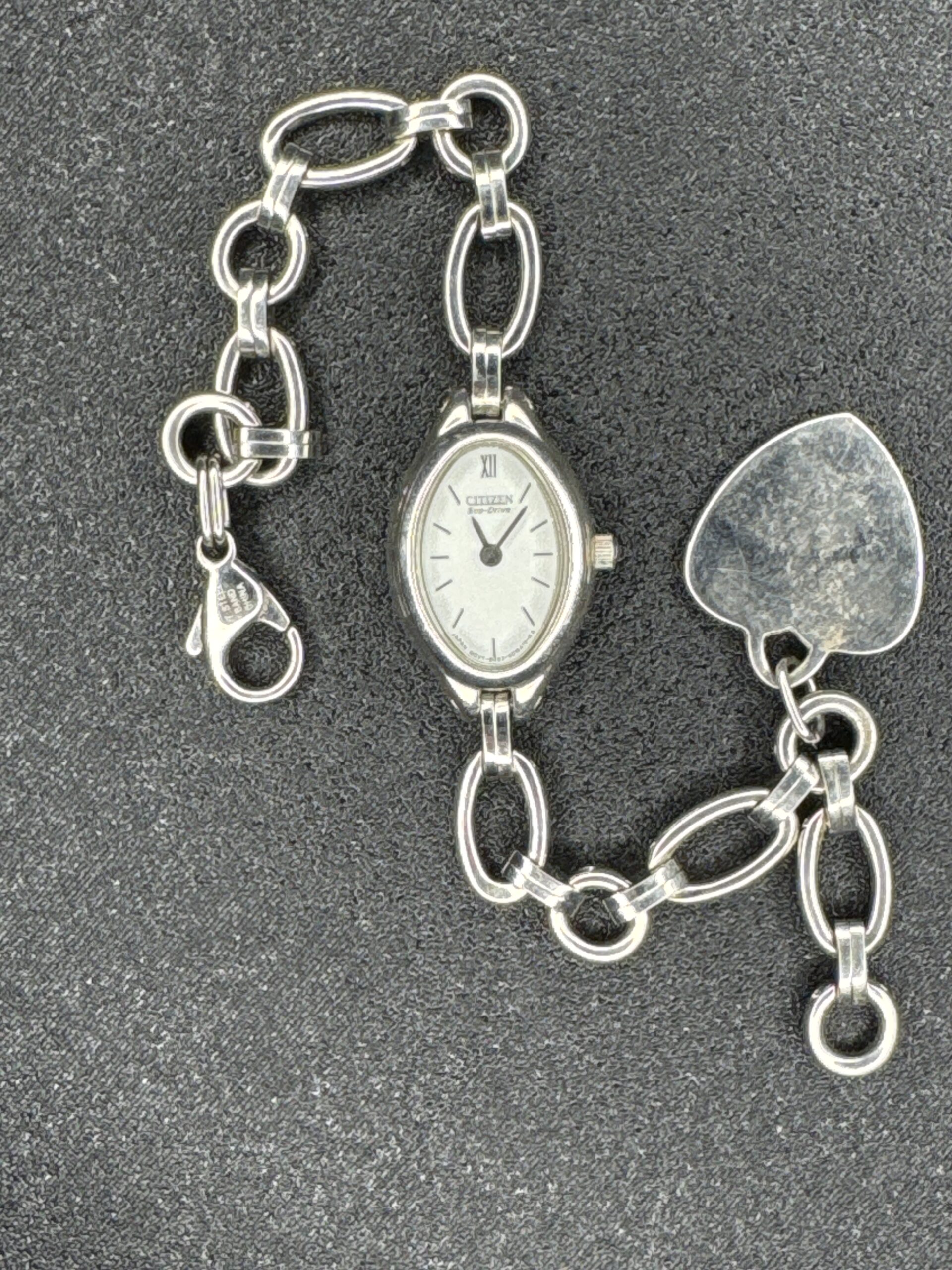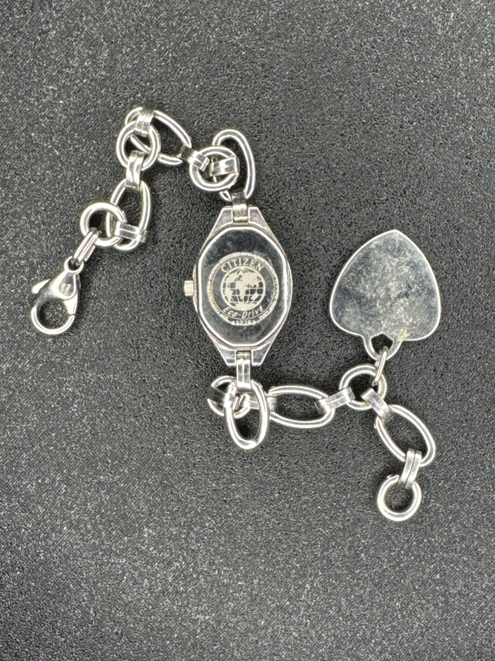 This Citizen Eco Drive Quartz Women’s Watch features a sleek, oval-shaped silver-tone case and a unique chain-link bracelet. The dial is minimalistic with Roman numeral hour markers and delicate hands, embodying a classic and elegant design. The Eco-Drive technology ensures the watch is powered by light, eliminating the need for battery changes. The back of the watch displays the Citizen Eco-Drive logo and model number 432753. The watch shows signs of wear with noticeable scratches on the case and bracelet, but remains functional.