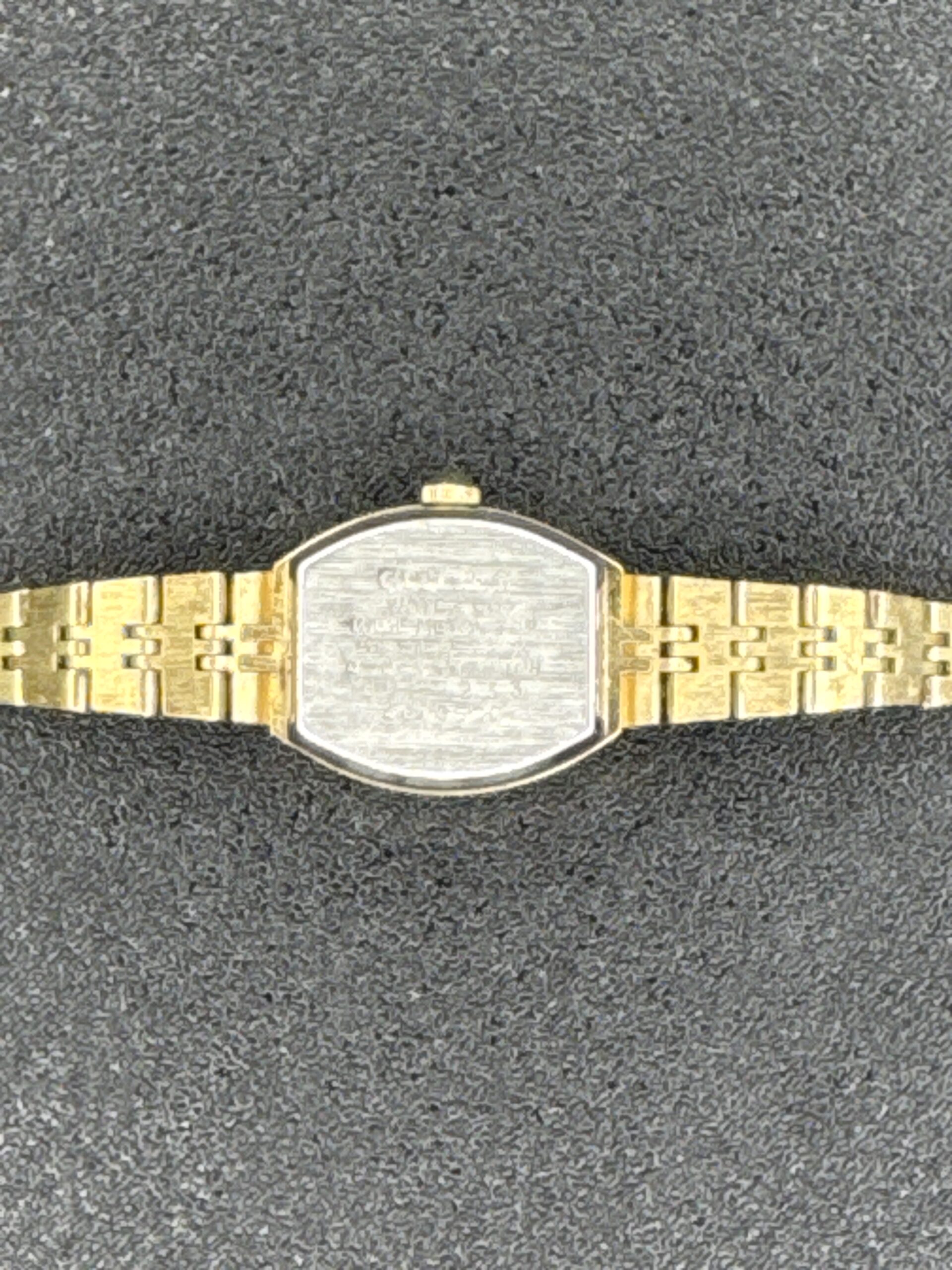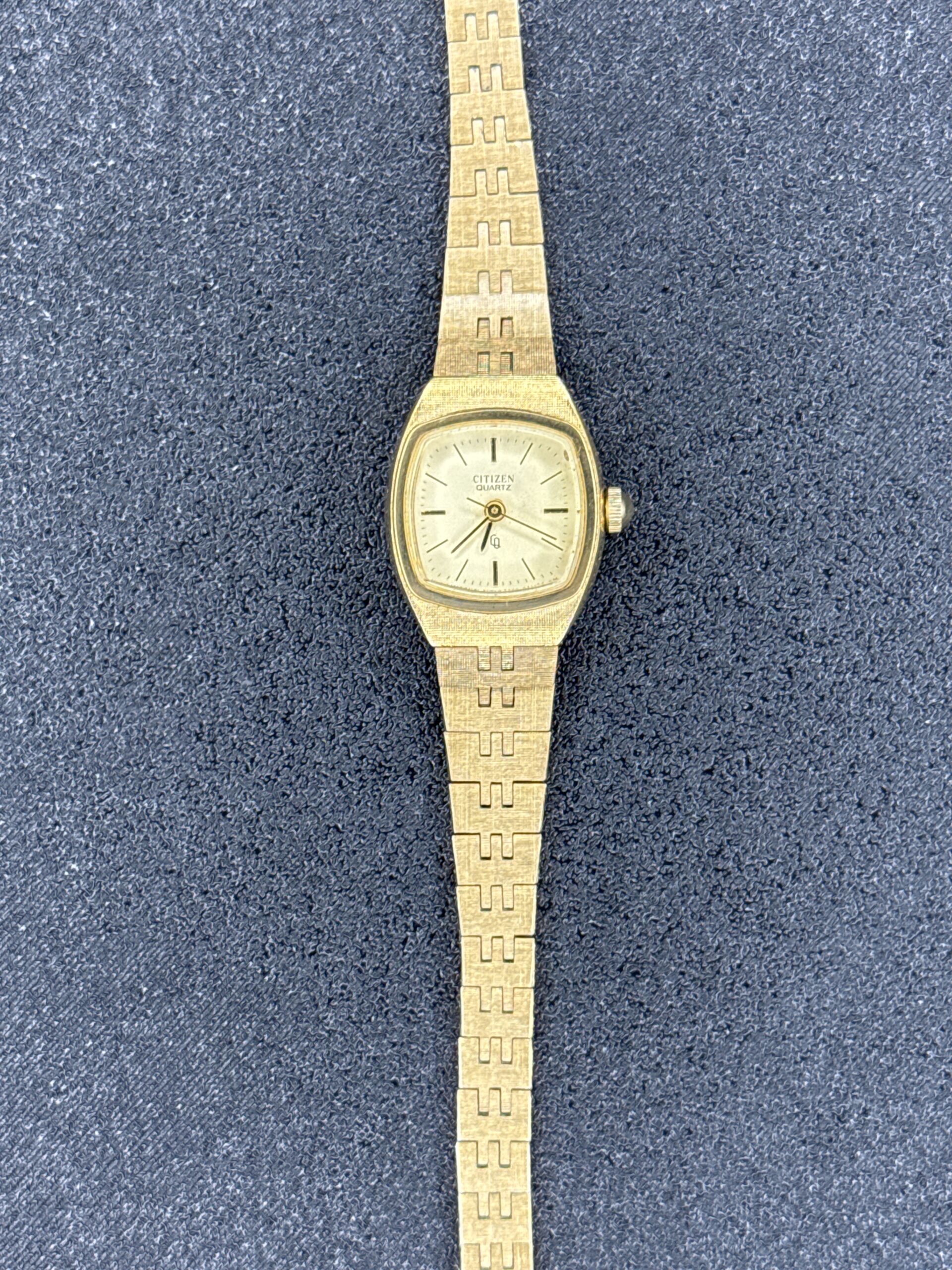 This is a vintage Citizen Quartz women’s watch featuring a small, elegant design. The watch has a gold-tone case and integrated bracelet with a textured finish. The dial is simple, with gold-tone hands and markers, and the Citizen Quartz logo is prominently displayed. The back of the watch shows typical wear for its age, with some scratches visible. The watch is powered by a reliable quartz movement, ensuring accurate timekeeping.