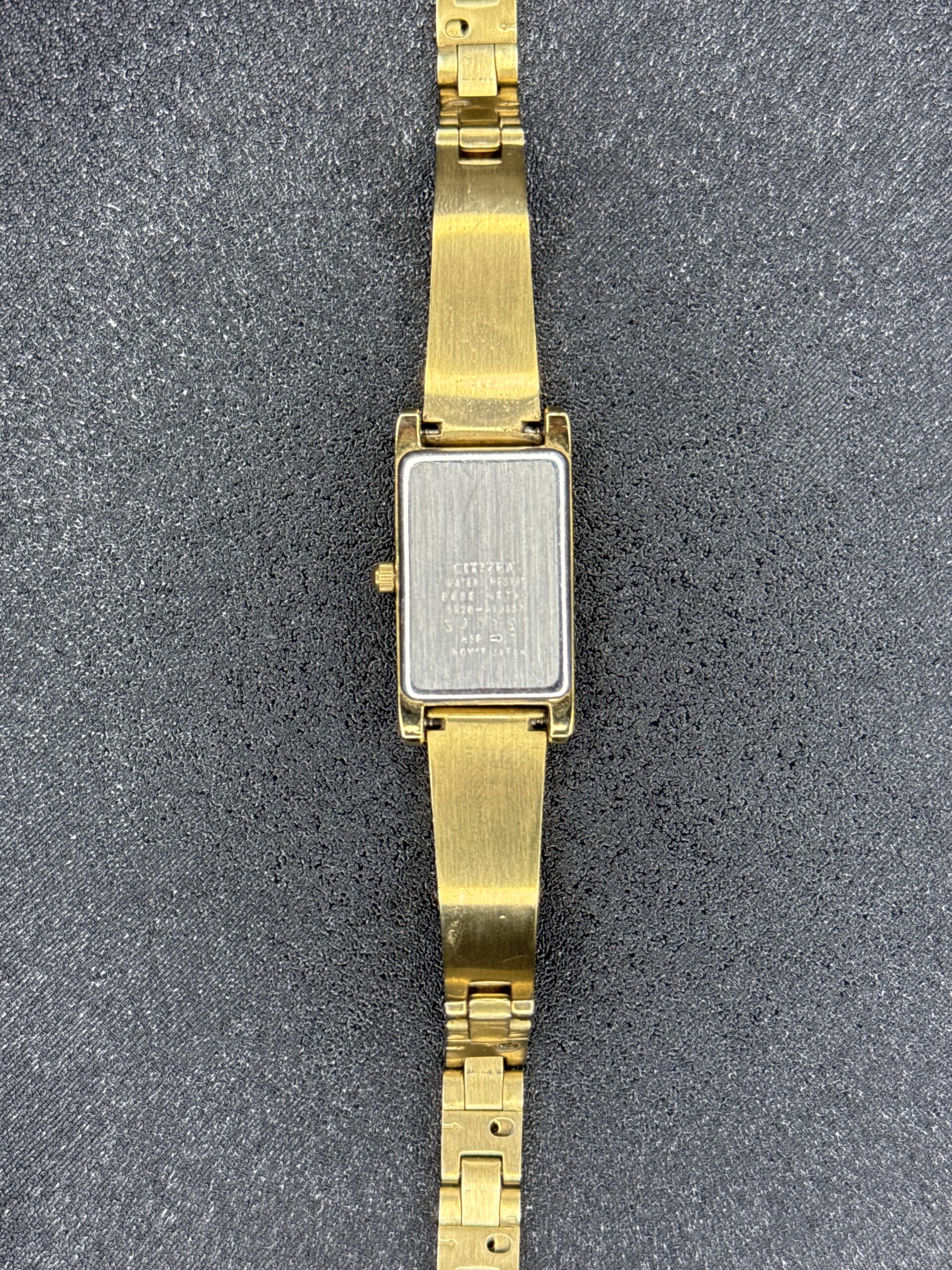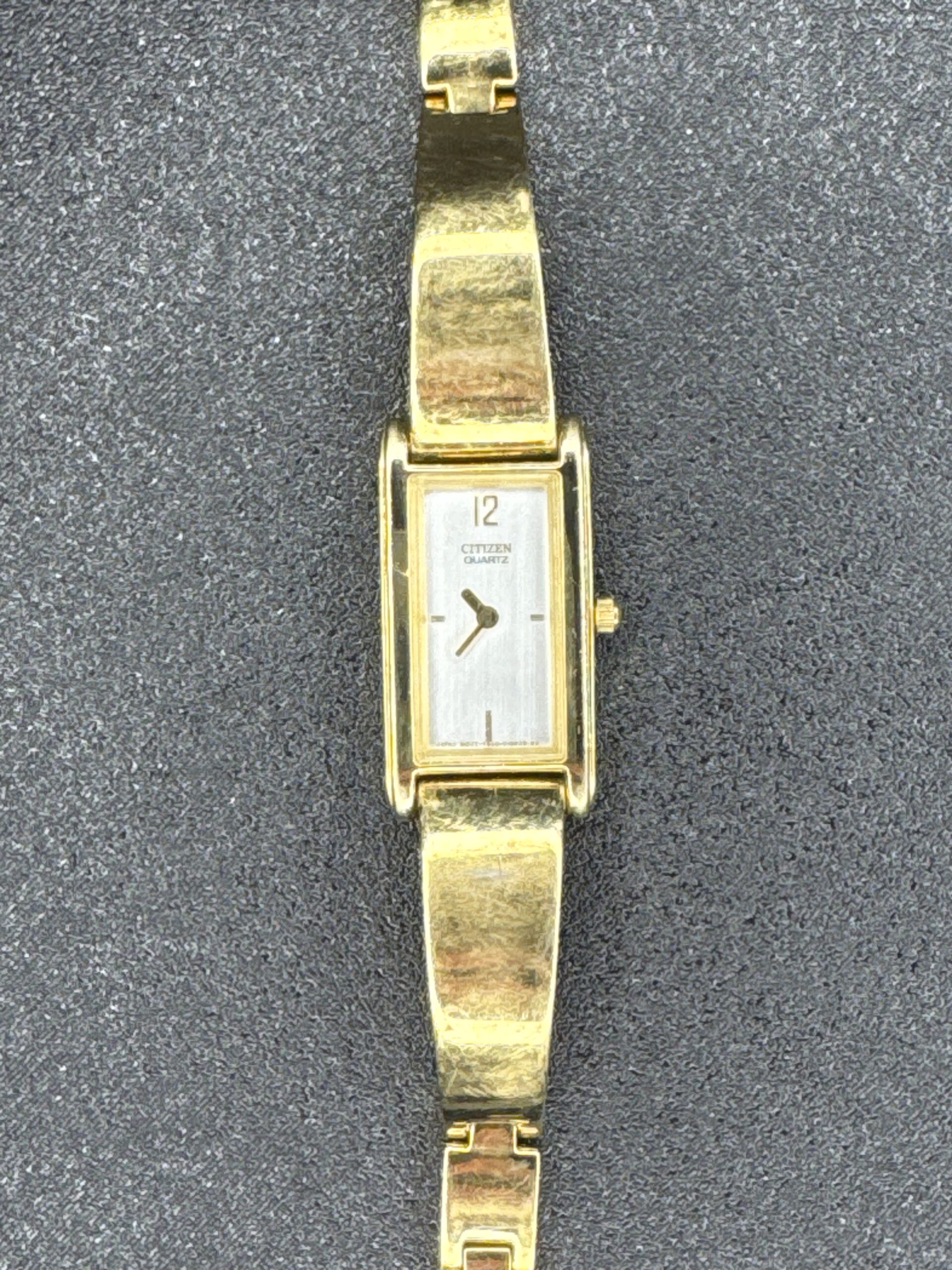 This Citizen Quartz women’s watch features a two-tone design with a rectangular case and a matching bracelet. The dial is simple with minimalistic hour markers and hands, providing a clean and elegant look. The watch shows signs of wear, including scratches on the bracelet and case, consistent with regular use. The back of the watch displays the model number and other details, indicating authenticity.