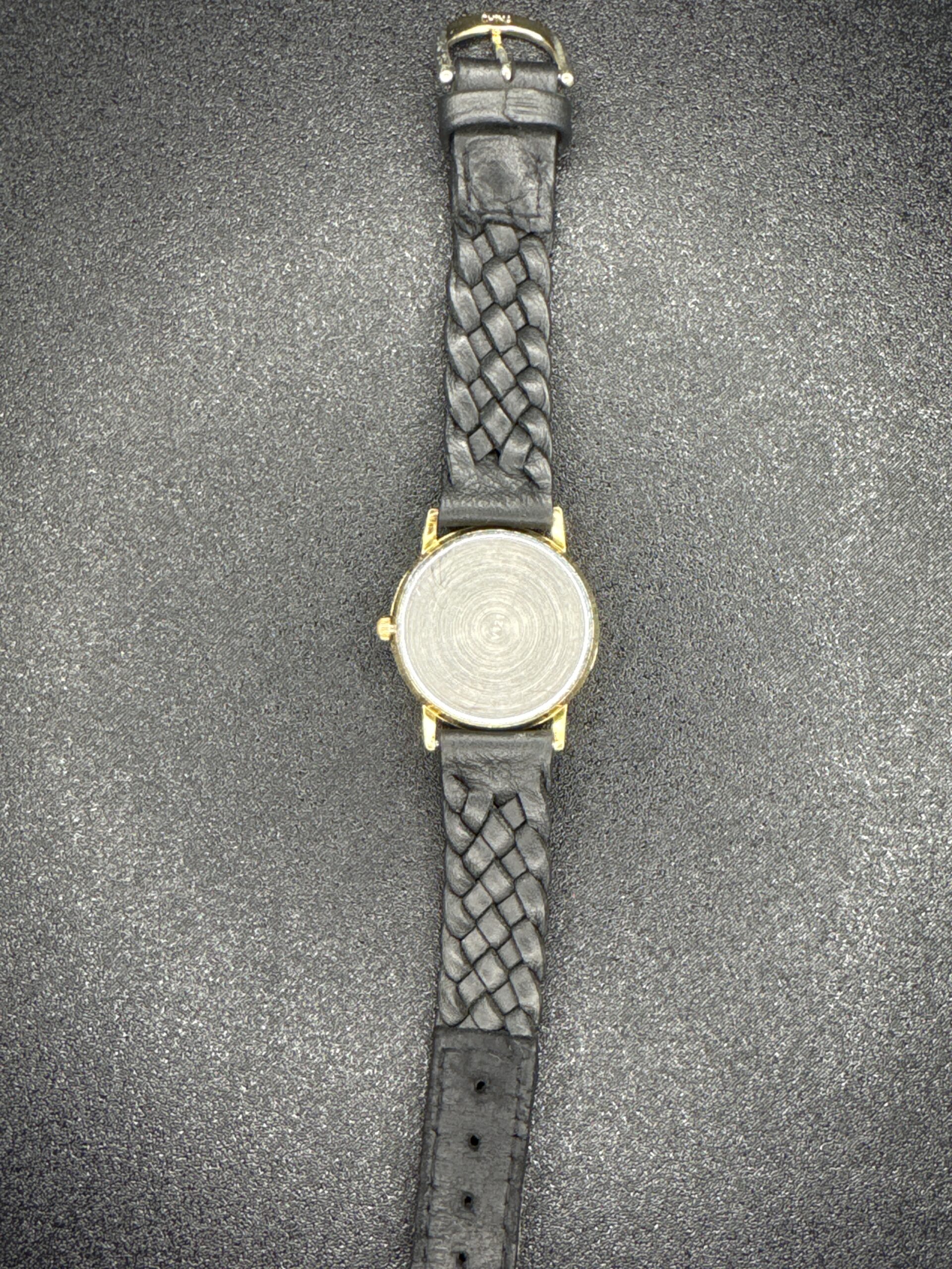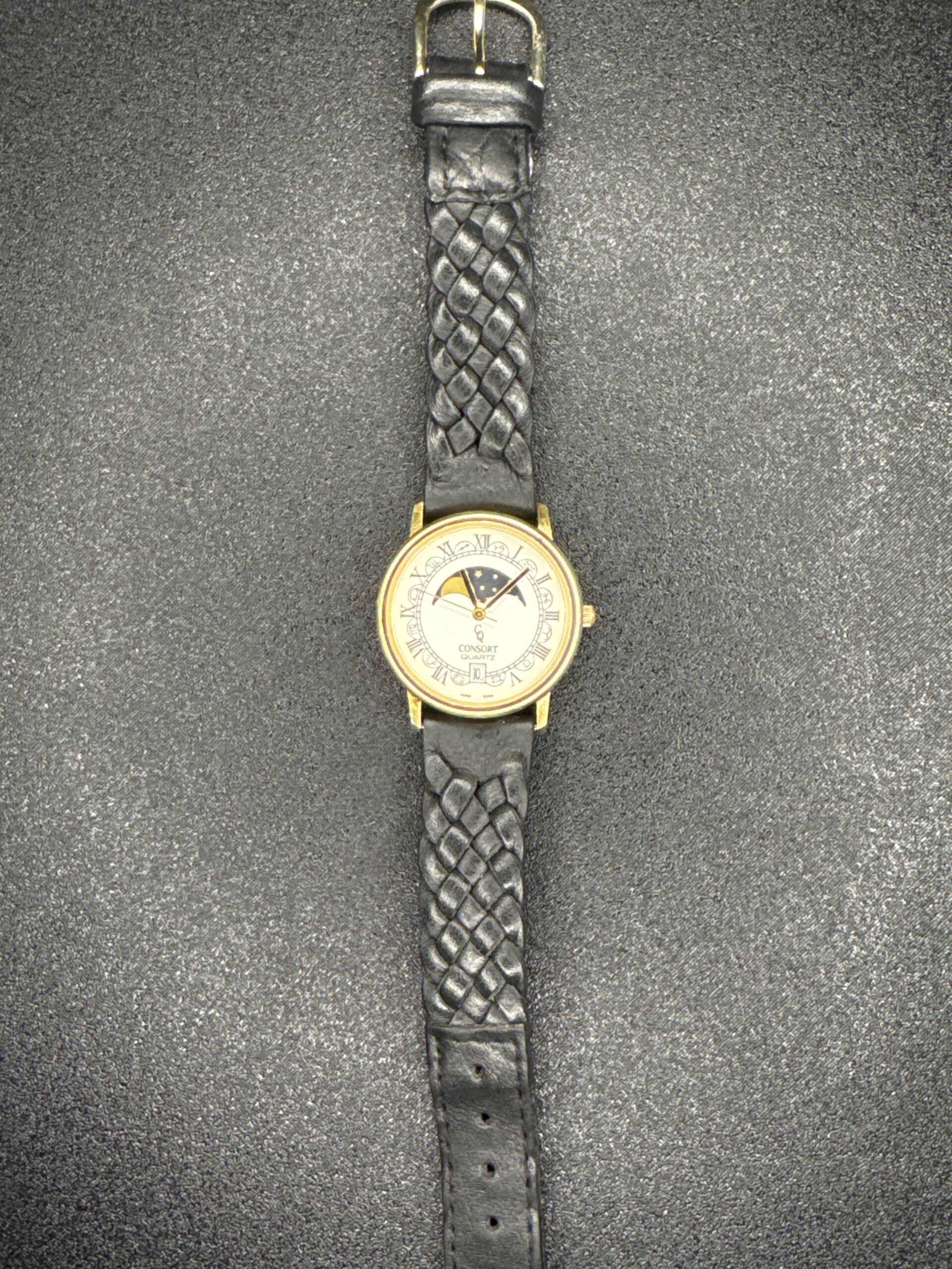 The Consort Quartz Date Moon Phase watch features a classic round gold-tone case with a moon phase complication prominently displayed on the dial. The watch has a unique braided black leather strap, adding a touch of elegance and vintage appeal. The dial includes Roman numeral hour markers and a date function. The back of the watch is plain, suggesting a simple snap-on case back. The watch appears to be in fair condition with some wear visible on the strap and case.