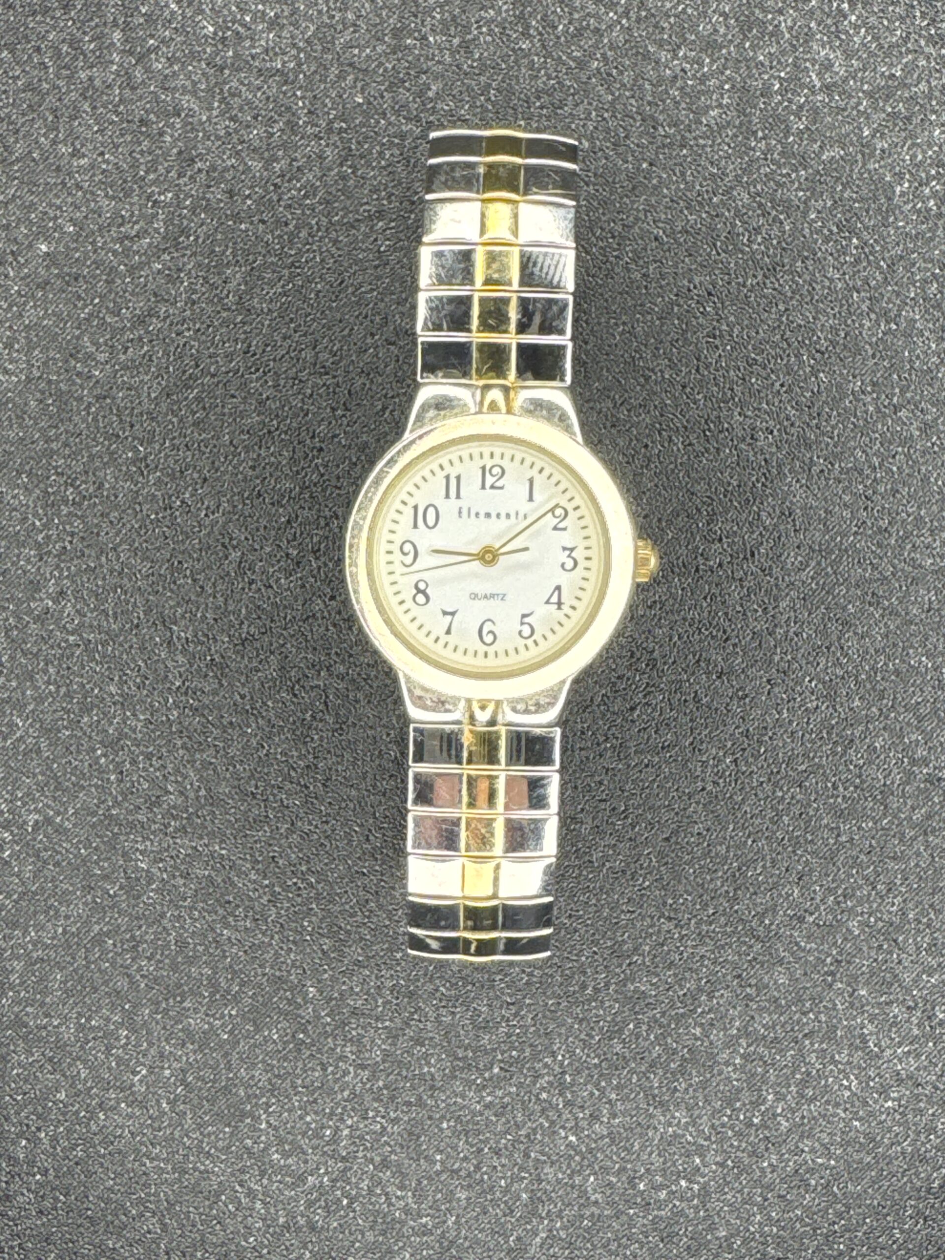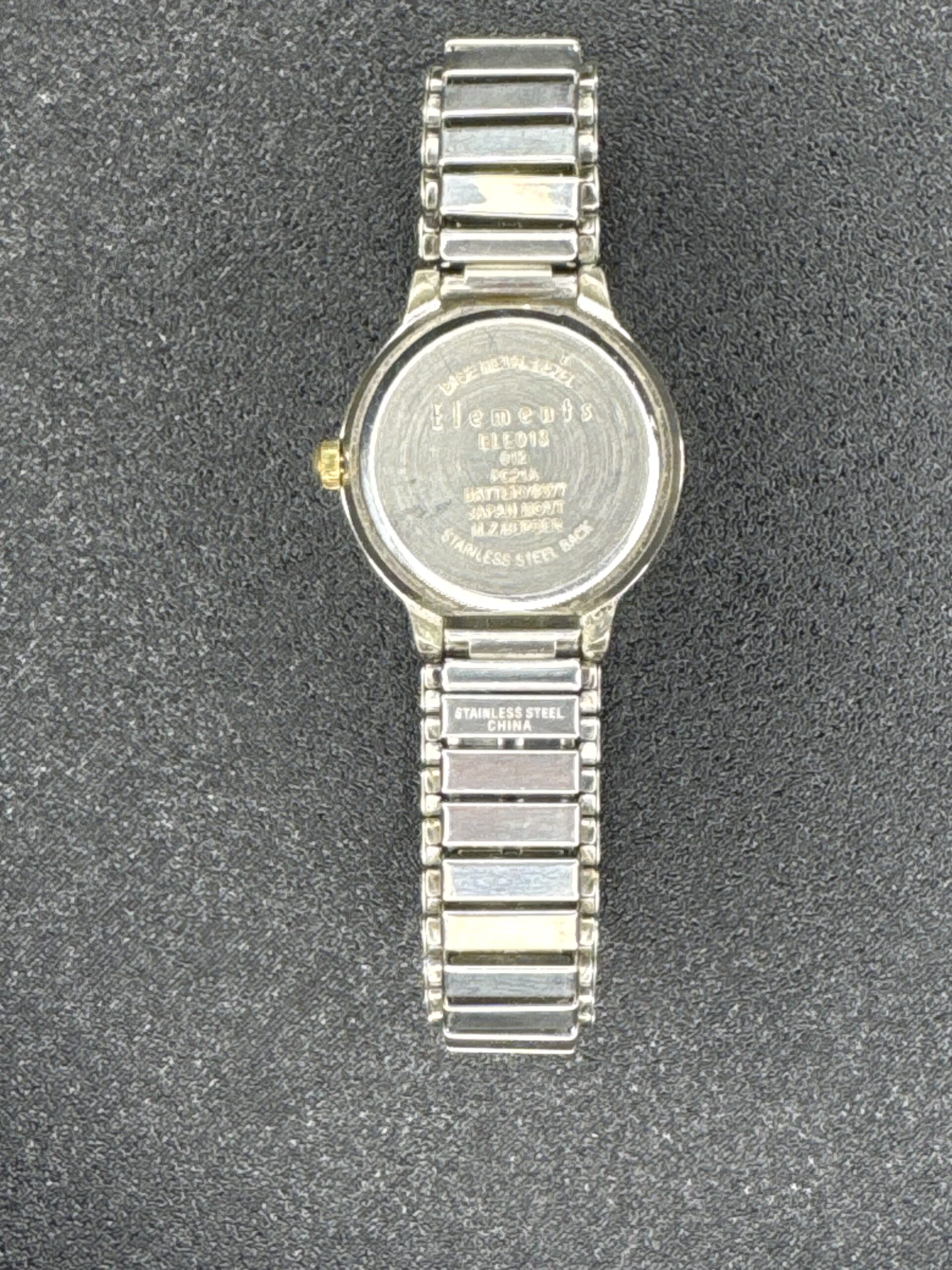 The Elements Quartz Women’s Watch features a classic round dial with a simple, easy-to-read design. The watch has a two-tone metal bracelet, combining silver and gold tones, which adds a touch of elegance. The dial is marked with Arabic numerals and the word ‘Elements’ is displayed under the 12 o’clock position. The back of the watch is marked with ‘Stainless Steel Back’ and ‘Made in China,’ indicating its construction materials and origin. The watch is powered by a Japanese quartz movement, ensuring accurate timekeeping.