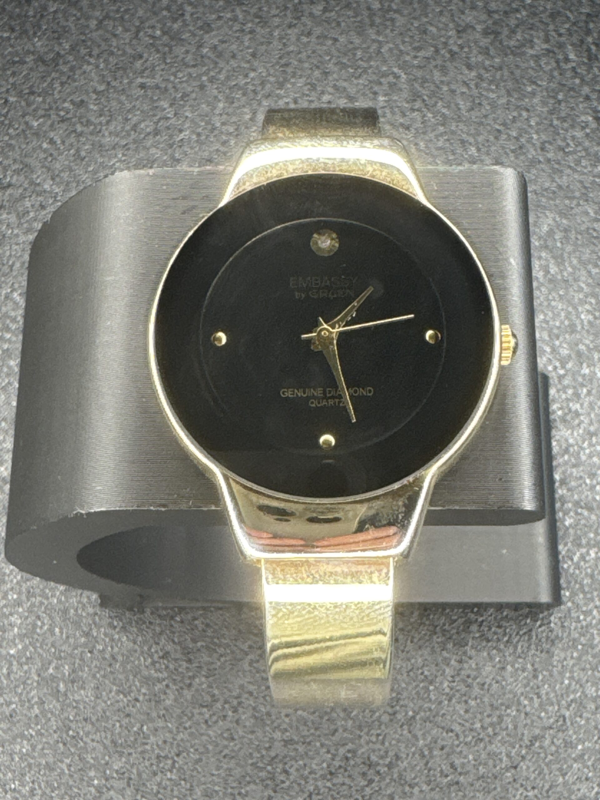 The Embassy by Gruen GEM1813L is a women’s quartz watch featuring a minimalist design. The watch has a black dial with gold-tone hands and hour markers, including a genuine diamond at the 12 o’clock position. The case and bracelet are gold-toned, adding elegance to its appearance. The back of the watch indicates a stainless steel back and a base metal bezel, with the model number GEM1813L. The watch is powered by a quartz movement, ensuring accurate timekeeping.