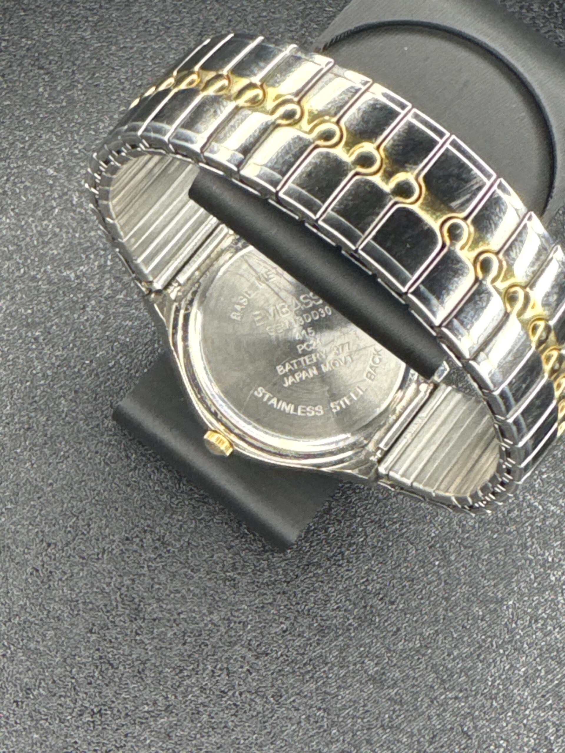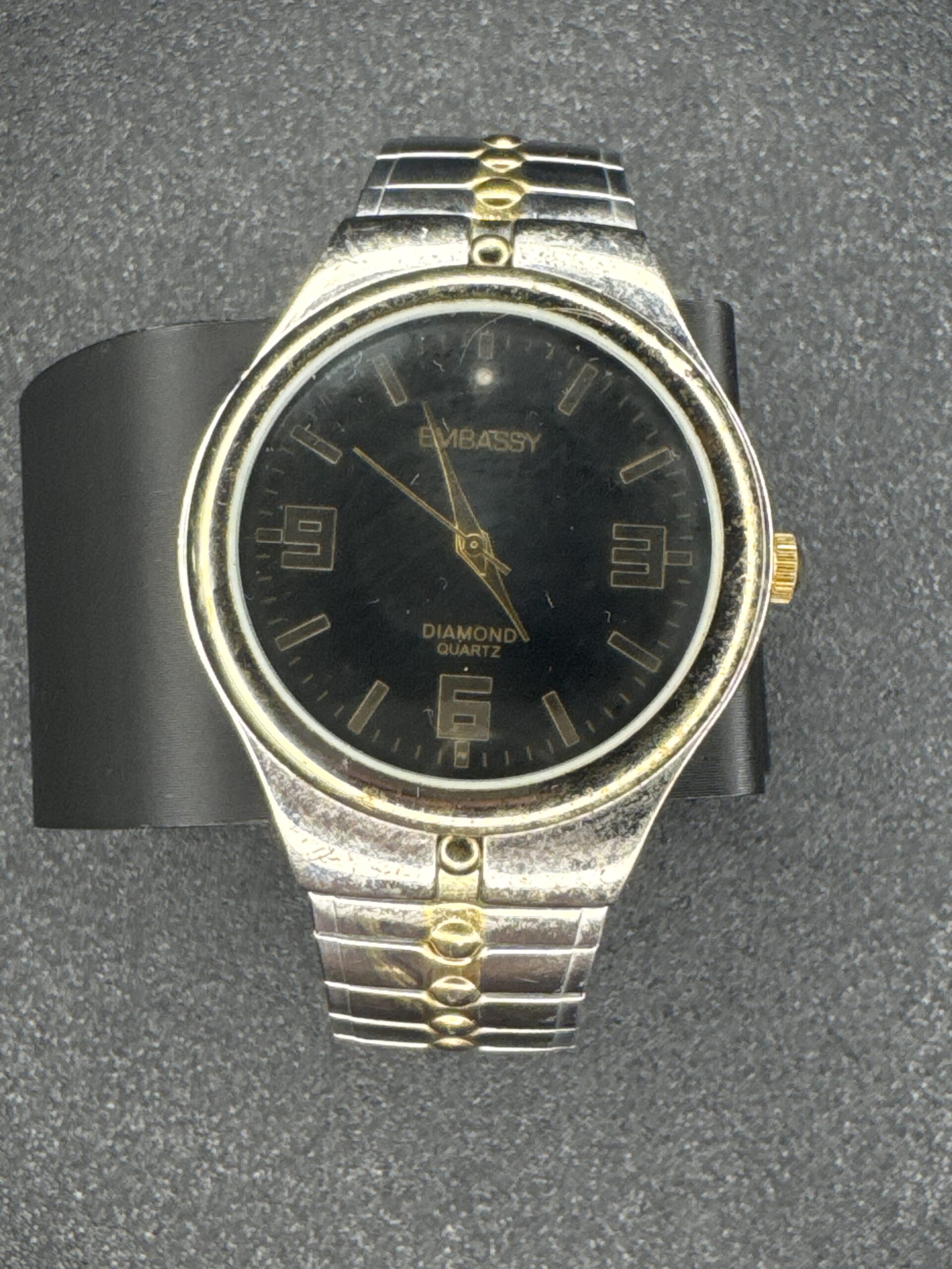 The Embassy Diamond Quartz Men’s Watch GEM13DD30 features a black dial with gold-tone hour markers and hands. The watch has a two-tone stainless steel bracelet with gold accents. The case back indicates a Japanese quartz movement and stainless steel construction. The watch shows signs of wear, including scratches on the case and bracelet.