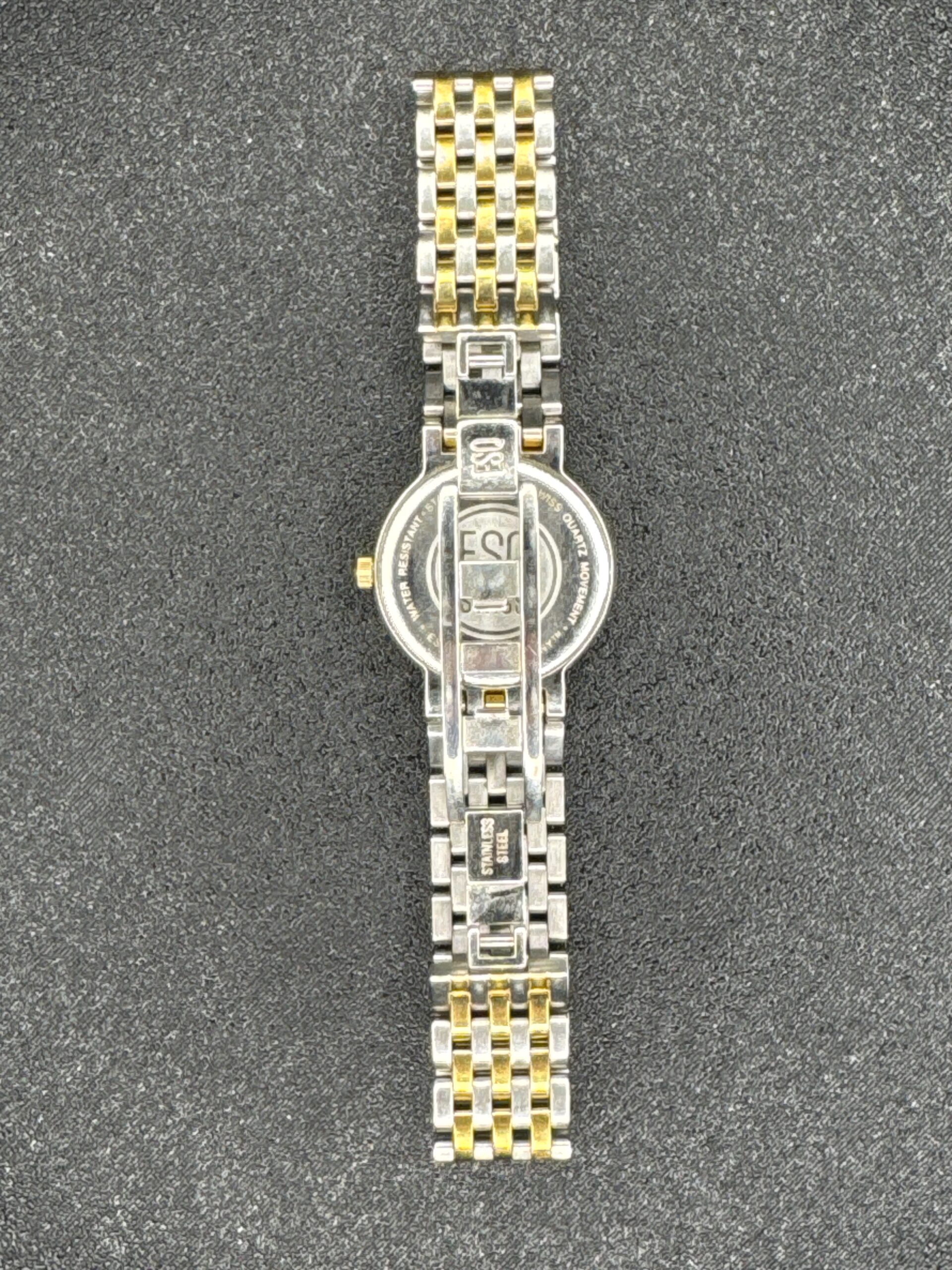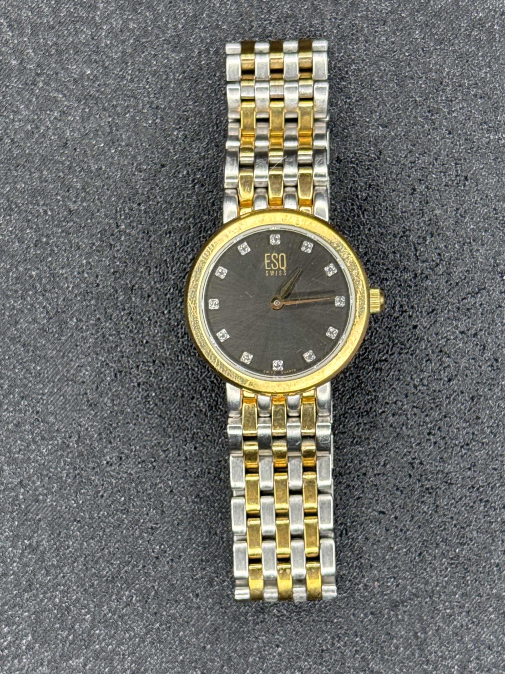 This ESQ Swiss Quartz Women’s Watch, model E5239, features a two-tone stainless steel bracelet with gold-tone accents. The round case houses a dark dial adorned with crystal hour markers, adding a touch of elegance. The watch is powered by a quartz movement, ensuring accurate timekeeping. The back of the watch is marked with ‘Stainless Steel’ and ‘Quartz Movement’, indicating its durable construction and reliable performance.