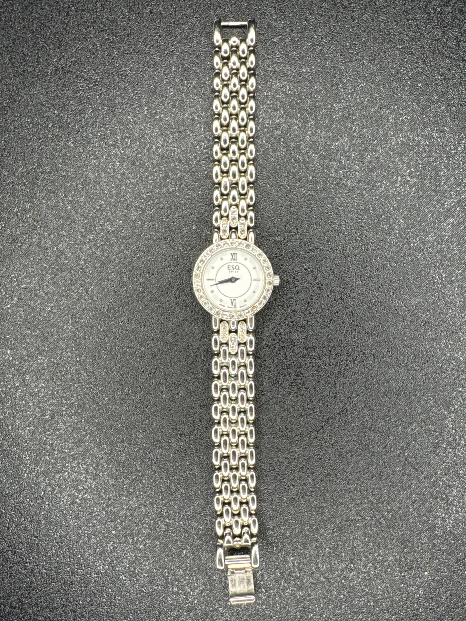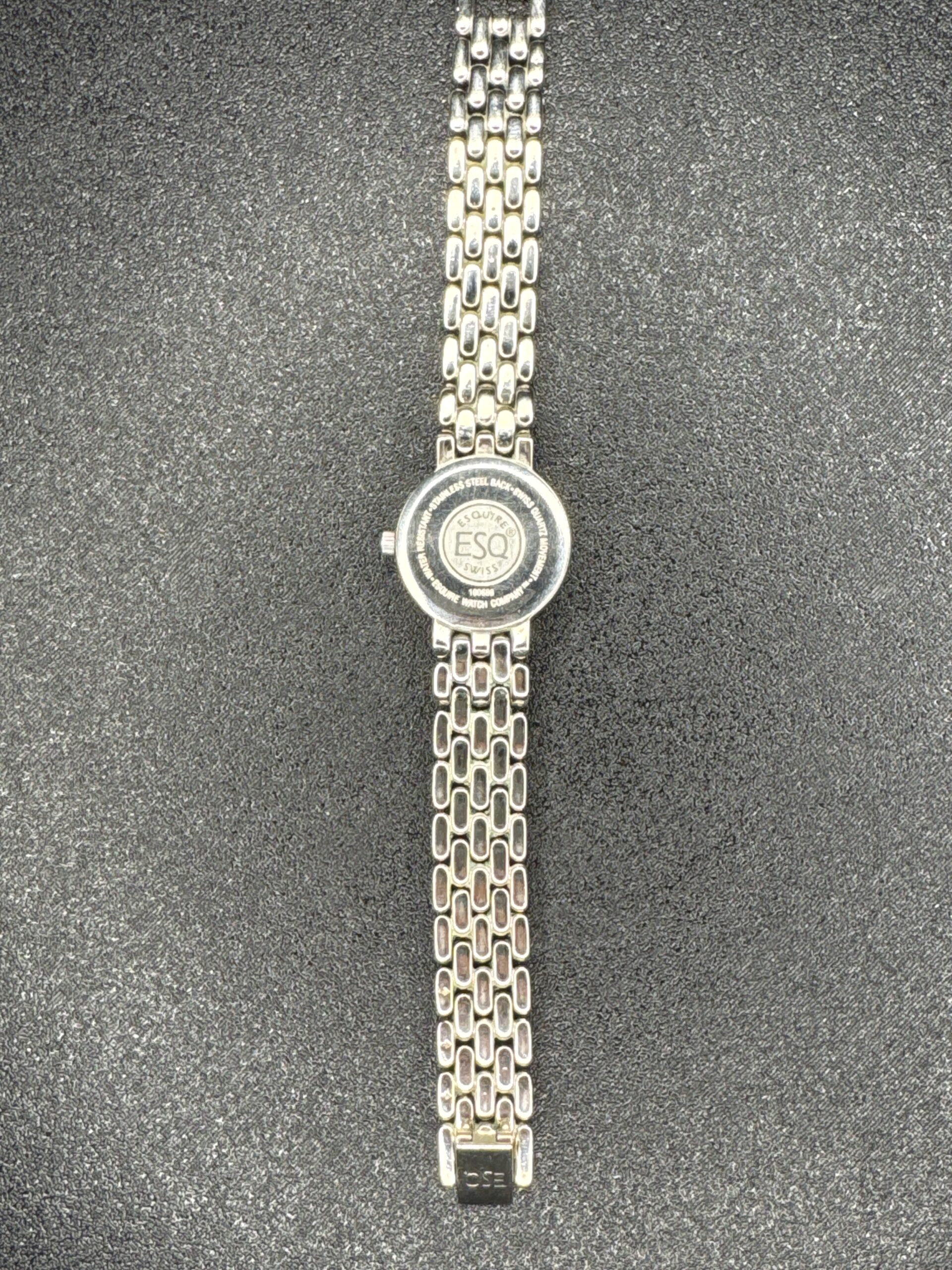 The ESQ Swiss Women’s Watch, model 100686, features a silver-tone stainless steel case and bracelet. The watch has a round face with Roman numeral markers at 12 o’clock and a minimalist design. The bezel is adorned with crystals, adding a touch of elegance. The bracelet consists of polished links, providing a sophisticated look. The back of the watch displays the ESQ logo and model information. Overall, the watch is in good condition with minor signs of wear.