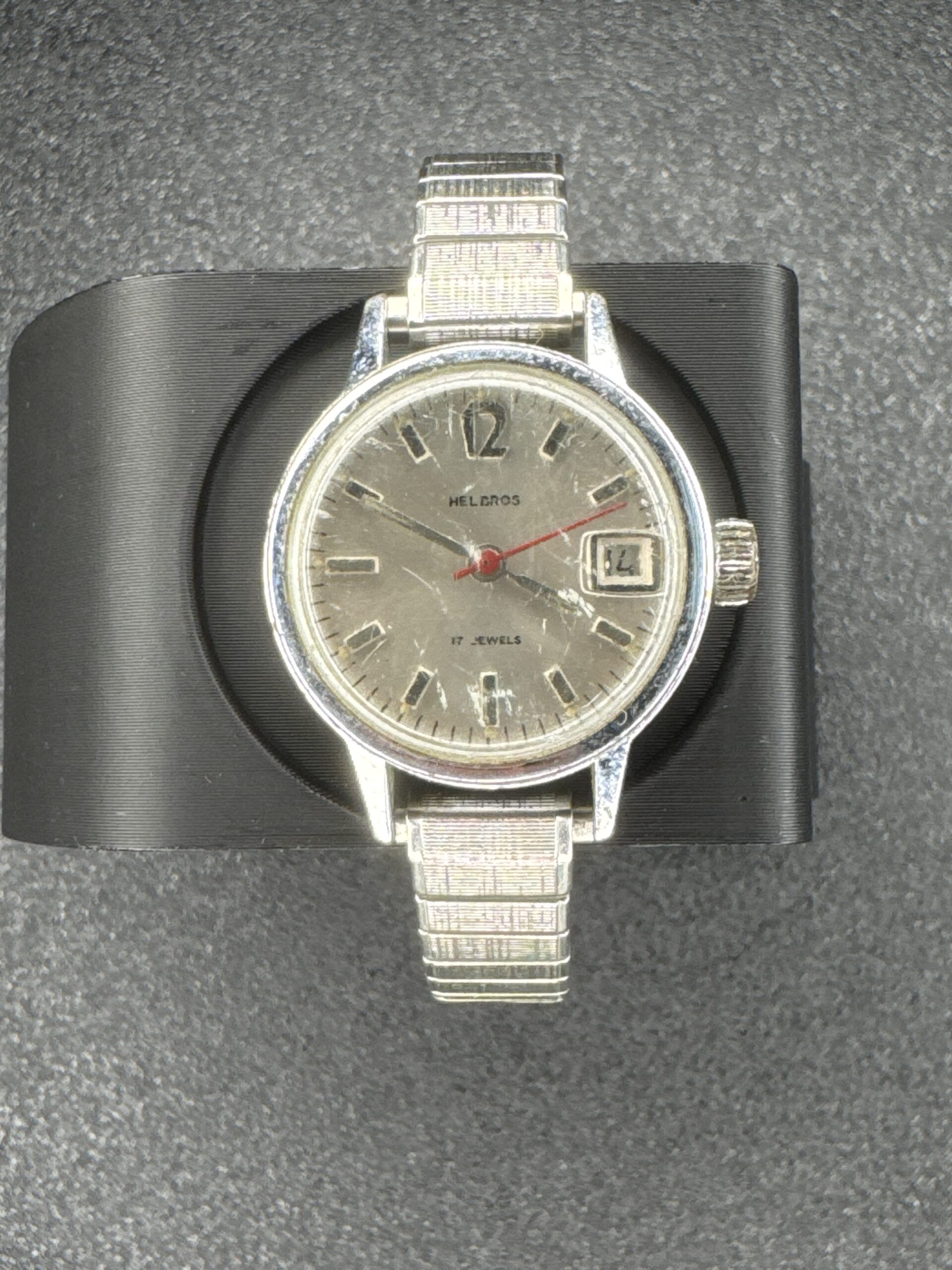 Explore this vintage Helbros 17 Jewels women’s watch with a silver dial and date function. A classic timepiece with stainless steel construction.