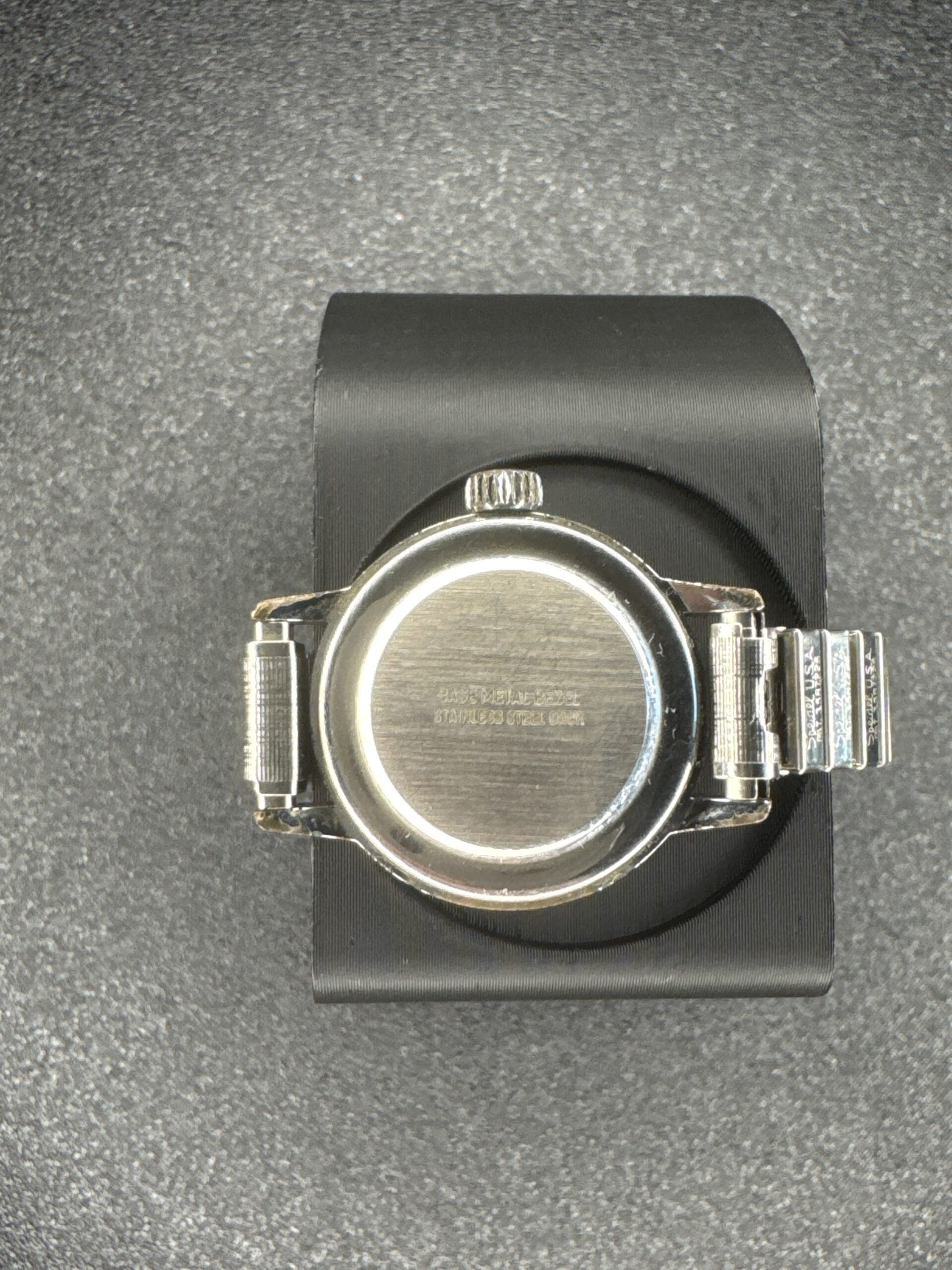This Helbros 17 Jewels women’s watch features a silver-tone dial with a date function at 3 o’clock. The dial shows signs of aging with visible scratches and wear. The hour markers and hands are silver-toned, and the second hand is red, adding a touch of contrast. The watch case and bracelet are made of stainless steel, with the bracelet showing signs of wear consistent with age. The back of the watch is marked with ‘Base Metal Bezel’ and ‘Stainless Steel Back’, indicating a sturdy construction typical of mid-20th-century watches.