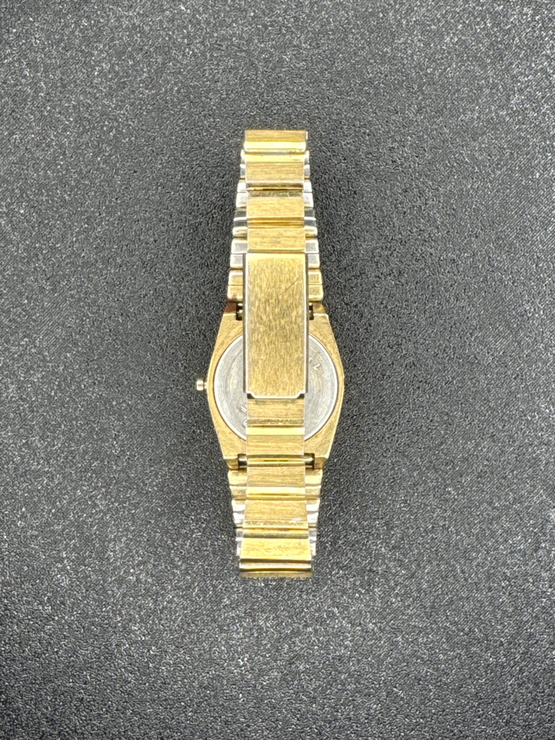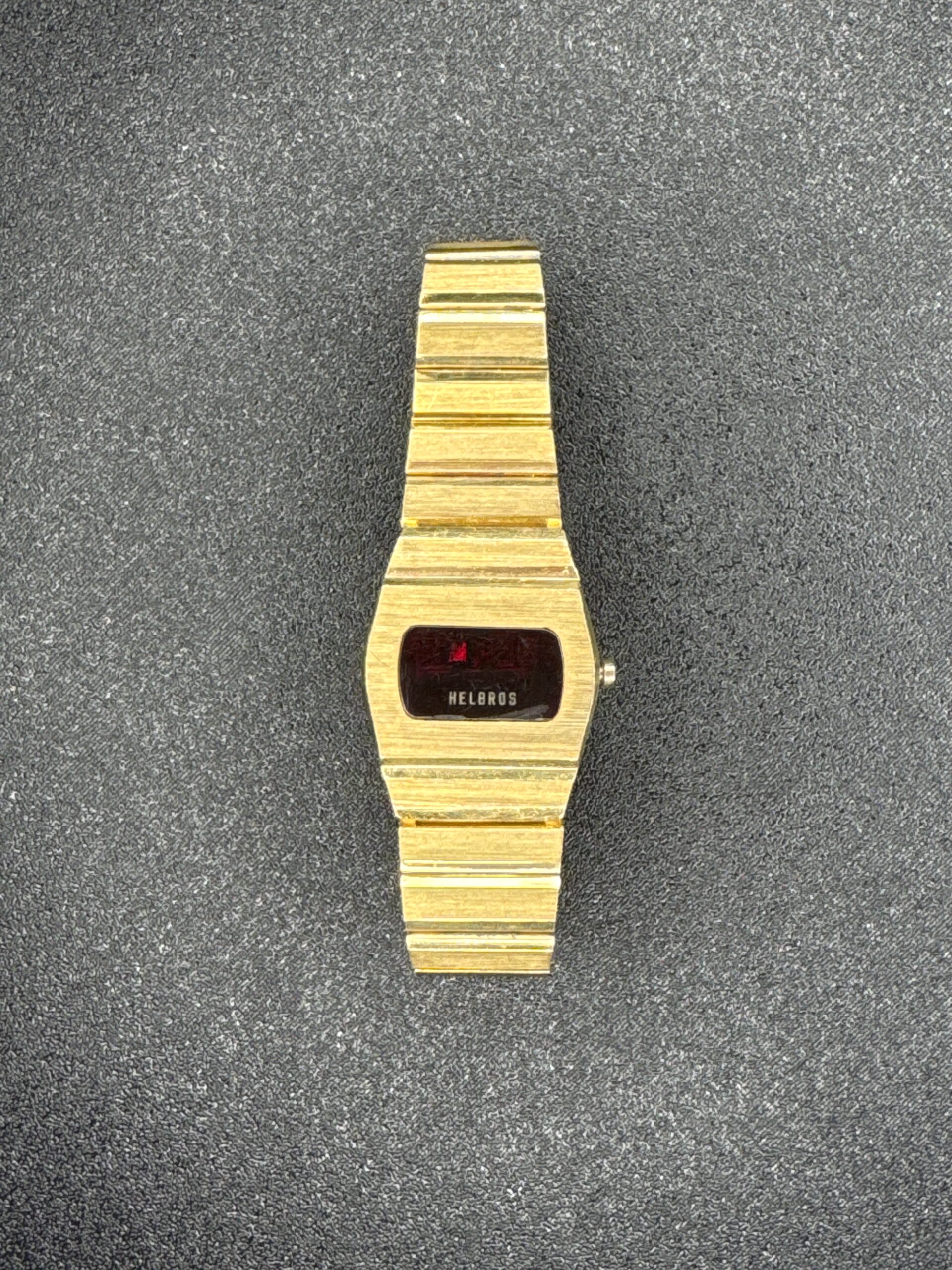 This Helbros vintage digital men’s watch features a gold-tone case and integrated bracelet. The digital display is set behind a dark, possibly red-tinted screen, characteristic of LED watches from the 1970s and 1980s. The watch has a sleek, minimalist design, typical of the era, with a single button on the side for setting the time. The back of the watch shows some wear, with visible scratches and signs of use, but the overall condition is good for its age.