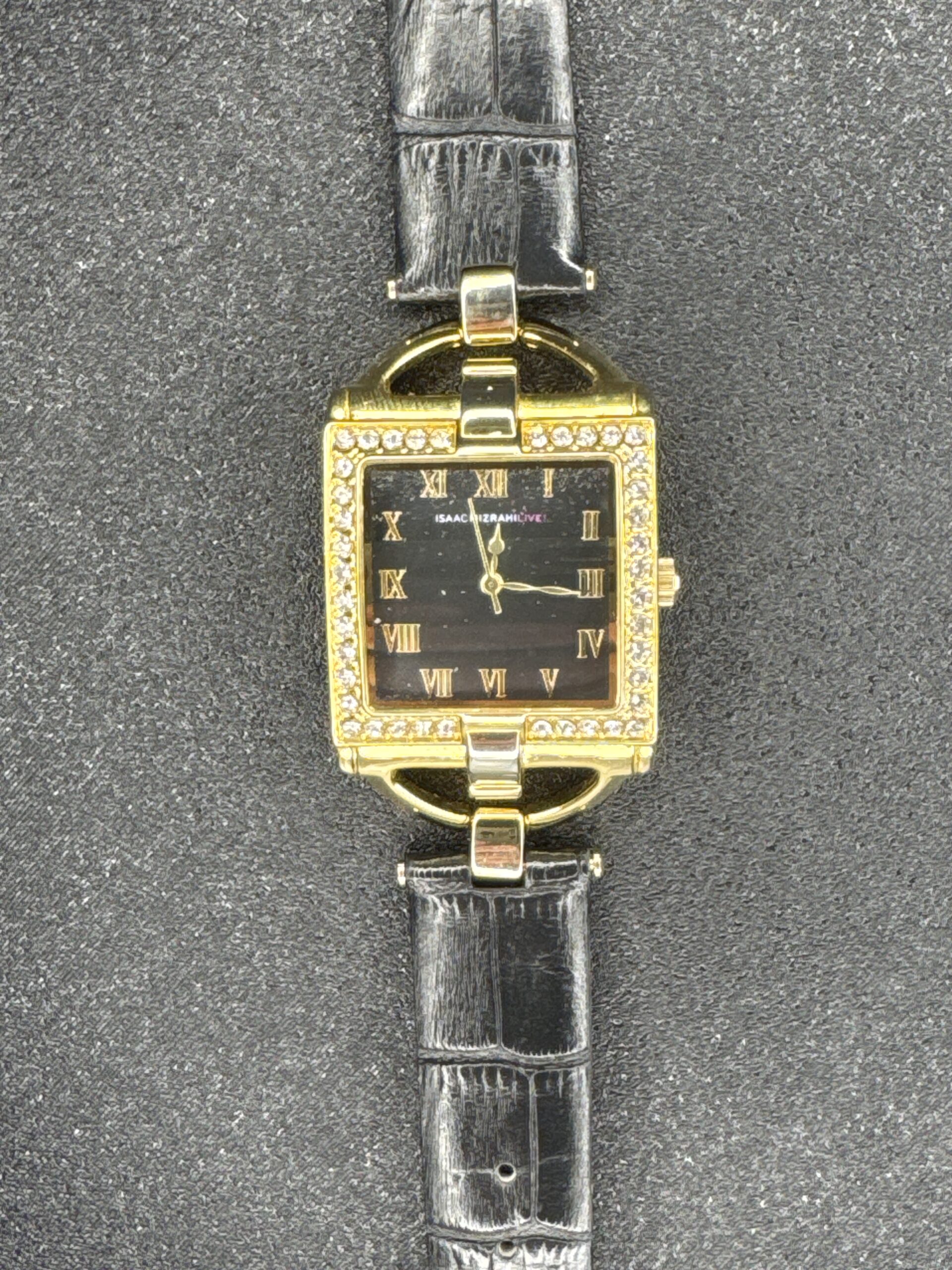 The Isaac Mizrahi Live Quartz Women’s Watch features a square gold-tone case adorned with sparkling crystals around the bezel. The black dial showcases gold Roman numeral hour markers and elegant hands. The watch is powered by a quartz movement, as indicated by the PC21 marking. The back of the watch shows a stainless steel back with ‘Isaac Mizrahi Live’ branding and mentions a Japanese movement. The strap is a black leather-like material with a textured finish.