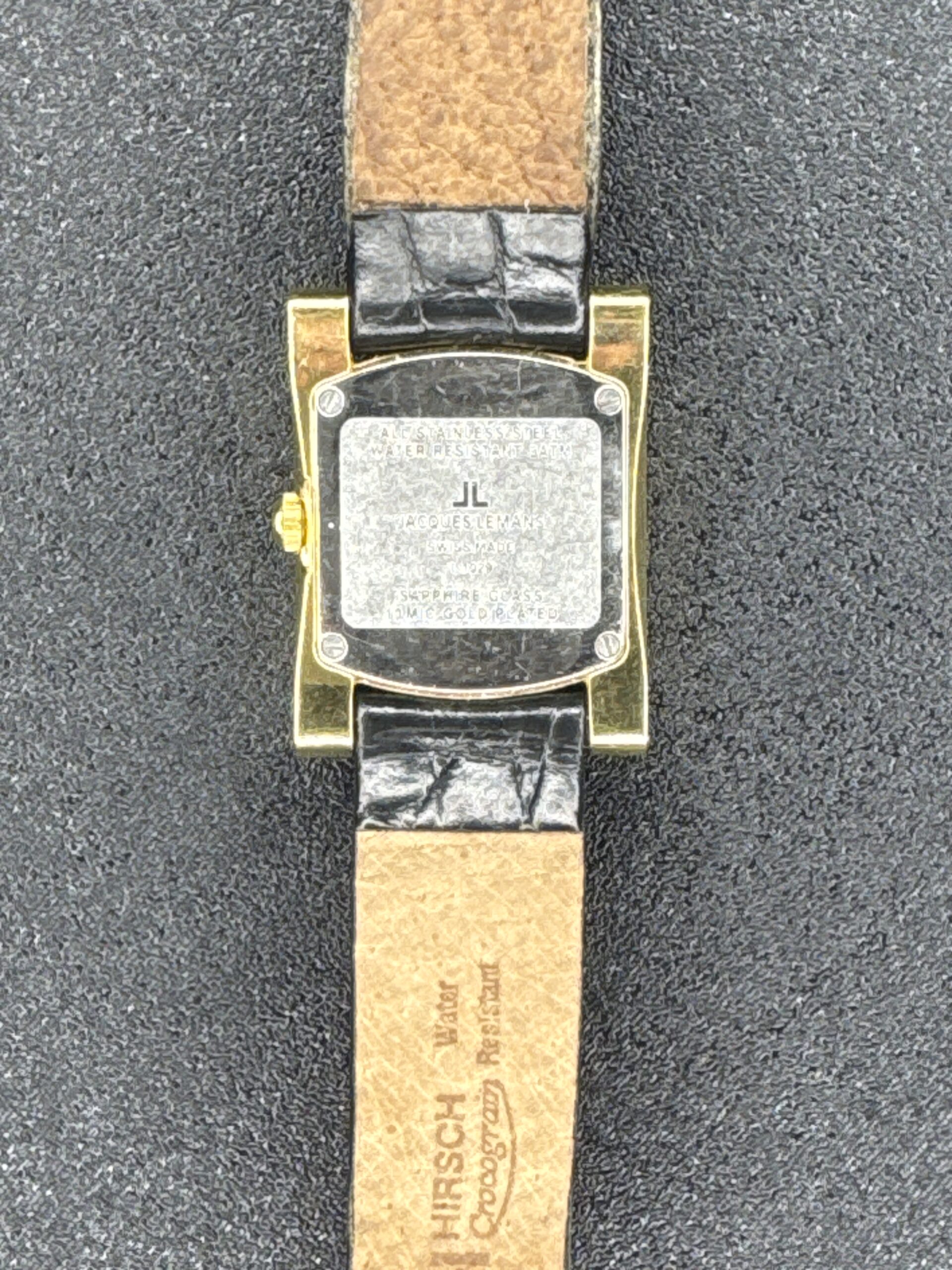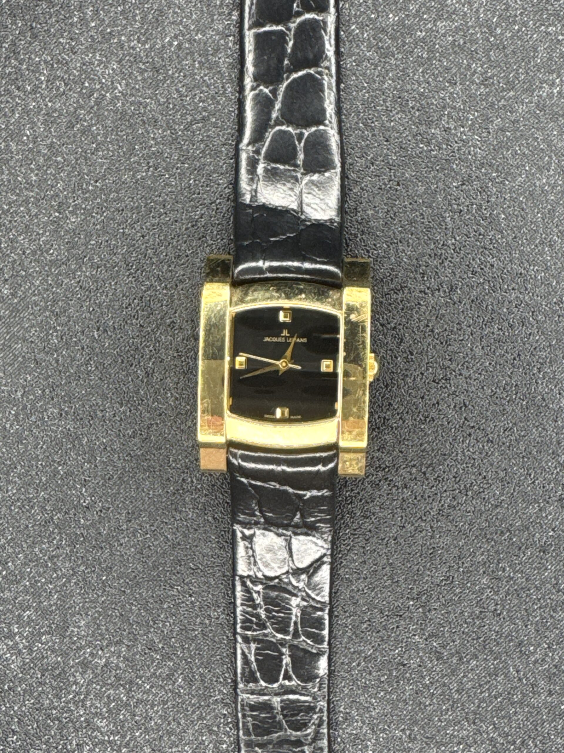 This is a Swiss-made Jacques Lemans quartz women’s watch, model 1-1029. The watch features a rectangular gold-plated case with a black dial and minimalist square hour markers. The hands are gold-toned, complementing the case. The strap is a black leather band with a crocodile pattern, adding a touch of elegance. The back of the watch is stainless steel, marked with the brand and model details, and indicates water resistance. The watch is in fair condition with visible signs of wear, particularly on the case and strap.