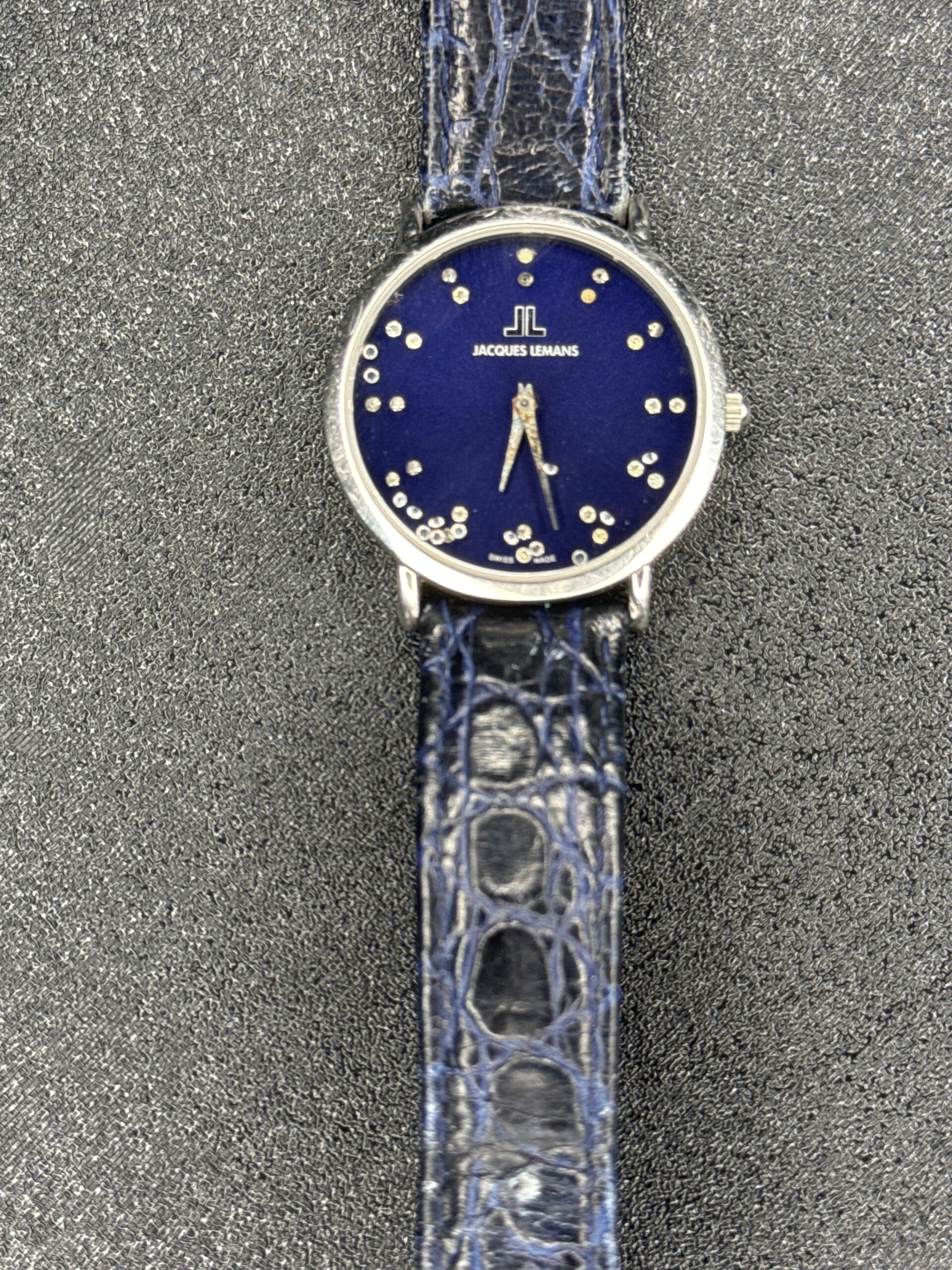 This Jacques Lemans Swiss Made women’s watch features a striking blue dial adorned with scattered jewels, adding a touch of elegance and sparkle. The watch has a simple two-hand movement and a polished stainless steel case. The strap is a blue crocodile-patterned leather, complementing the overall design. The back of the watch is engraved with the brand’s logo and details, including ‘Swiss Made’, ‘Stainless Steel’, ‘Water Resistant’, and ‘Anti-Scratch’.