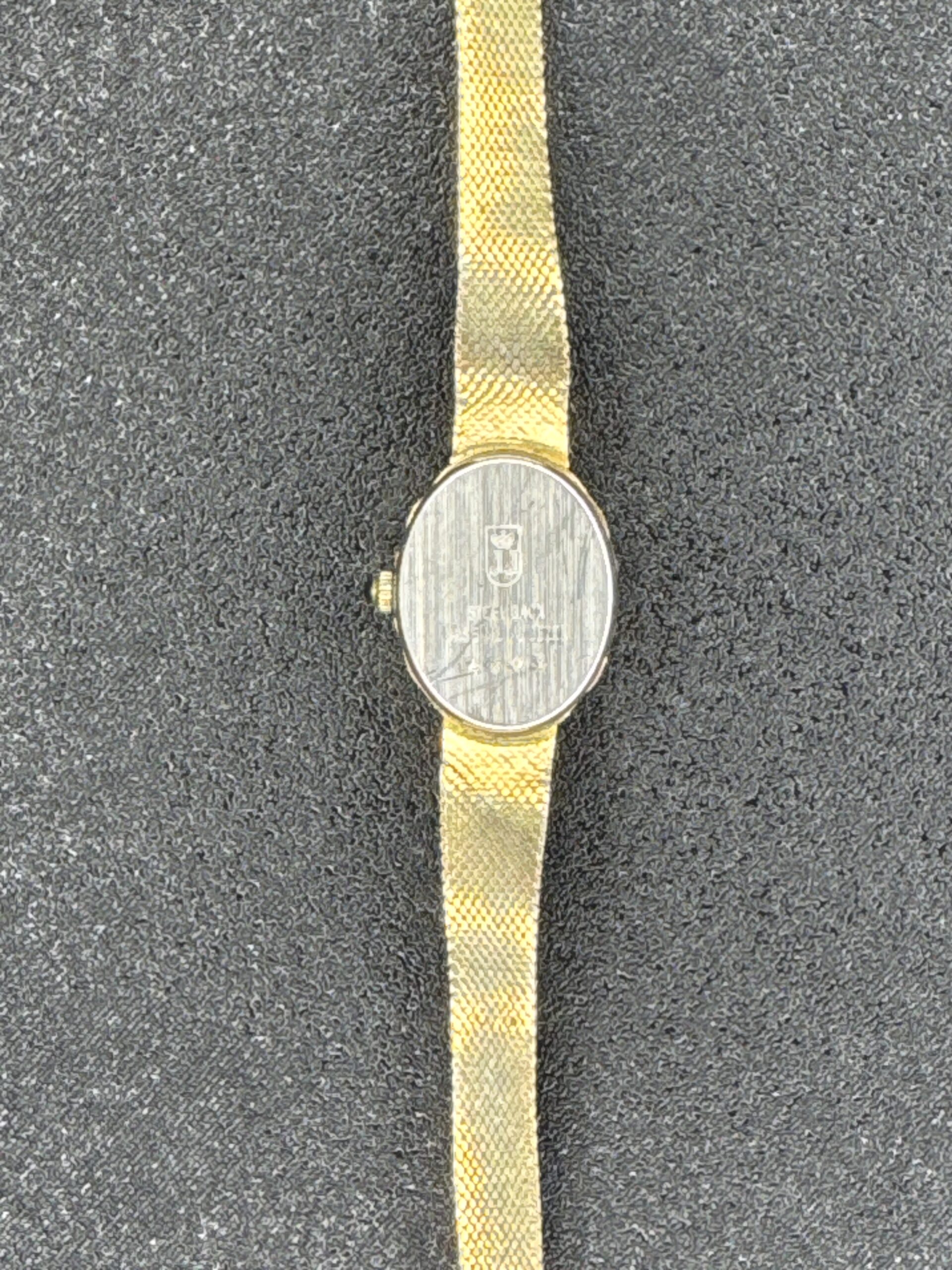 This is a Jules Jurgensen quartz women’s watch, model 4603. The watch features a gold-tone case and bracelet with a textured finish. The dial is elegantly designed with gold hour markers and hands, complemented by decorative elements at the top and bottom of the case. The back of the watch is marked with the Jules Jurgensen logo and ‘Swiss Made’, indicating its origin. The watch is powered by a quartz movement, ensuring accurate timekeeping. The overall condition shows signs of wear, with some scratches and discoloration on the bracelet and case.