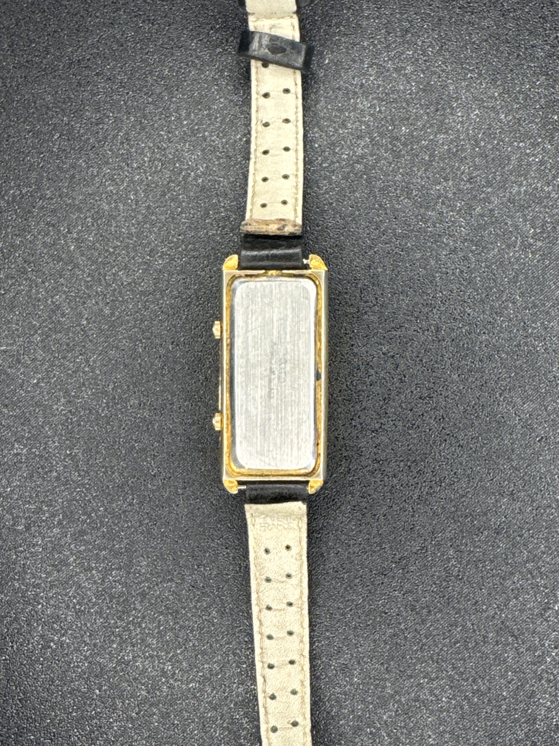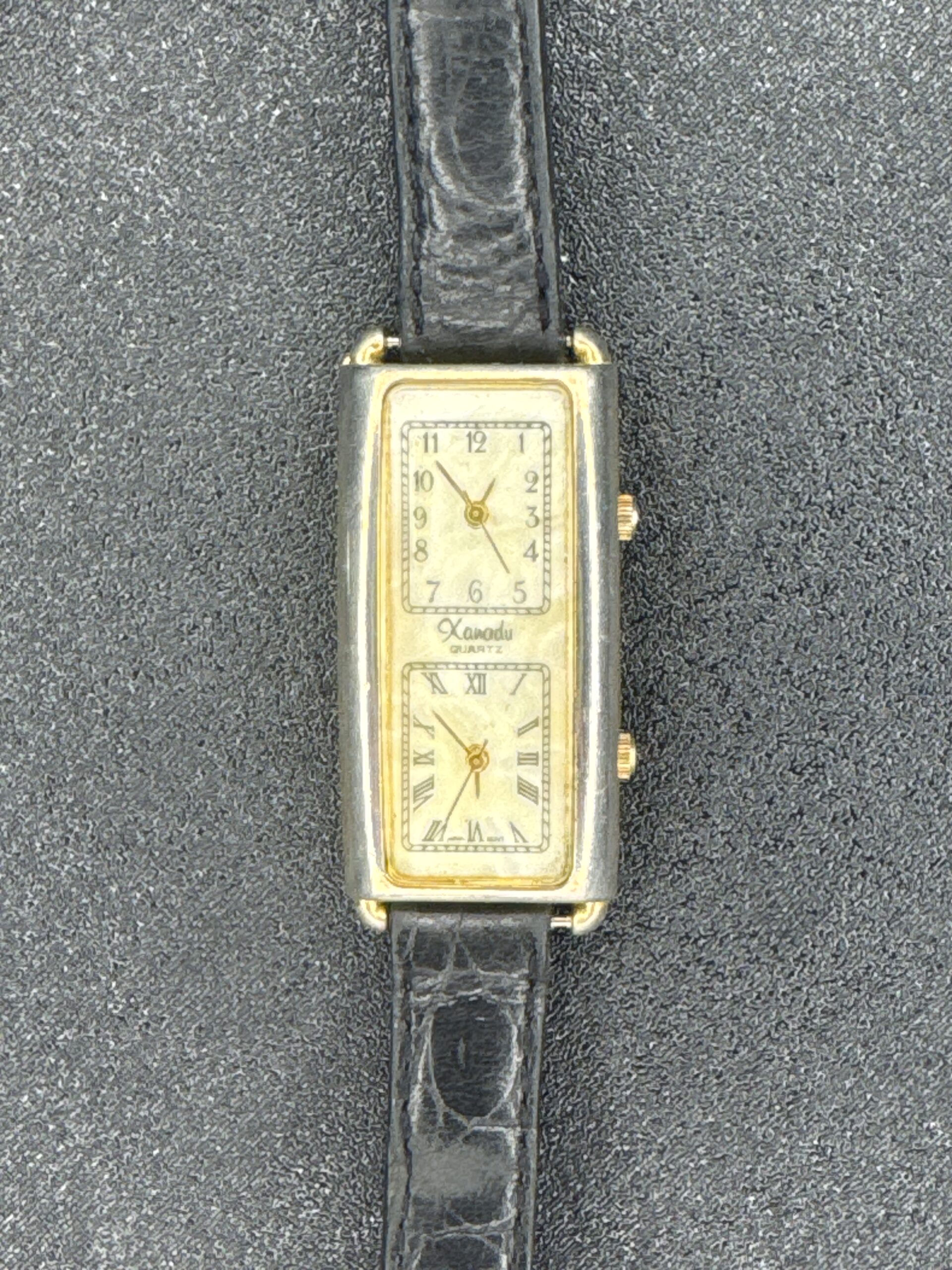 The Kamadu Quartz Dual Chrono features a unique dual-dial design, allowing for two separate time displays. The rectangular case is crafted with a combination of gold and silver tones, giving it a distinctive look. The upper dial displays Arabic numerals, while the lower dial features Roman numerals, adding a classic touch. The watch is equipped with a black leather band that shows signs of wear, particularly on the inner side. The back of the watch is plain, with a brushed finish.