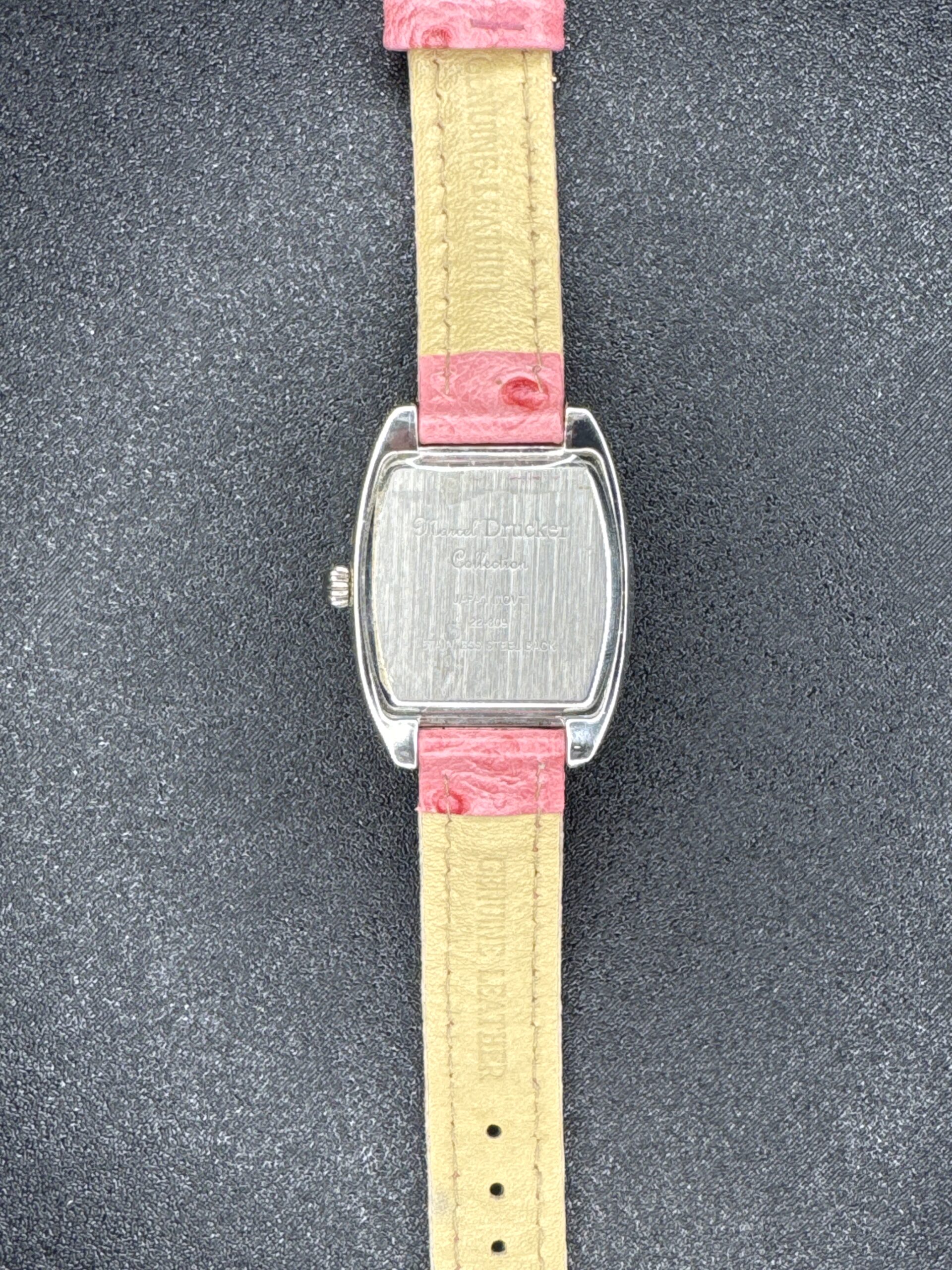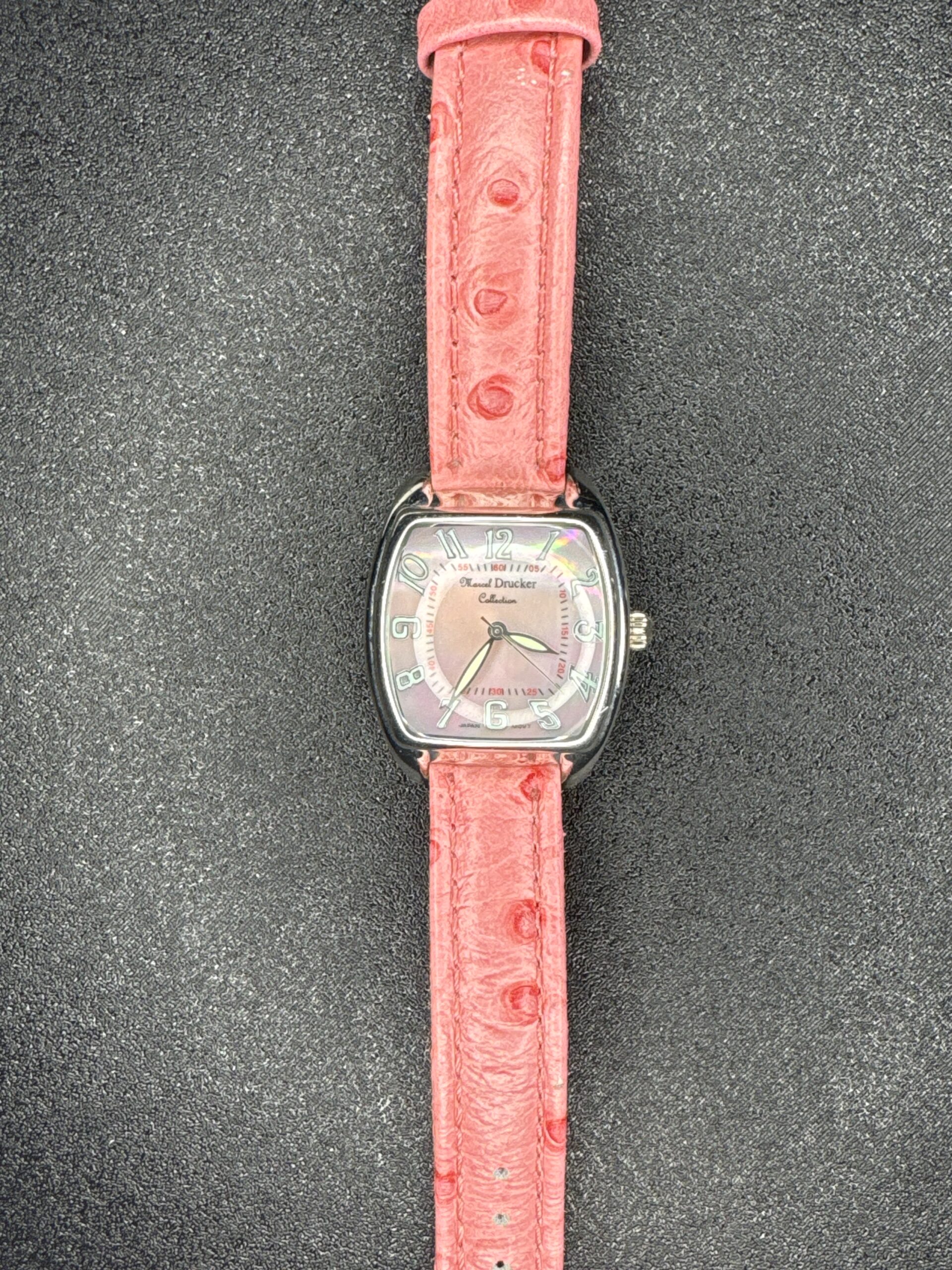 The Marcel Drucker Quartz Women’s Watch model 22-309 features a distinctive pink dial with large, easy-to-read Arabic numerals. The watch has a polished silver-tone case and a matching pink leather strap with an embossed texture. The back of the watch is stainless steel, engraved with the brand name and model details. The watch is powered by a quartz movement, ensuring accurate timekeeping. The overall condition is good with minor signs of wear on the strap and case.