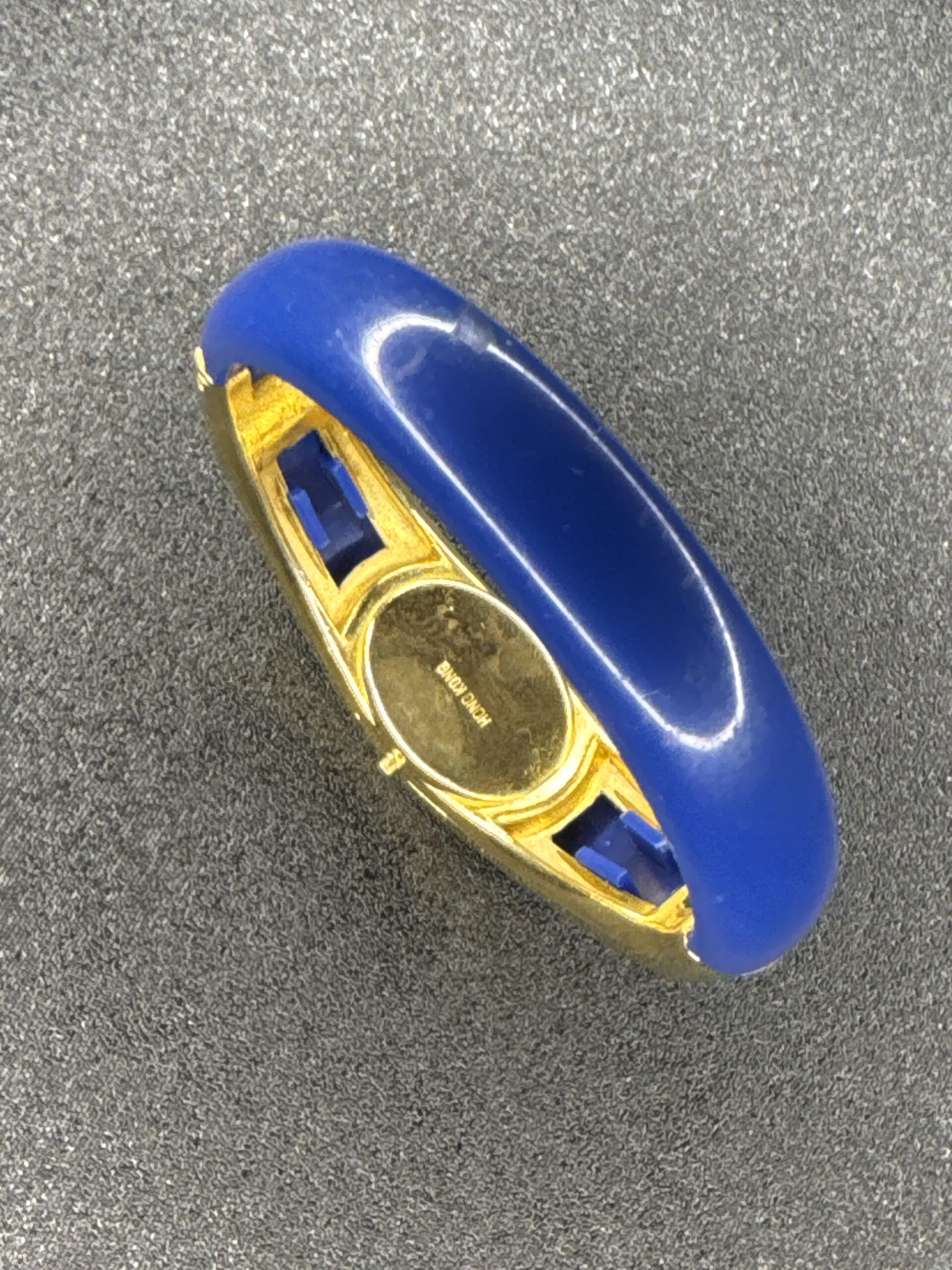The Medana LCD Quartz Women’s Bracelet Watch features a distinctive blue and gold design. The digital display is set within a gold-tone case, complemented by a blue bracelet-style band. The watch’s design is both stylish and functional, suitable for casual and semi-formal wear. The back of the watch shows signs of wear, with some fading on the gold-tone finish.