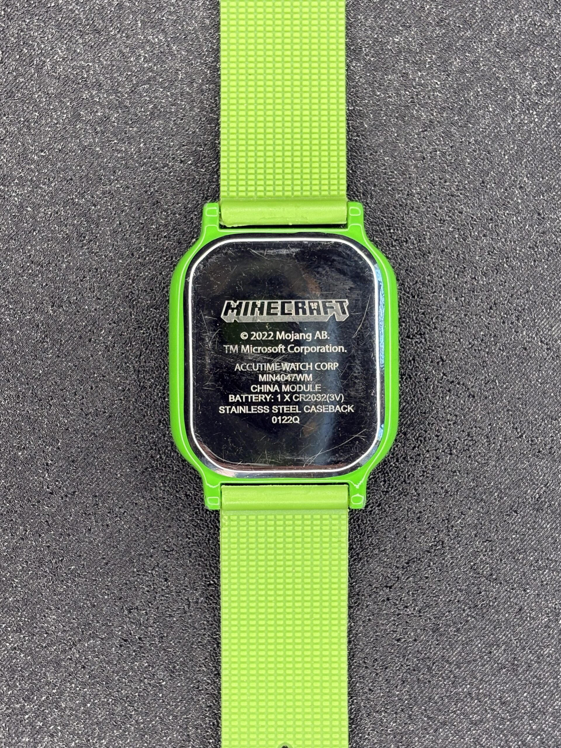 This vibrant Minecraft-themed digital watch features a striking green strap decorated with iconic Creeper faces, TNT blocks, and pixelated swords. The black digital display prominently showcases the Minecraft logo and a Creeper face, creating a cohesive and playful design. The caseback is crafted from stainless steel, ensuring durability, and is engraved with the Minecraft logo, copyright information, and model details. Powered by a reliable CR2032 battery, this watch is as functional as it is fun.
