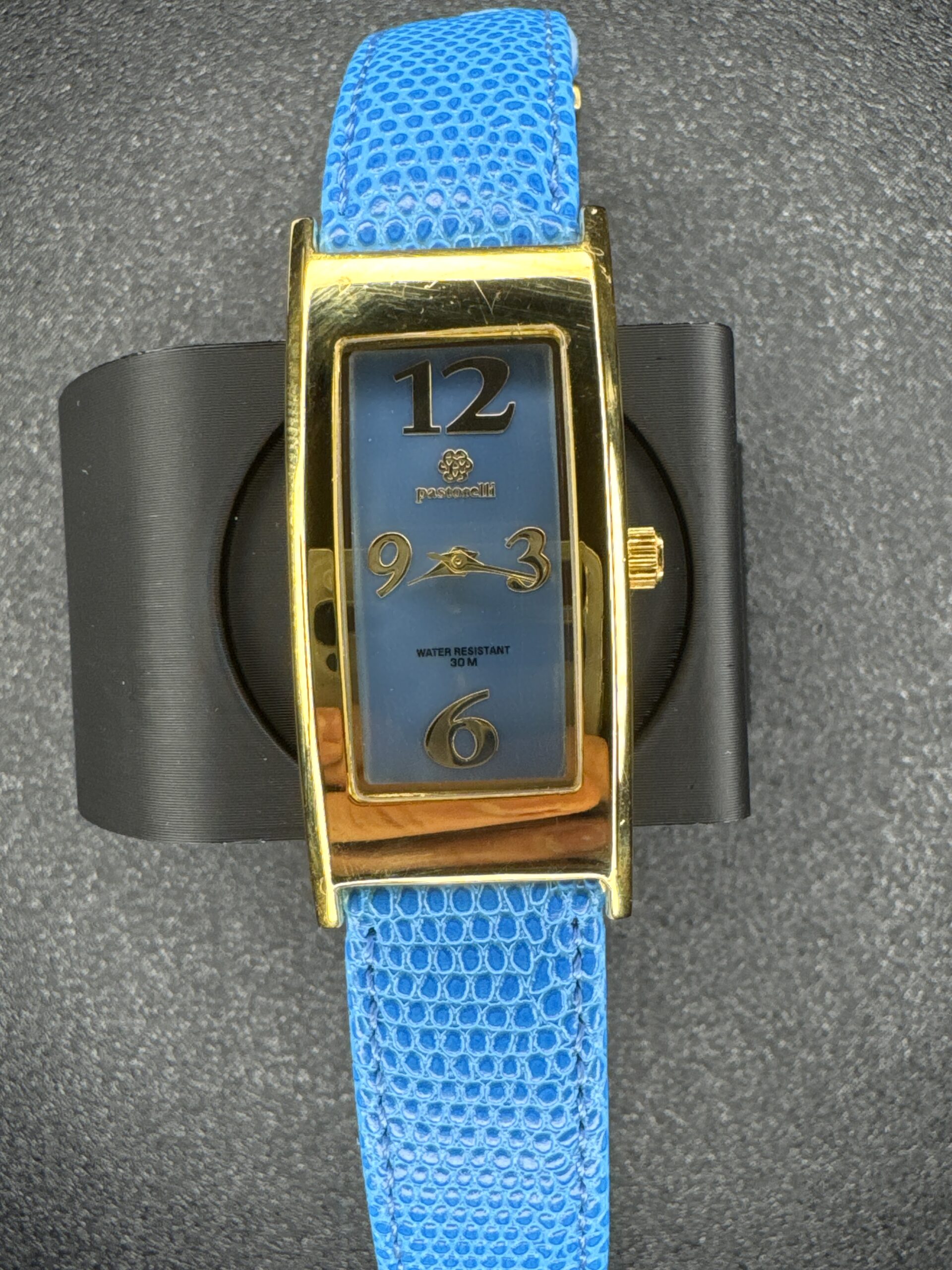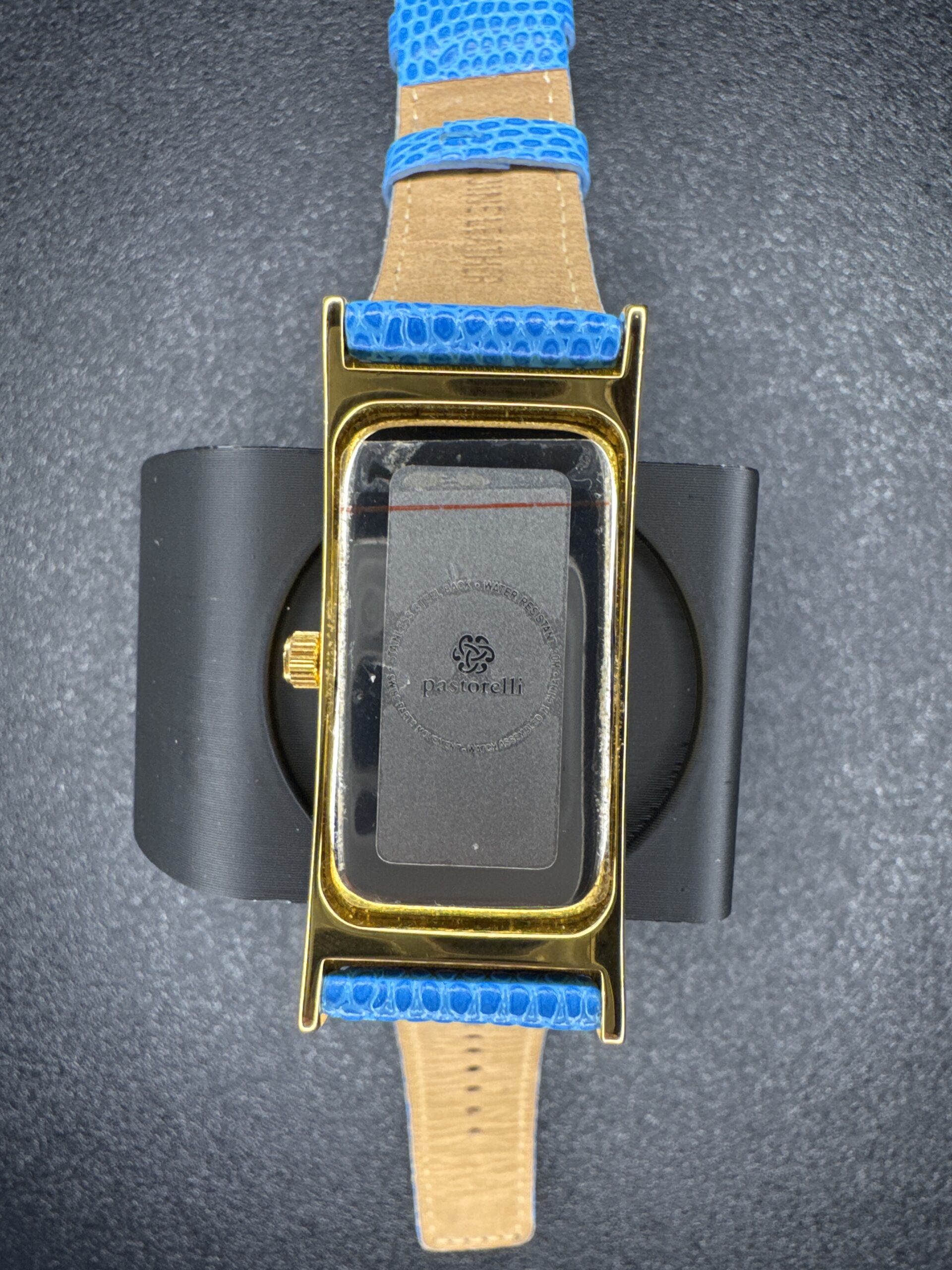The Pastorelli women’s watch features a distinctive two-tone design with a blue and gold color scheme. The rectangular case is gold-toned, complementing the blue dial that displays large Arabic numerals at 12, 3, 6, and 9 o’clock. The watch is water-resistant up to 30 meters, as indicated on the dial. The strap is a textured blue leather, adding a vibrant touch to the overall aesthetic. The back of the watch is marked with the Pastorelli logo, reinforcing its brand identity.