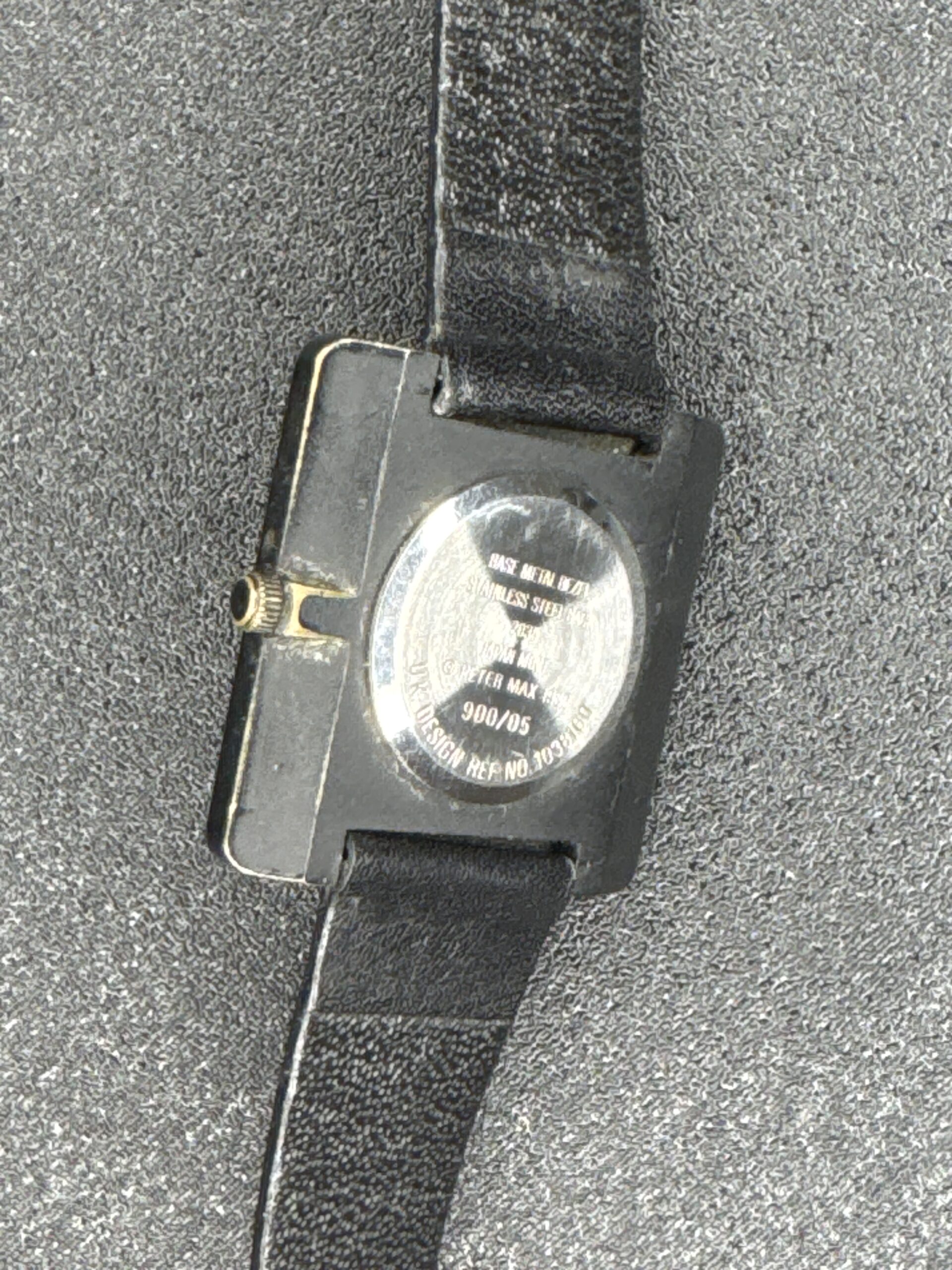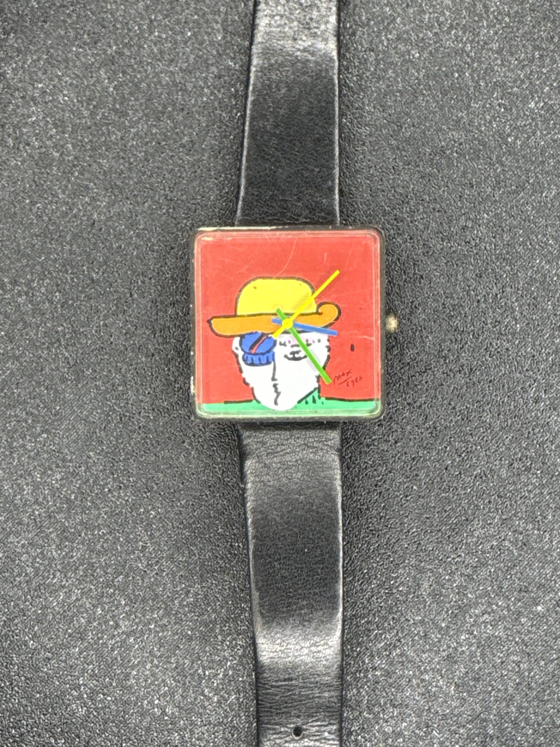 This unique women’s watch features a vibrant, artistic dial designed by Peter Max, showcasing his signature colorful style. The square case is complemented by a simple black leather strap. The back of the watch indicates the model number 900/05 and includes details about the stainless steel back. The watch’s design is a reflection of the 1980s pop art movement.