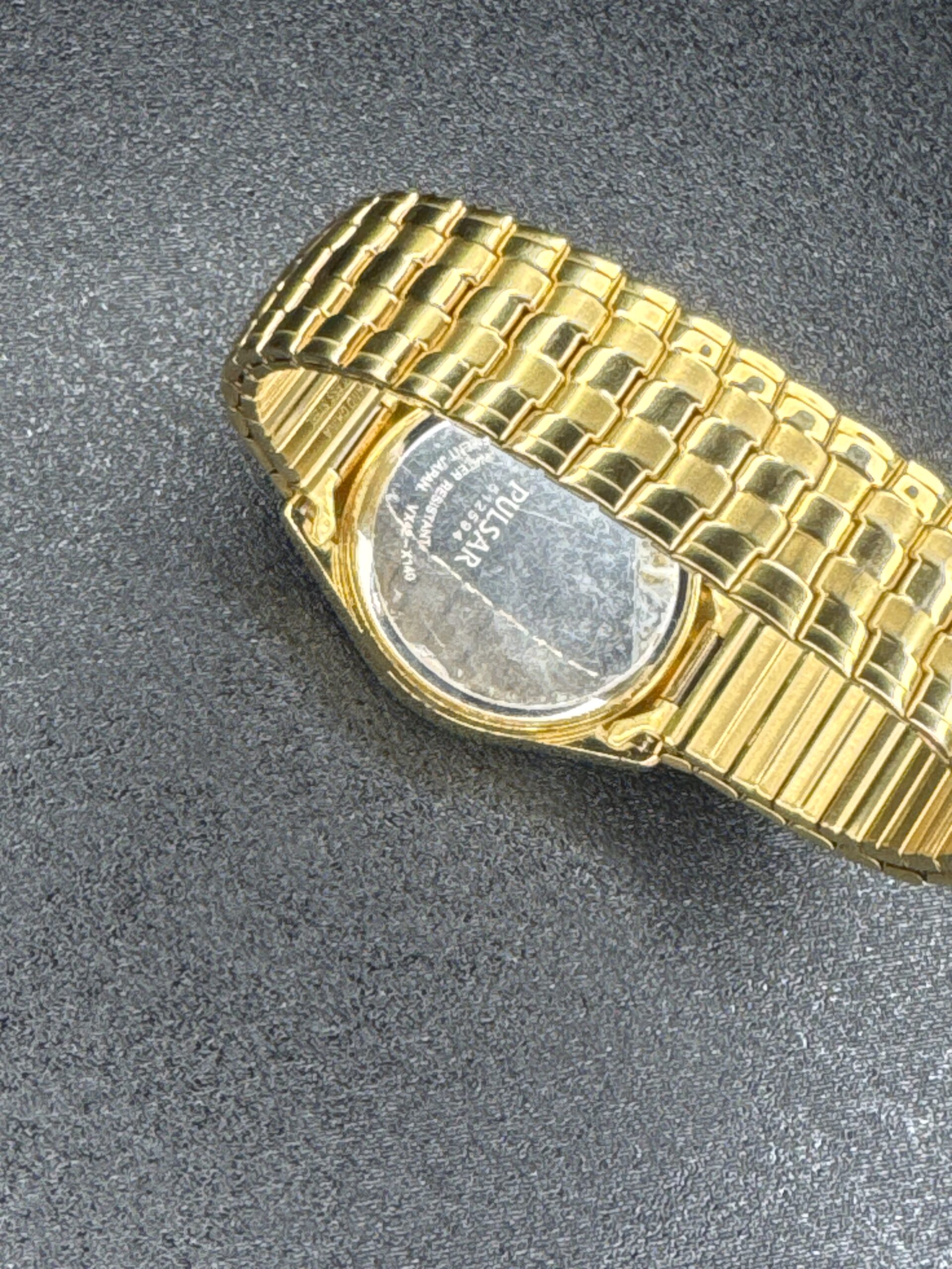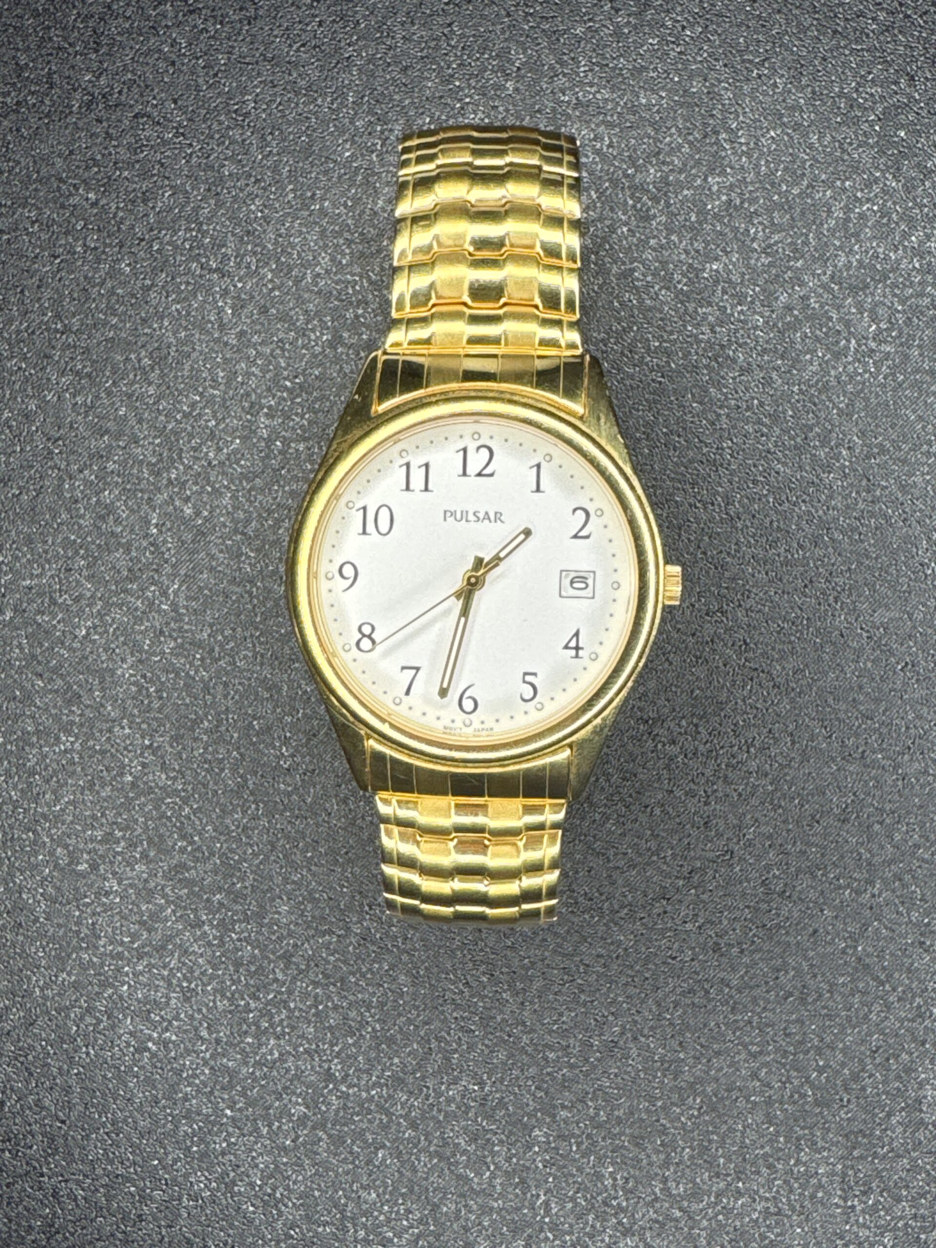 The Pulsar Two Tone Date Men’s Watch features a classic design with a gold-tone stainless steel case and bracelet. The watch has a white dial with black Arabic numerals and a date window at the 3 o’clock position. The gold-tone hands complement the overall aesthetic. The back of the watch shows signs of wear with visible scratches, indicating regular use.