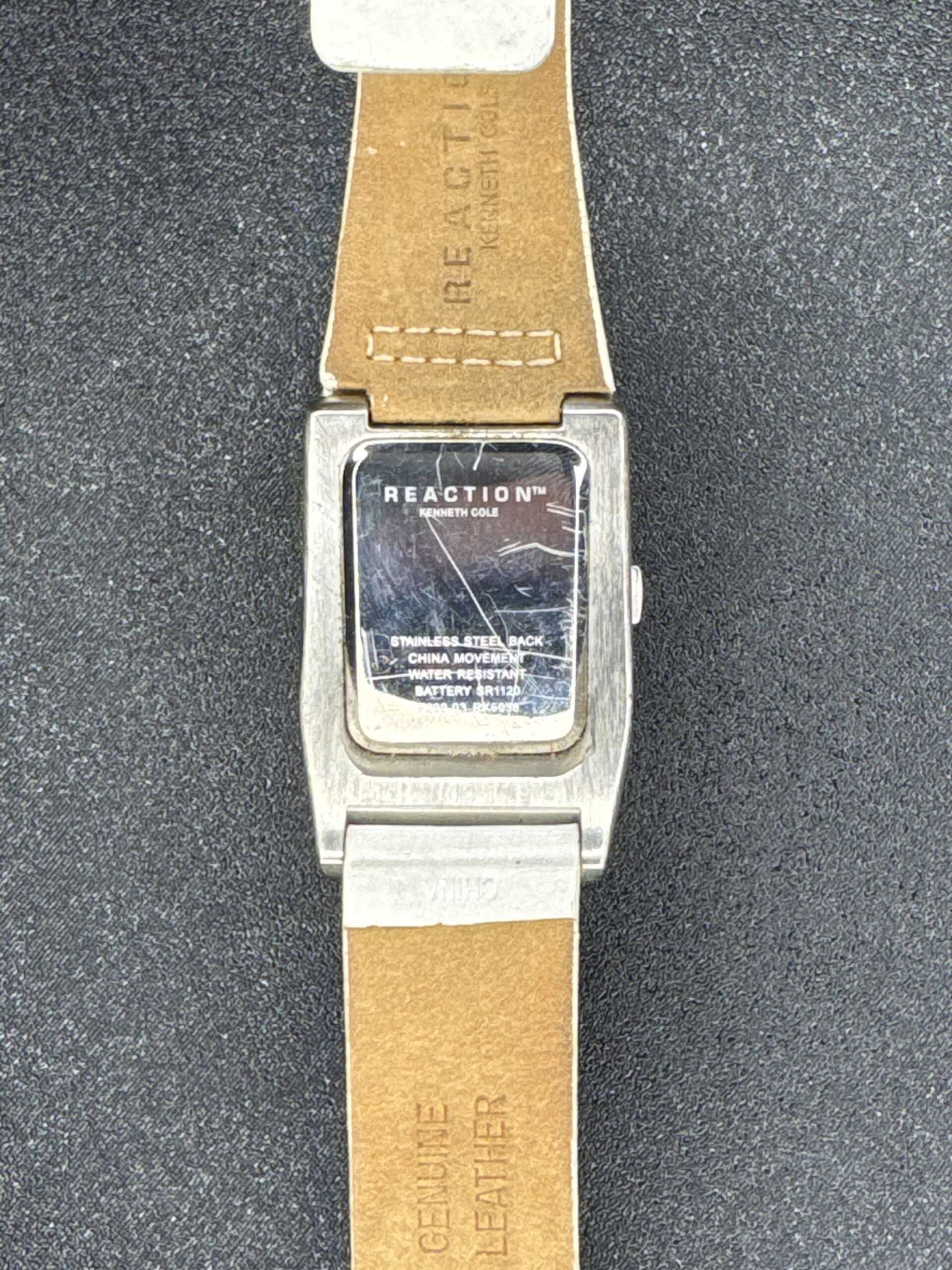 The Reaction Kenneth Cole Digital Watch F299-03 features a minimalist digital display encased in a rectangular stainless steel frame. The watch has a white leather strap, which shows signs of wear and discoloration. The back of the case is stainless steel, marked with ‘Reaction Kenneth Cole’ and details about its water resistance and battery type. The watch has a simple, modern design suitable for casual wear.