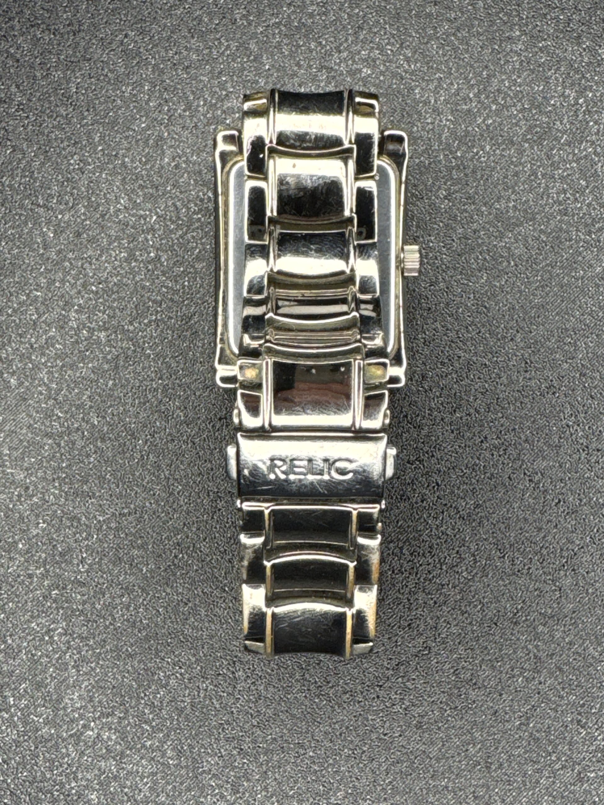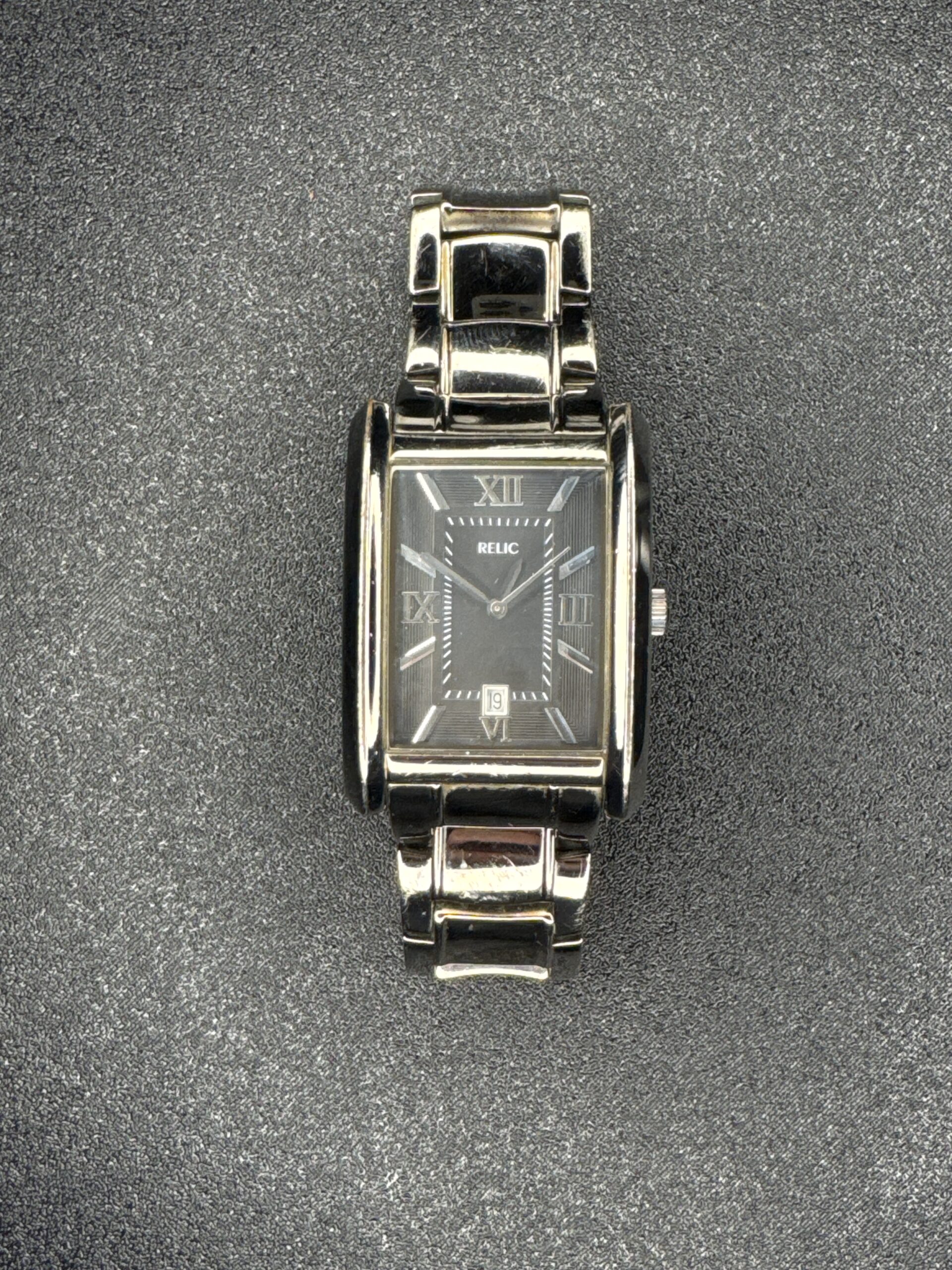 The Relic Date Quartz Men’s Watch ZR77 features a rectangular stainless steel case and bracelet. The black dial includes Roman numeral hour markers and a date window at 6 o’clock. The watch has a polished finish, adding to its classic appeal. The back of the watch shows the Relic branding on the bracelet clasp.