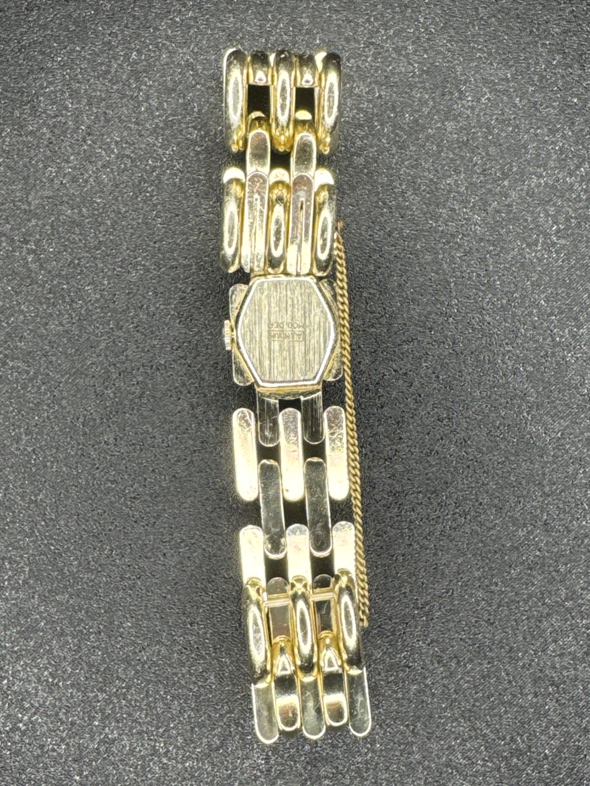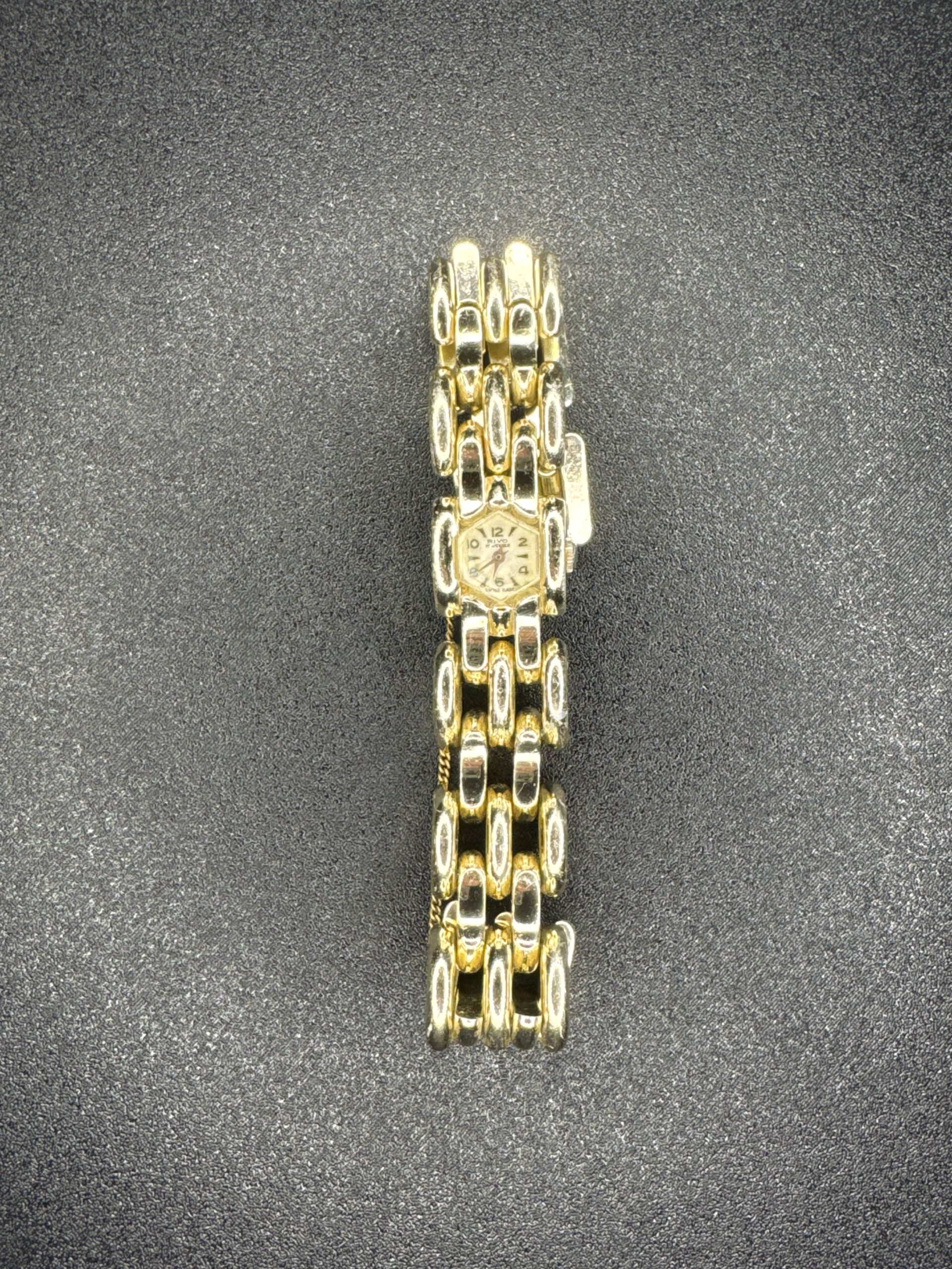 This Rico 17 Jewels Swiss women’s watch features a small, elegant round case with a gold-tone finish. The dial is minimalist with simple hour markers and hands, maintaining a classic aesthetic. The watch is powered by a 17-jewel mechanical movement, indicative of quality craftsmanship. The bracelet is a unique linked design, also in a matching gold-tone, adding to its vintage charm. The back of the watch shows some signs of wear, typical for its age, but overall the piece is in good condition.