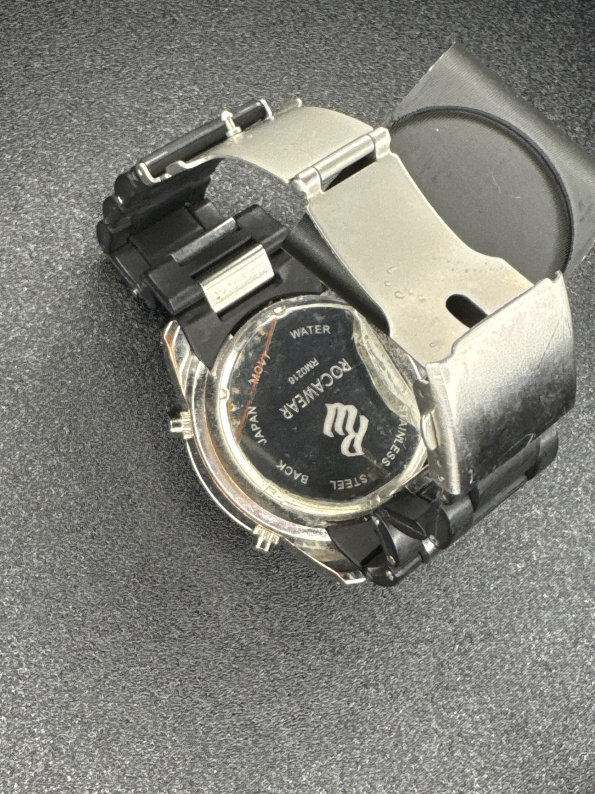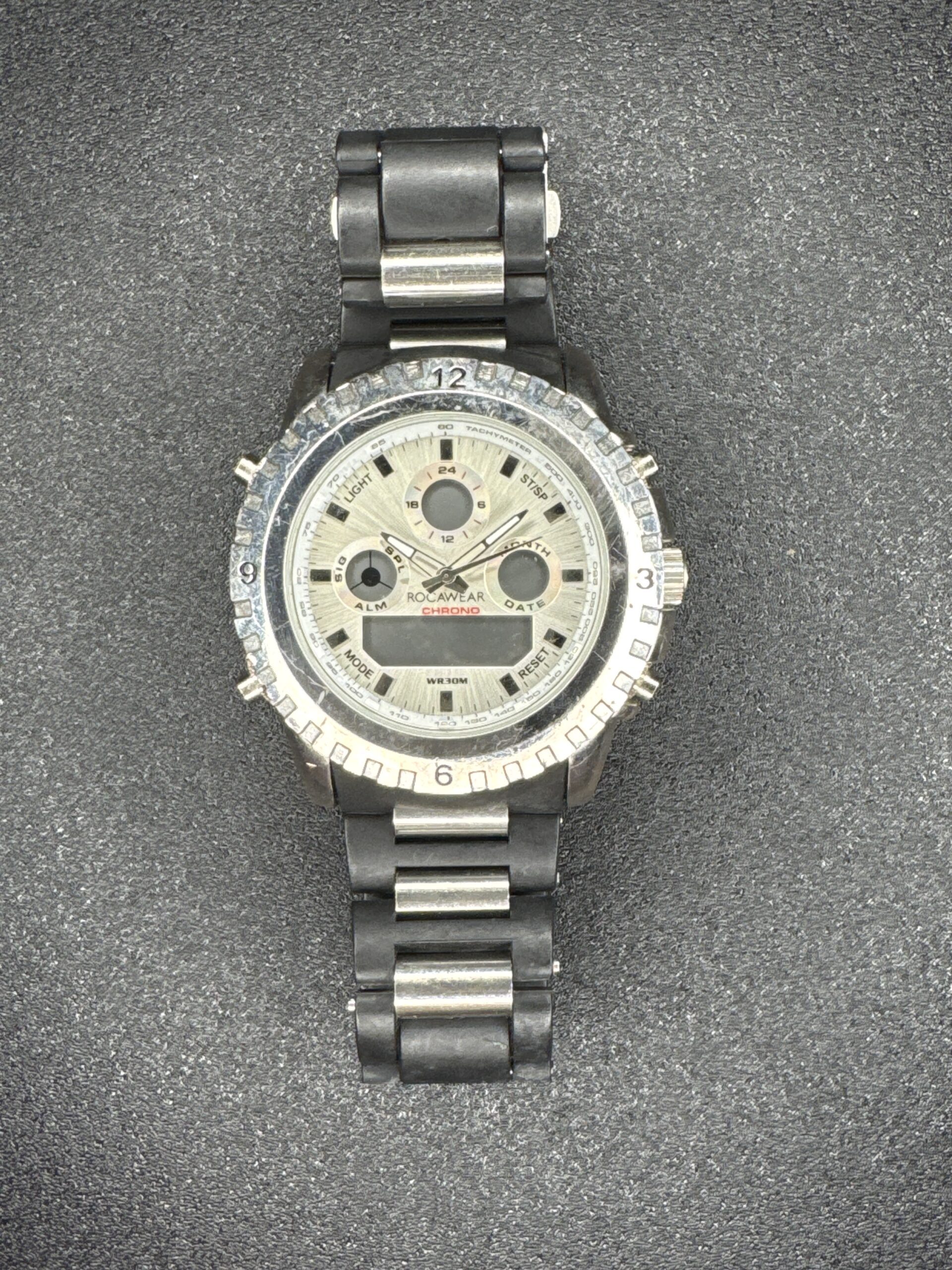 & Free ShippingExplore the Rocawear Chrono Men’s Duel Digital Watch RM0216, featuring dual-display, stainless steel construction, and Japanese movement.