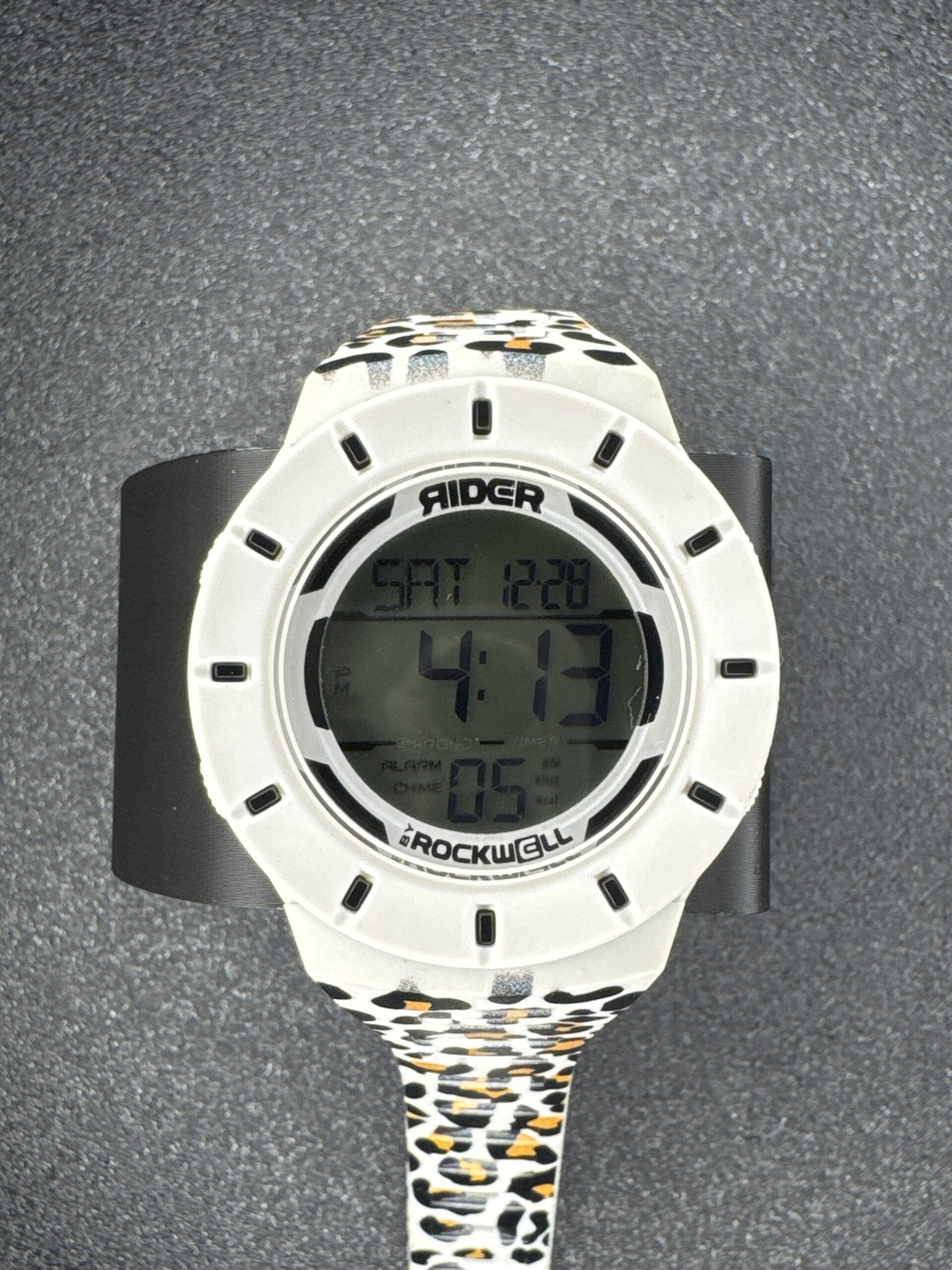 Explore the Rockwell White Digital Women’s Watch, Coliseum Edition, featuring a digital display, leopard print strap, and water-resistant design.