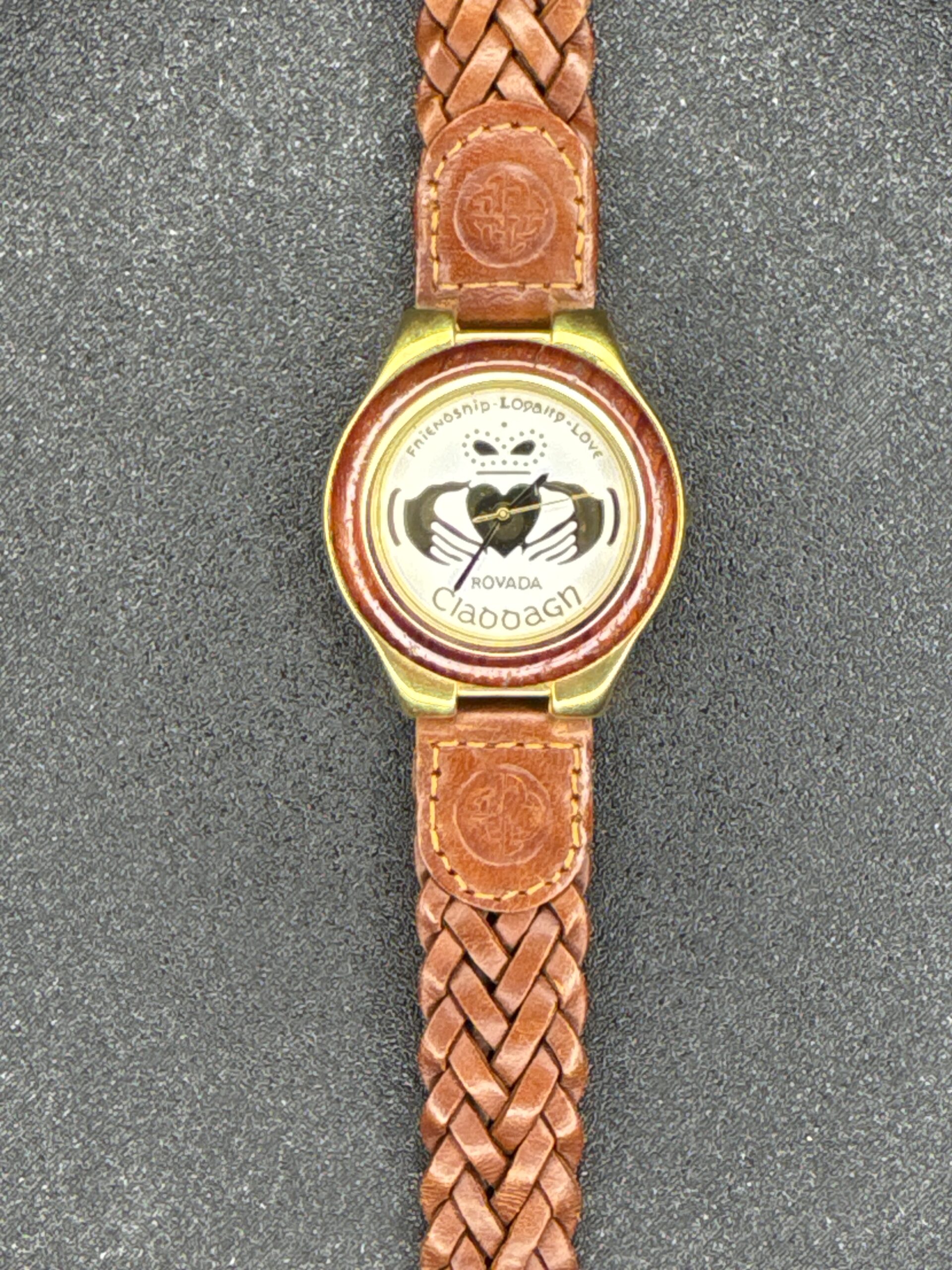 The Rovada Friendship Quartz Women’s Watch features a unique Claddagh design on the dial, symbolizing friendship, loyalty, and love. The watch has a gold-tone case and a braided leather strap, adding a rustic charm. The dial includes the words ‘Friendship, Loyalty, Love’ and showcases two hands holding a crowned heart. The back of the watch is marked with ‘Rovada’ and ‘Quartz, Stainless Steel Back, Assembled in China, Japan Movement’. The watch is in good condition with minor wear on the strap and case.